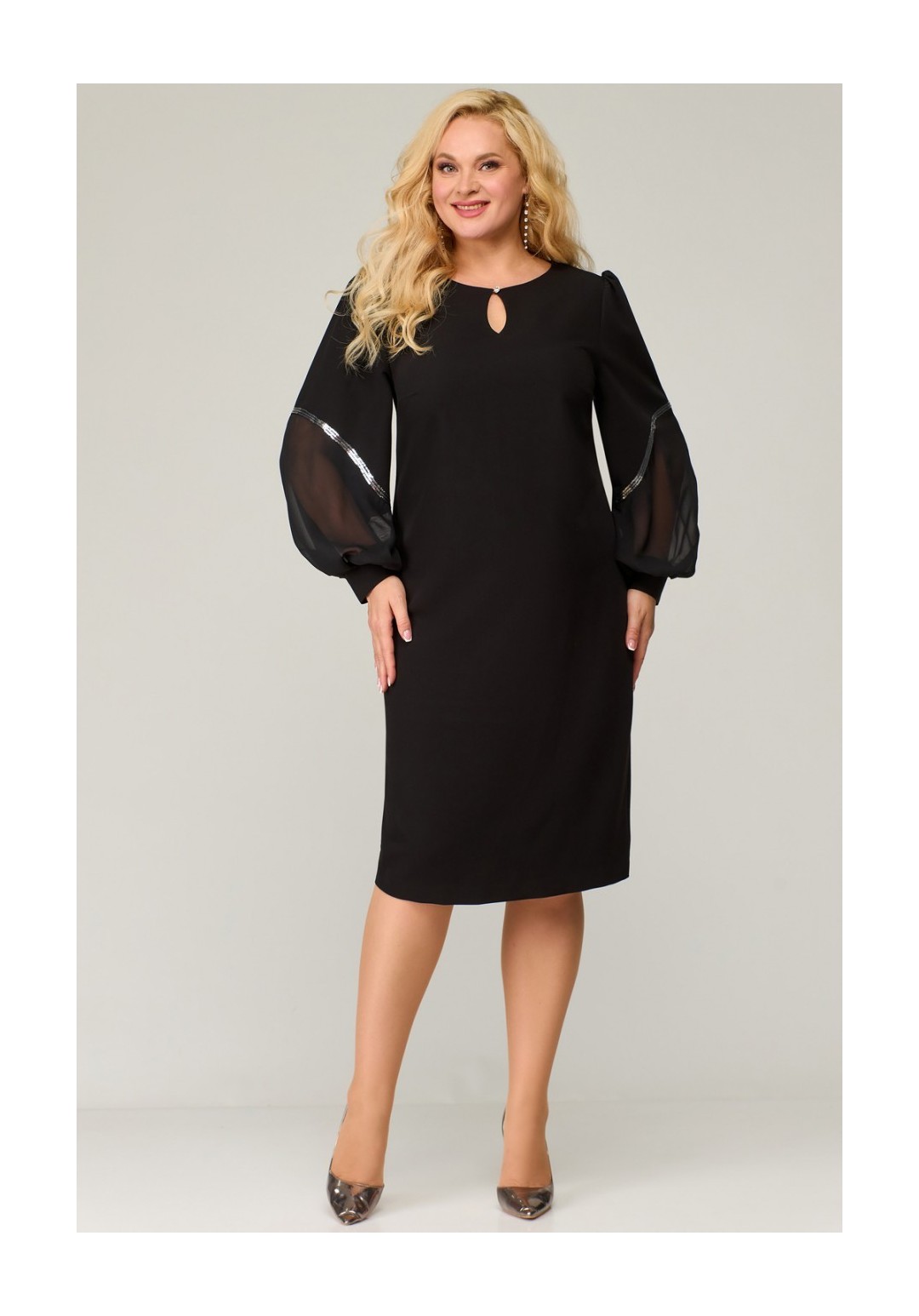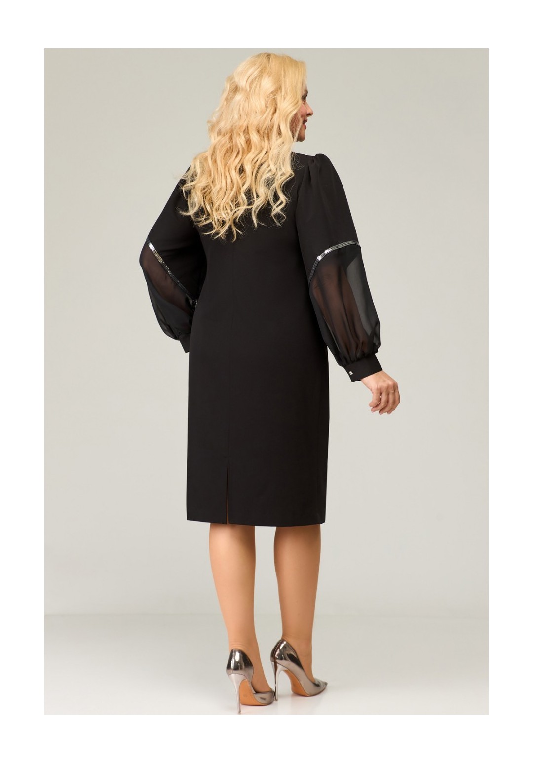 Платье женское полуприлегающего силуэта, слегка зауженное к низу с втачным рукавом. Горловина округлой формы с застежкой капелькой по переду. По линии груди переда вытачки. Спинка со средним швом и разрезом по низу. Рукав объемной формы состоит из двух деталей и декорирован тесьмой из пайеток. В верхней части рукава сборка. Нижний срез рукава присборен и обработан притачной манжетой с застежкой на петлю и пуговицу. Фурнитура (пуговицы) может меняться от наличия. Длина платья по спинке: 102 см Длина рукава: 62 см
