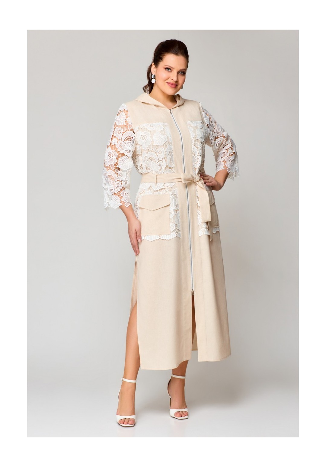 Длинное платье – пальто без подкладки с втачными рукавами длиной ¾. Застежка центральная на молнию. По горловине капюшон. Спереди накладные карманы с клапаном. По линии талии пояс в тон ткани. В боковых швах обработаны разрезы. Кружево может меняться от наличия.