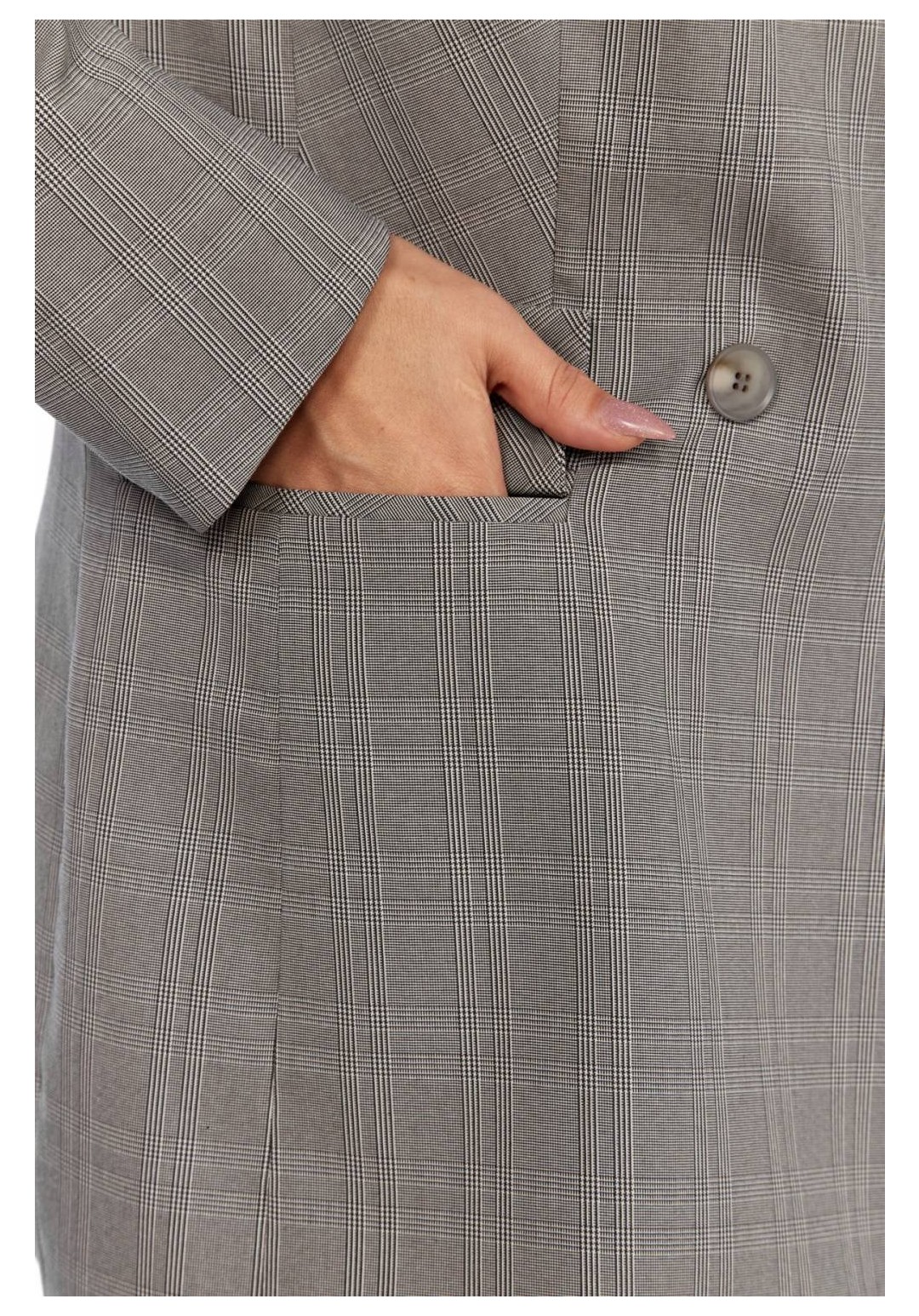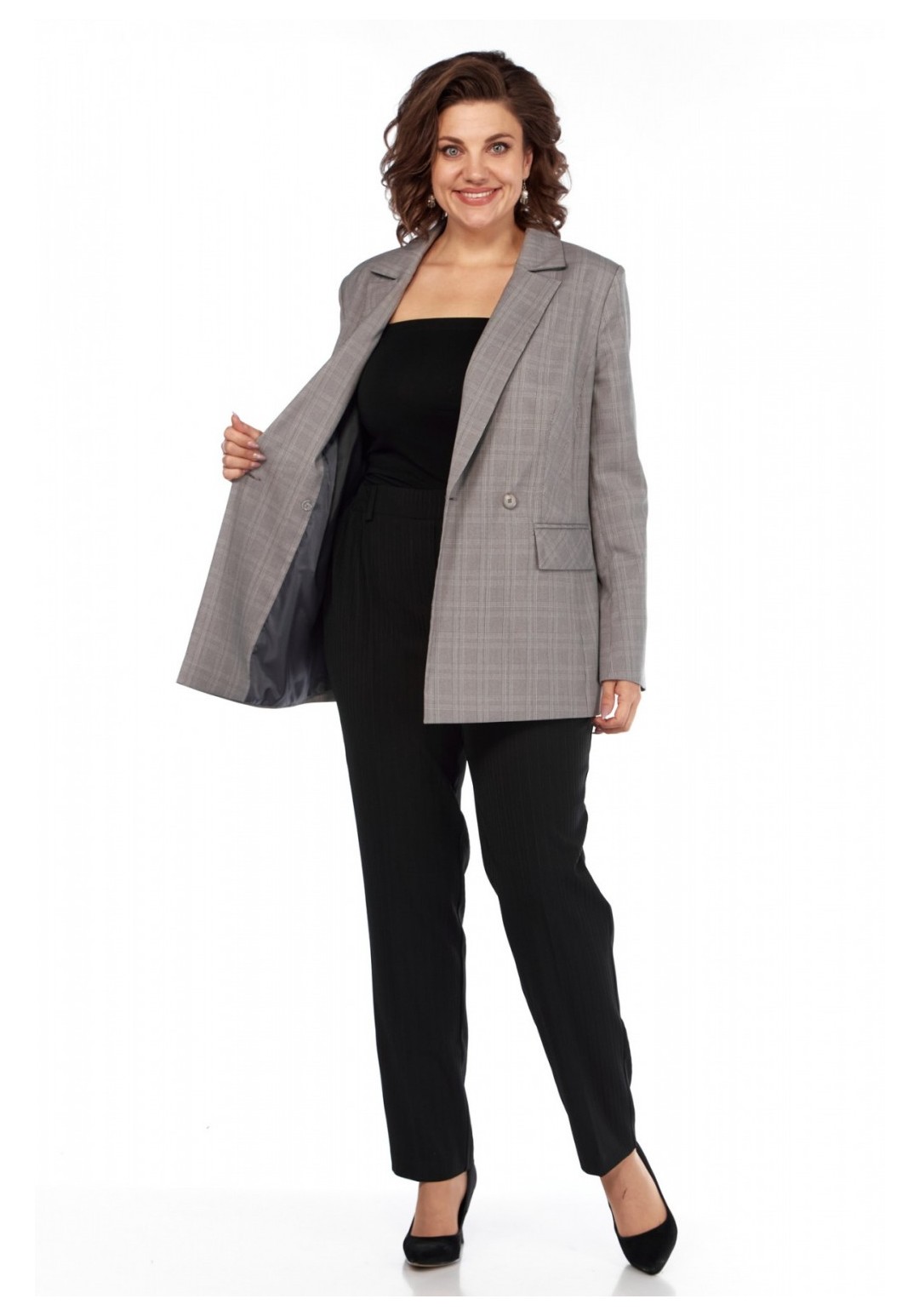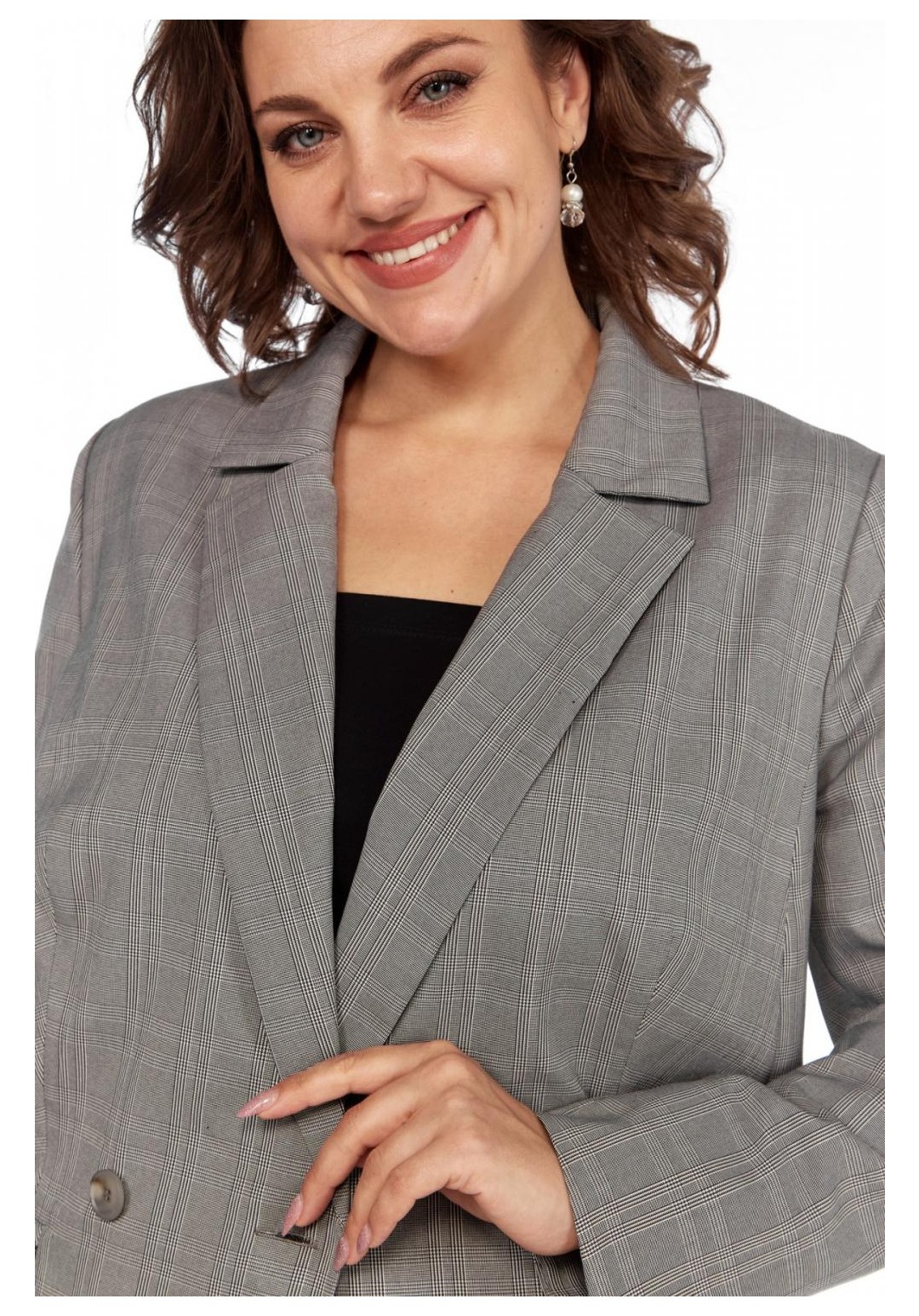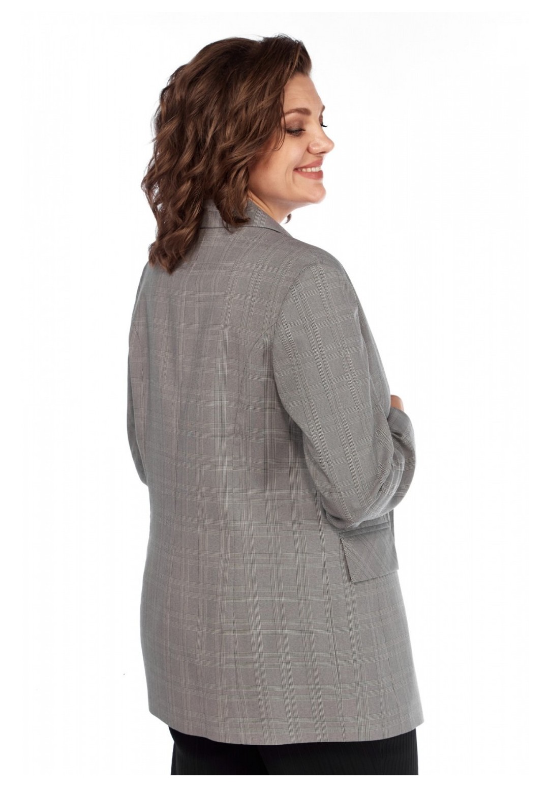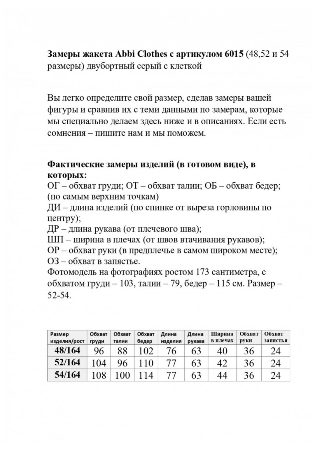 Классический двубортный женский жакет — это одежда, которая является неотъемлемой частью гардероба модниц. Женский пиджак длиной до середины бедер идеально подойдет для похода в школу или на вечеринку, а также для создания повседневных образов. Полуприталенный силуэт, 2-бортная застежка на петли и пуговицы, с классическим пиджачным воротником. С втачными двухшовными длинными рукавами с подкладкой. По переду талиевые вытачки, прорезные карманы с клапанами. По спинке средний шов, рельефные швы бочка. Ткань костюмно-плательная, принтованная клеткой. Жакет выпущен в единичных экземплярах в размерах 48, 52 и 54. При съемке в образе мы использовали брюки нашего бренда с рельефами-полосками черного цвета. На снимках и на видео наша фотомодель ростом 173 см., параметрами фигуры для размера 52-54. Жакет на фотомодели – 52 размера. Вы точно определите свой размер, сделав замеры вашей фигуры по обхватам груди, талии и бедер, сравнив их с теми данными по замерам, которые мы делаем для наших изделий в описании и в фототаблице. Если есть сомнения по выбору размера, пишите нам параметры фигуры, мы подберем именно ваш размер. Ссылка на видеоролики на нашем канале: https://www.youtube.com/watch?v=nN-BmdvIqZI https://www.youtube.com/@AbbiClothes Фактические замеры изделий (в готовом виде), в которых: ОГ – обхват груди; ОТ – обхват талии; ОБ – обхват бедер; ДИ – длина изделий (по спинке от выреза горловины по центру); ДР – длина рукава (от плечевого шва); ШП – ширина в плечах (от швов втачивания рукавов); ОР – обхват руки (в предплечье в самом широком месте); ОЗ – обхват в запястье. Фотомодель на фотографиях ростом 173 сантиметра, с обхватом груди – 103, талии – 79, бедер – 115 см. Размер – 52-54. Размер 48 ОГ – 96; ОТ – 88; ОБ – 102; ДИ – 76; ДР – 63; ШП – 40; ОР – 36; ОЗ –24 Размер 52 ОГ – 104; ОТ – 96; ОБ – 110; ДИ – 77; ДР – 63; ШП – 42; ОР – 36; ОЗ –24 Размер 52 ОГ – 108; ОТ – 100; ОБ – 114; ДИ – 77; ДР – 63; ШП – 44; ОР – 36; ОЗ –24
