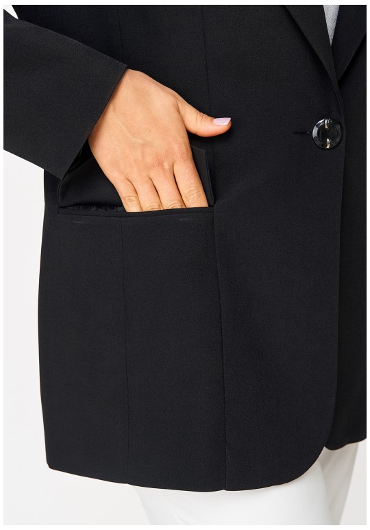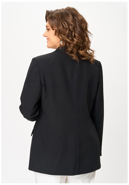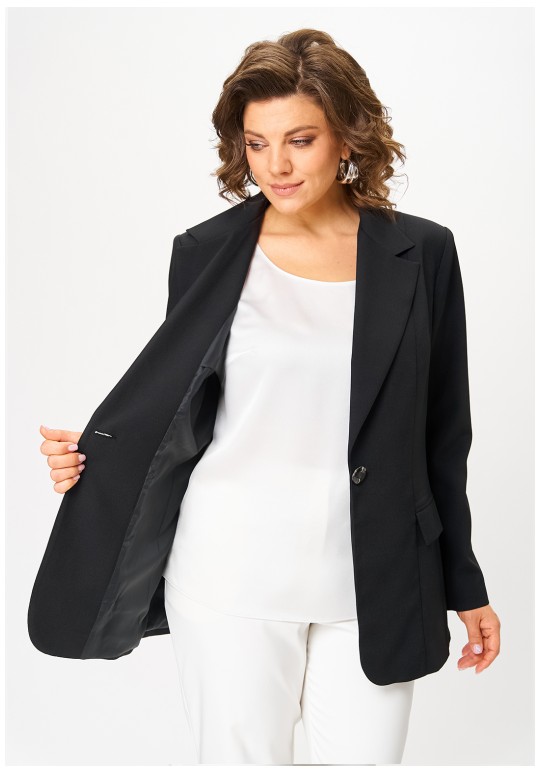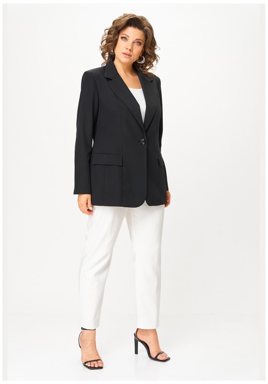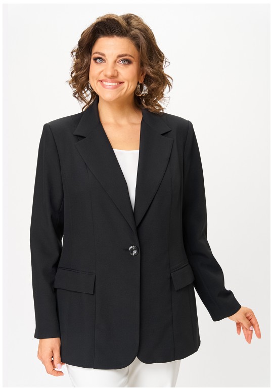 Жакет прямого силуэта, выполнен из однотонной ткани, жакет на подкладке. Полочка жакета с центральной застежкой на петлю пуговицу. Полочка с вертикальными рельефами и прорезными карманами с клапанами. Горловина V-образной формы с отложными лацканами и воротником пиджачного типа. Спинка со средним швом и вертикальными рельефами. Рукав втачной, двухшовный. Жакет на плечиках.