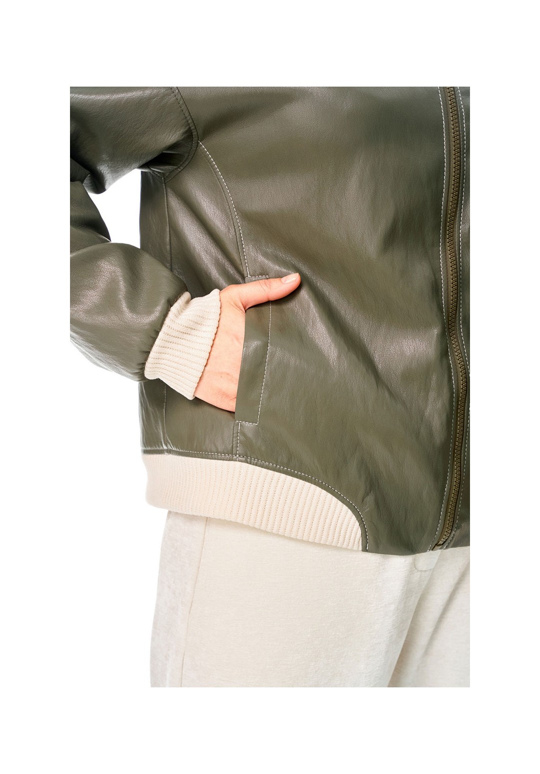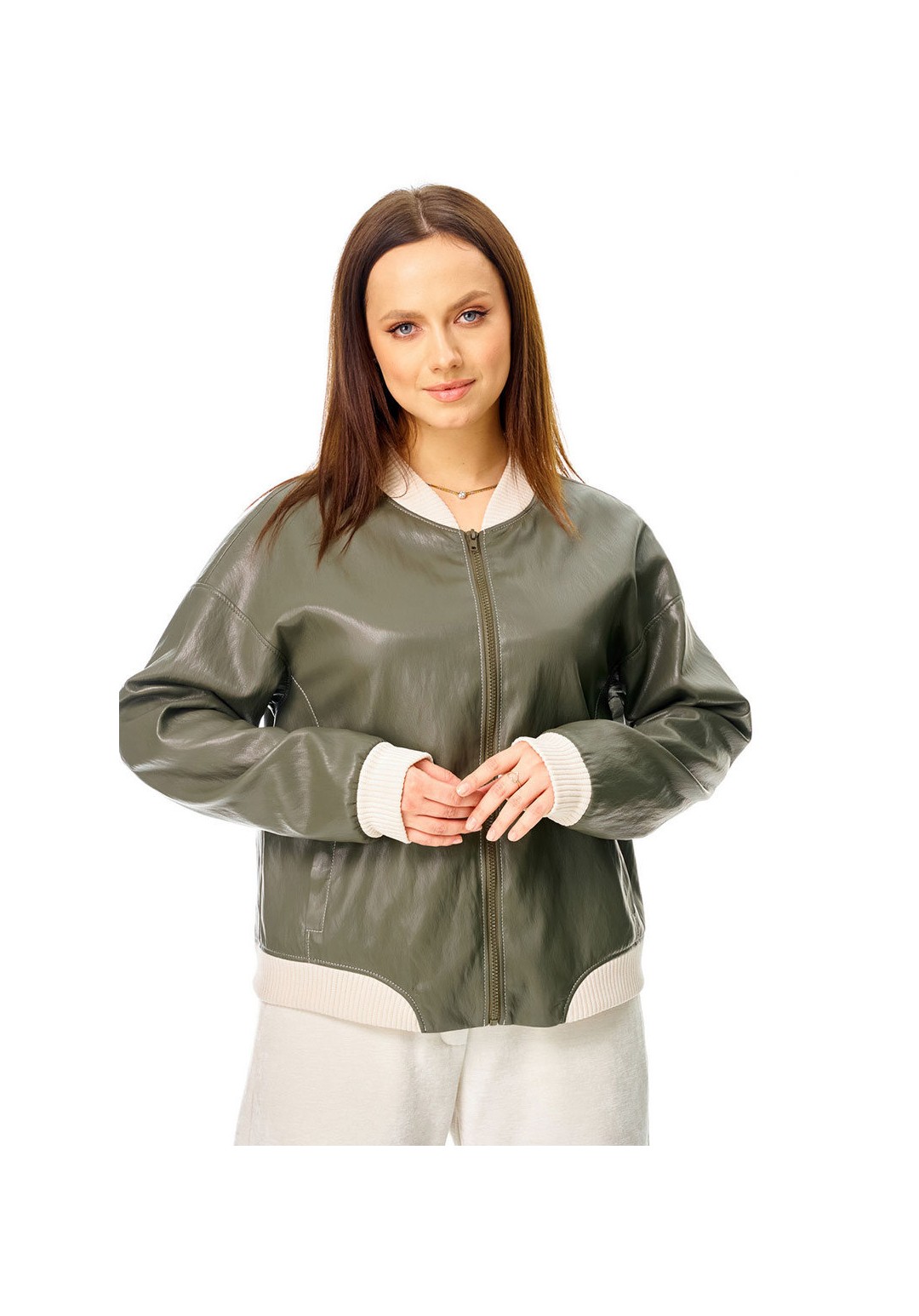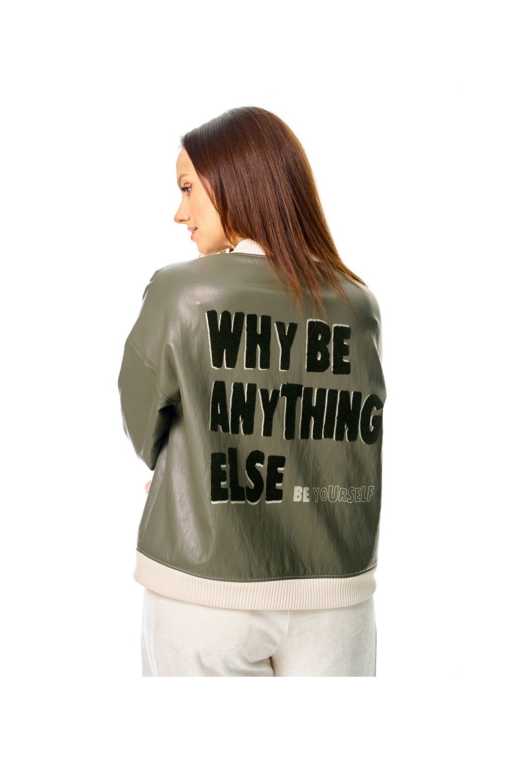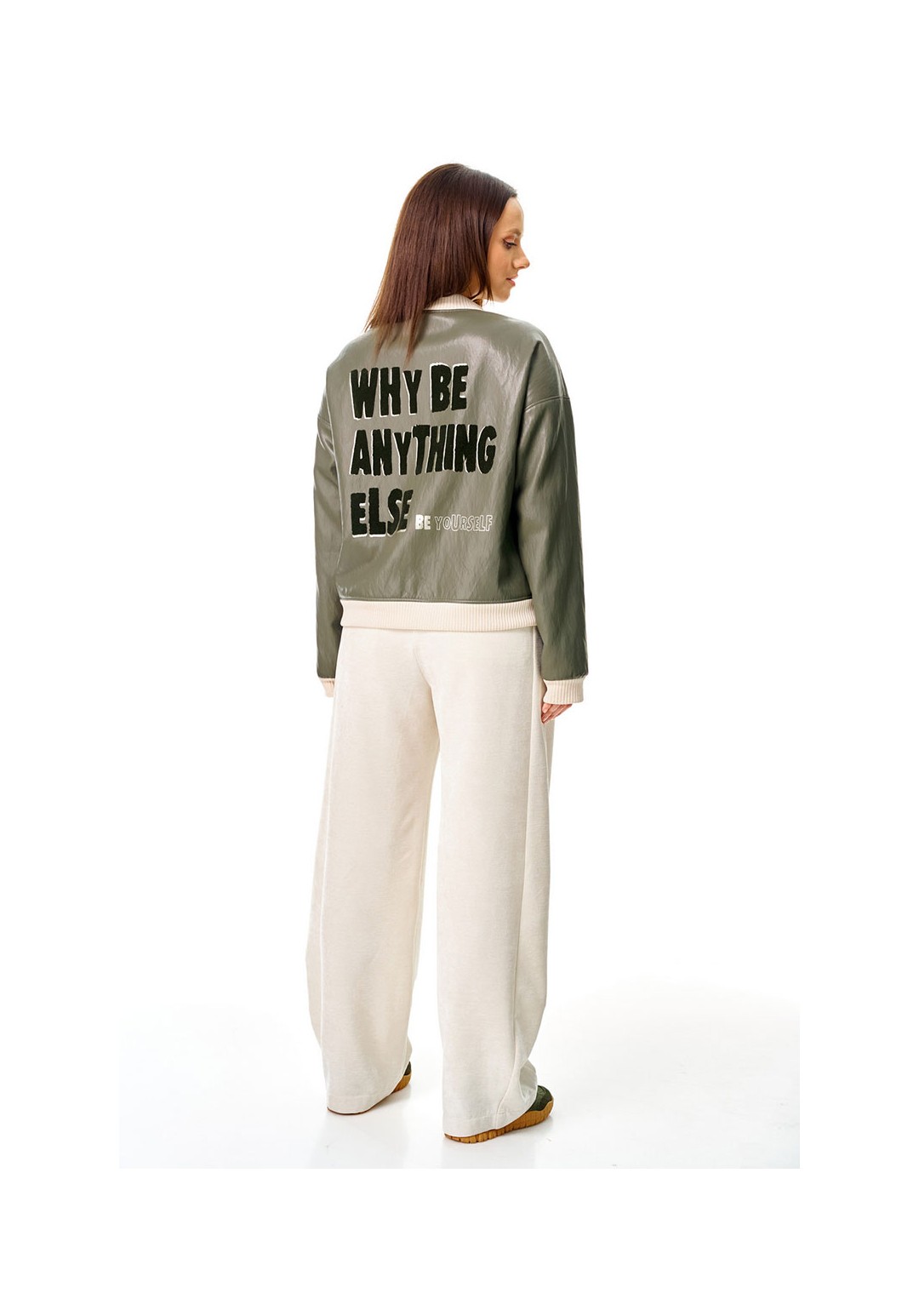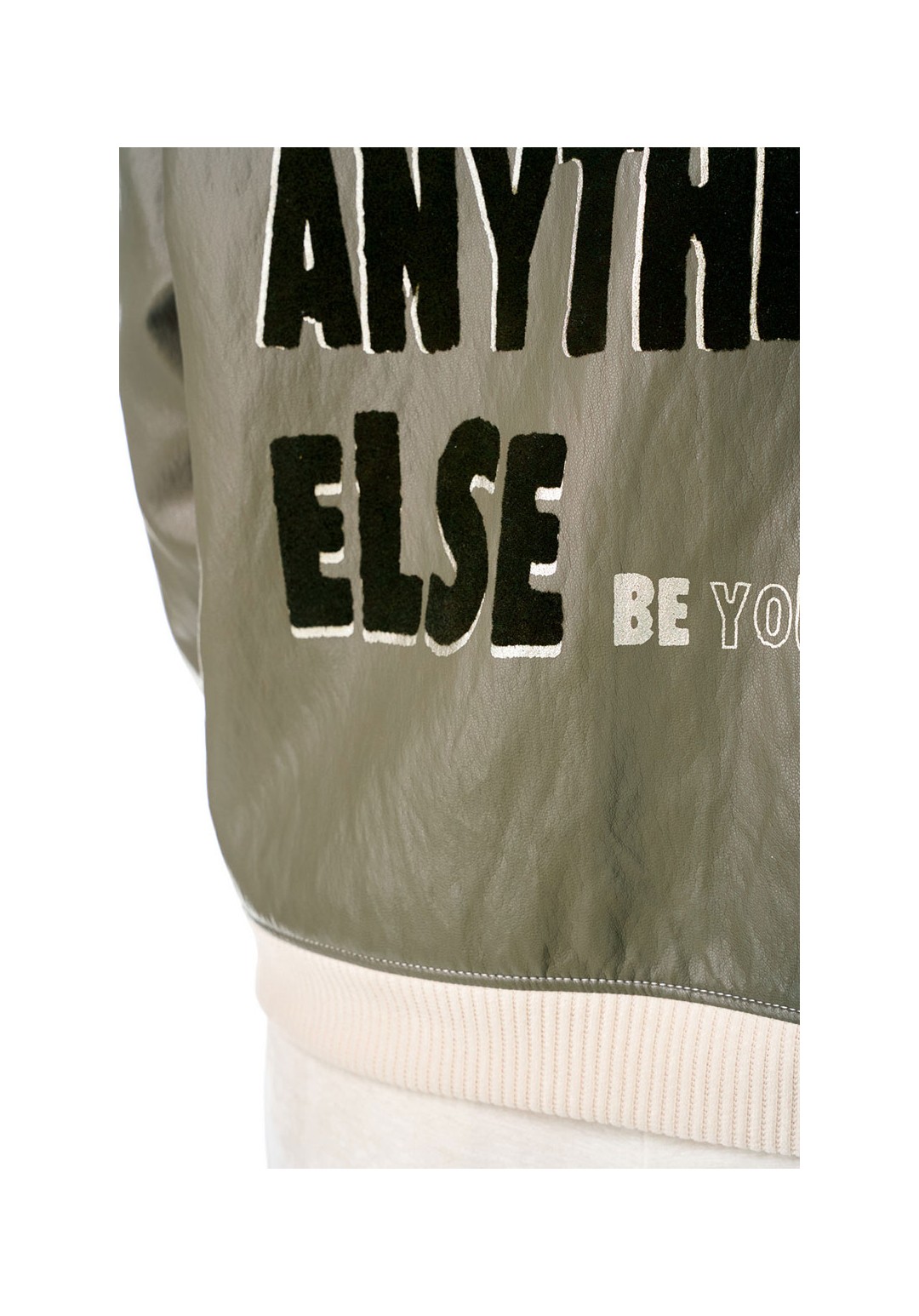 Бомбер из мягкой и эластичной экокожи, длиной до линии бедер, с застежкой на молнию, горловиной со стойкой и боковыми карманами в швах. Стойка и манжета низа из отделочного вельветового трикотажа. Спинка декорирована авторским принтом с использованием флока. Изделие на подкладке.