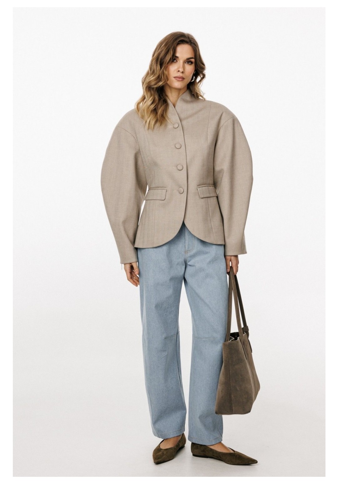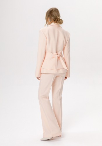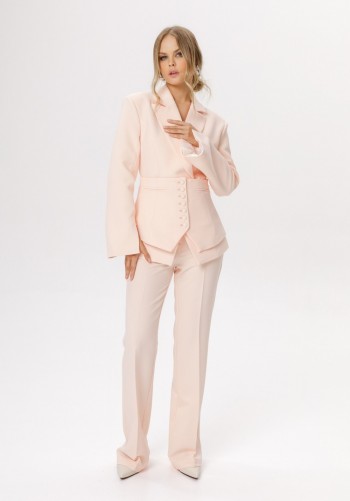 Жакет выполнен из костюмной ткани. Жакет О-образного силуэта, длиной до линии бедер. По переду обработаны рельефы от плечевого шва до низа, прорезные карманы с клапанами, и центральная бортовая застежка на 4 петли и пуговицы. Низ борта округлой формы. На спинке обработаны два рельефа от горловины до низа и средний шов. Горловина округлой формы, обработана цельнокроеным воротником-стойкой. Плечевой шов удлинен. Рукав фигурной формы, двухшовный, заужен к низу. Жакет с плечевыми накладками. Жакет на притачной по низу подкладке. _x000D_Длина жакета - 65 см. Длина рукава от горовины - 85 см. ЖАКЕТ м. 3029 44 46 48 Длина по центру спинки со стойкой 65 65 65 Длина рукава со стойкой и плечевым 85 85 85 Объем по груди 98 102 106 Объем по талии 81 85 89 Объем по низу 116 120 124 Объем рукава вверху 50 52 54 Объем рукава внизу 28 28 28