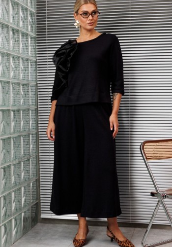 Укороченный жакет из эко-кожи. Крой свободный, рукав втачной на спущенной пройме. Изделие на подкладке. На переде удобные карманы и застежка на кнопки. Длина рукава - полный.