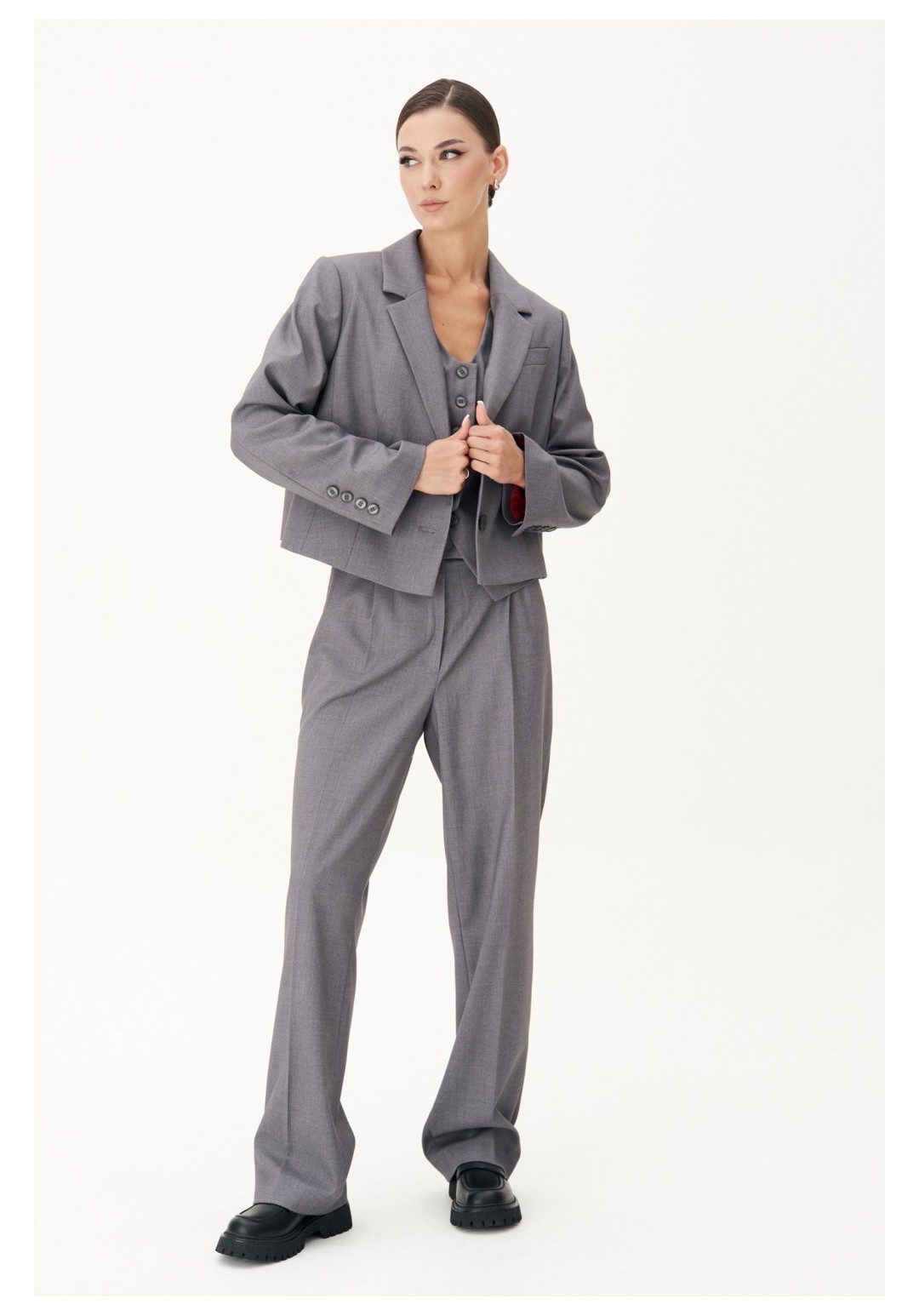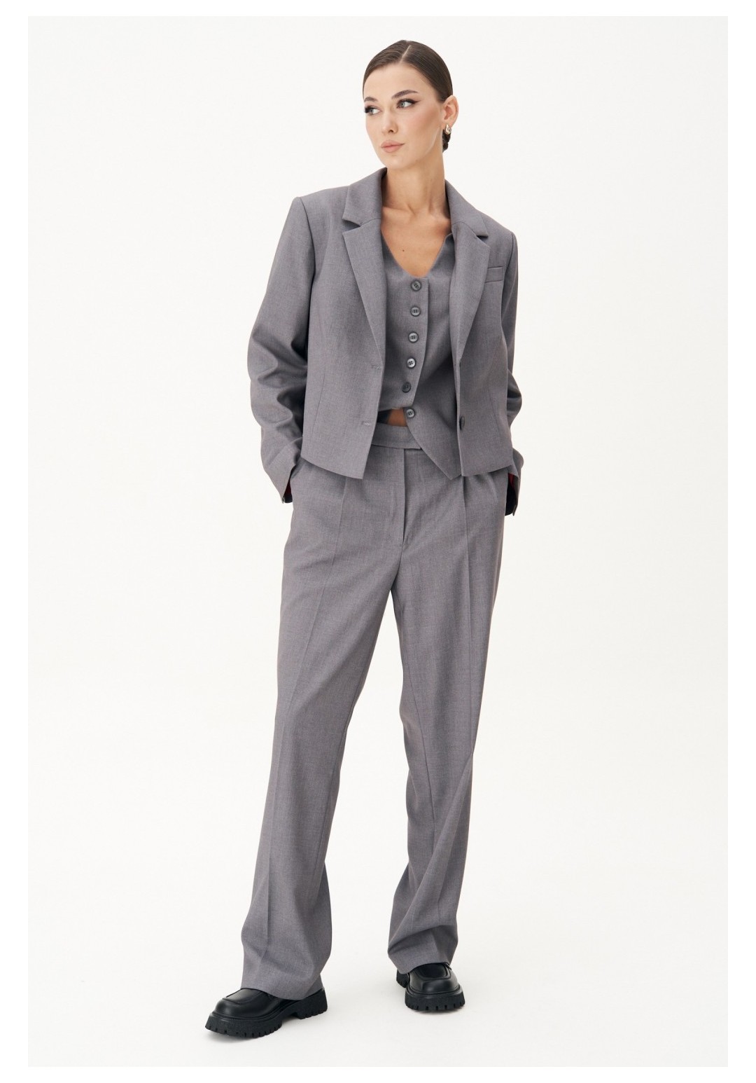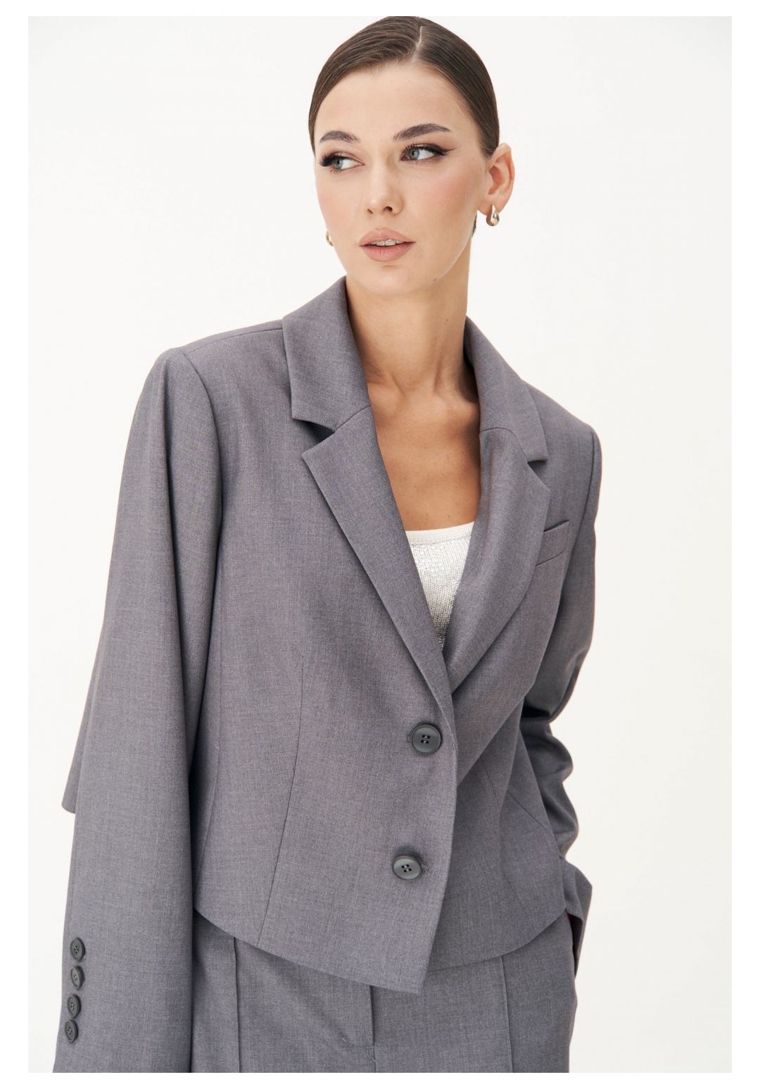 Жакет полуприлегающего силуэт, втачного покроя с центральной застёжкой и классическим английским воротником. Полочка с нагрудной вытачкой, отрезным бочком и прорезным верхним карманом с листочкой. Спинка с центральным швом и плечевыми вытачками. Рукав двухшовный с отлетной шлицей и отделочными пуговицами. Длина жакете около 52 см. Длина рукава около 62 см.