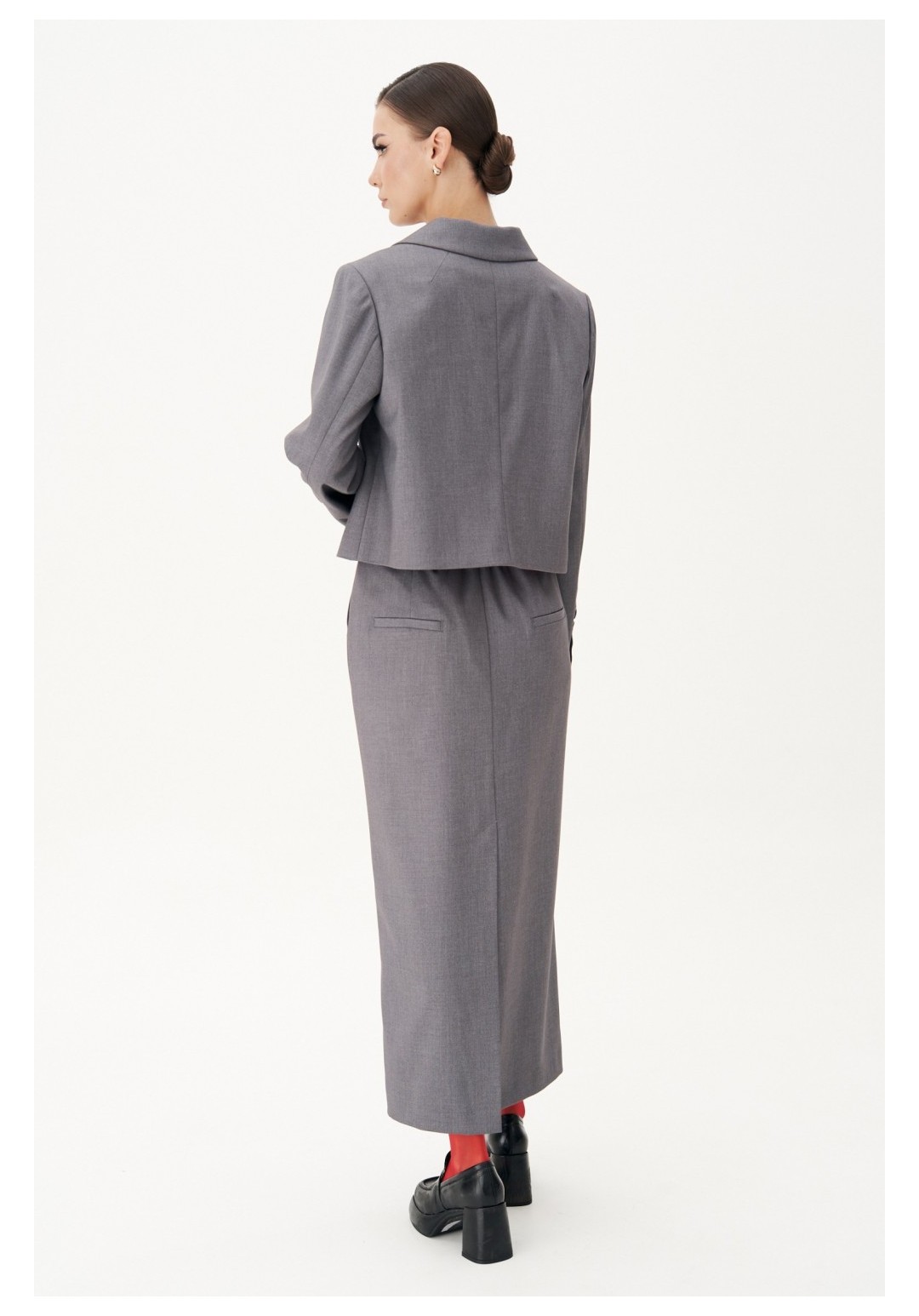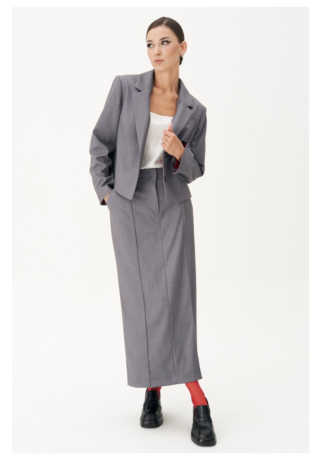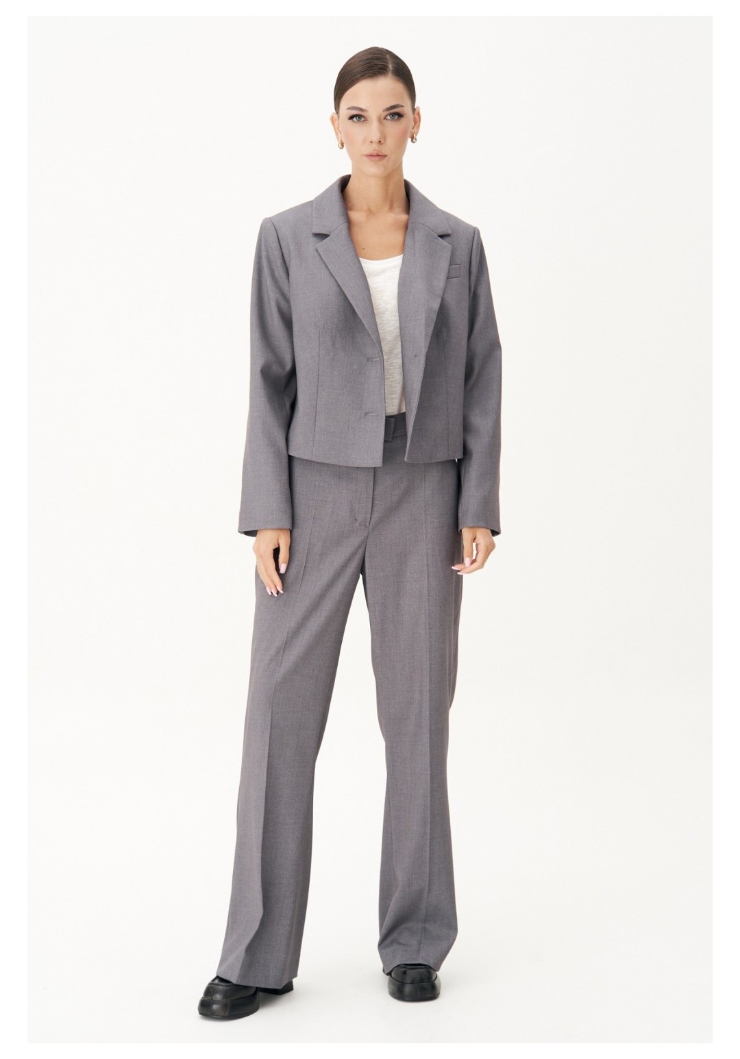 Жакет полуприлегающего силуэт, втачного покроя с центральной застёжкой и классическим английским воротником. Полочка с нагрудной вытачкой, отрезным бочком и прорезным верхним карманом с листочкой. Спинка с центральным швом и плечевыми вытачками. Рукав двухшовный с отлетной шлицей и отделочными пуговицами. Длина жакете около 52 см. Длина рукава около 62 см.