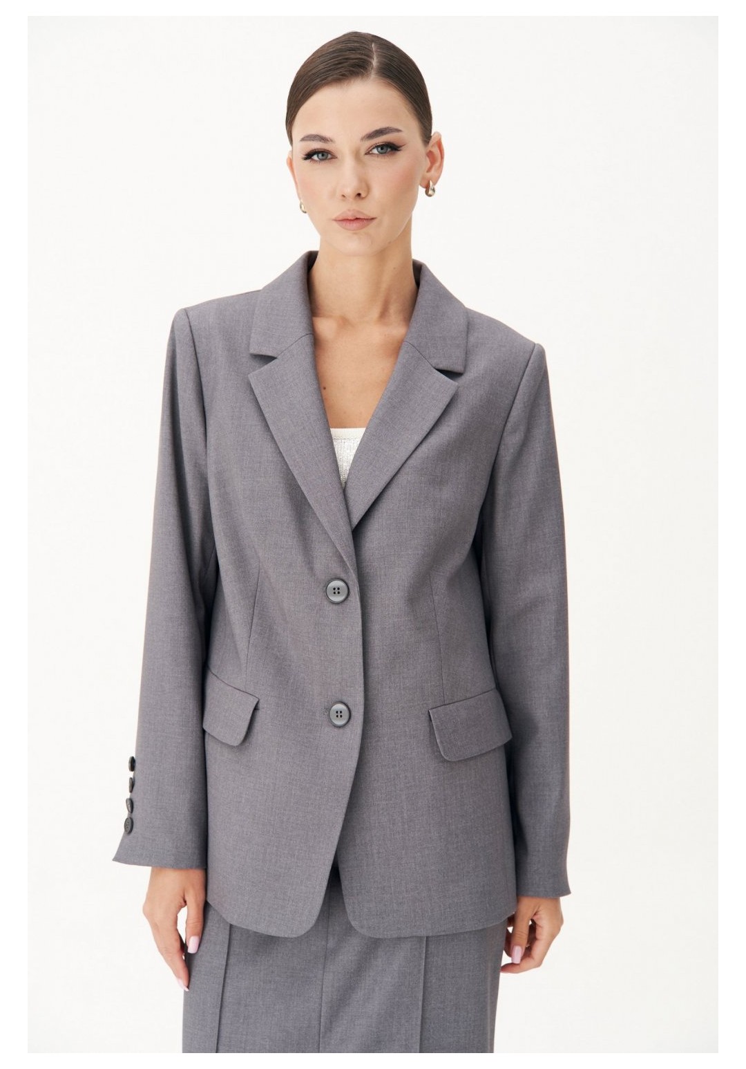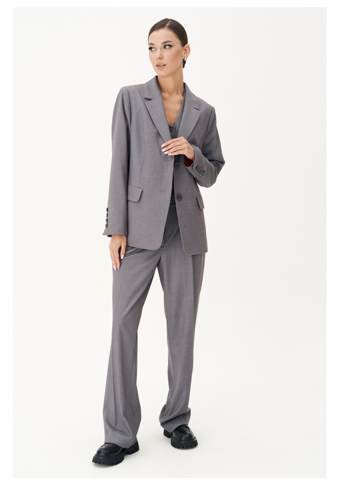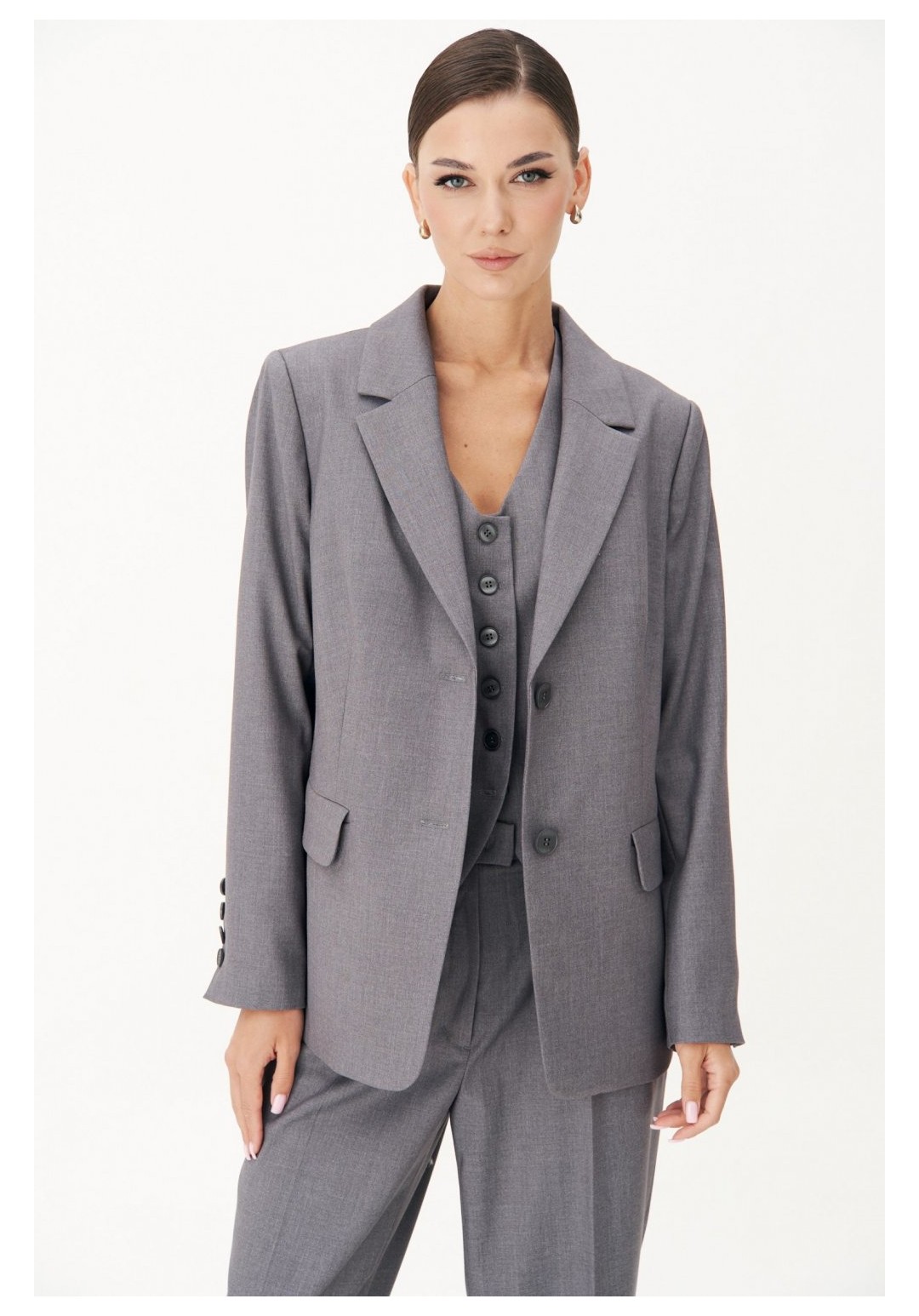 Жакет классического полуприлегающего силуэта, втачного покроя с центральной застёжкой и английским воротником. Полочка с отрезным бочком, талиевой вытачкой и прорезным карманом с клапаном. Спинка с центральным швом, отрезным бочком и плечевой вытачкой. Рукав двухшовный с отлетной шлицей и отделочными пуговицами. Длина жакета около 70 см. Длина рукава около 62 см.