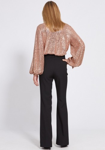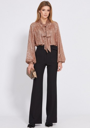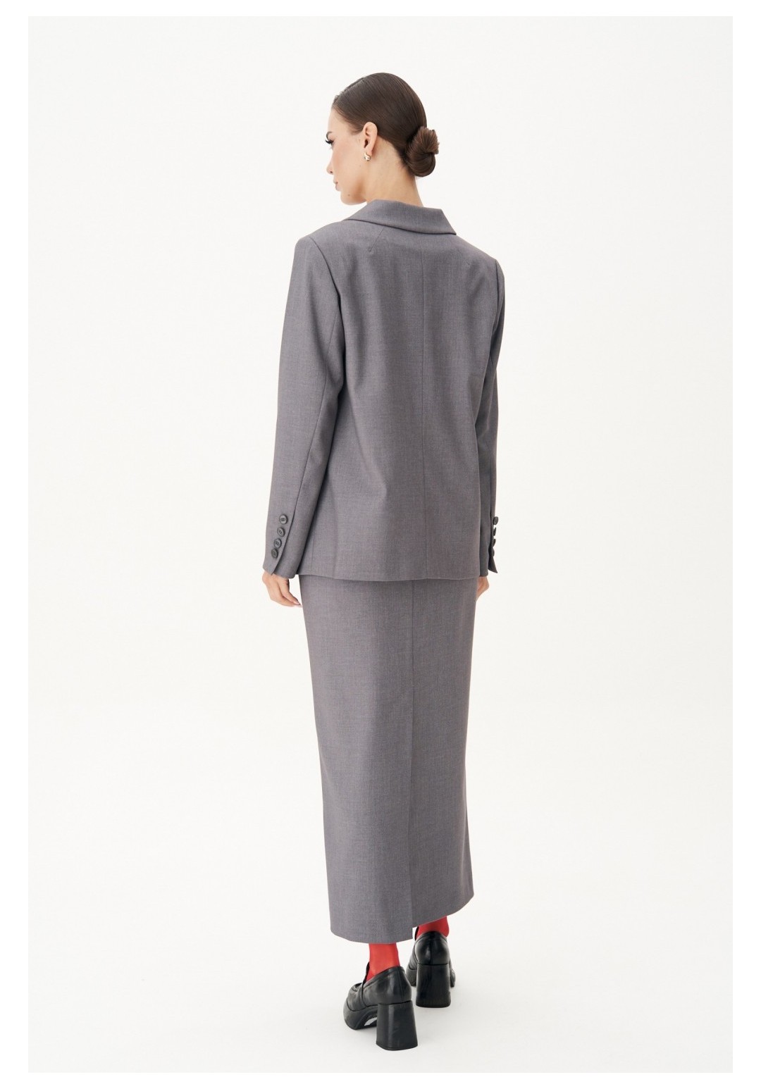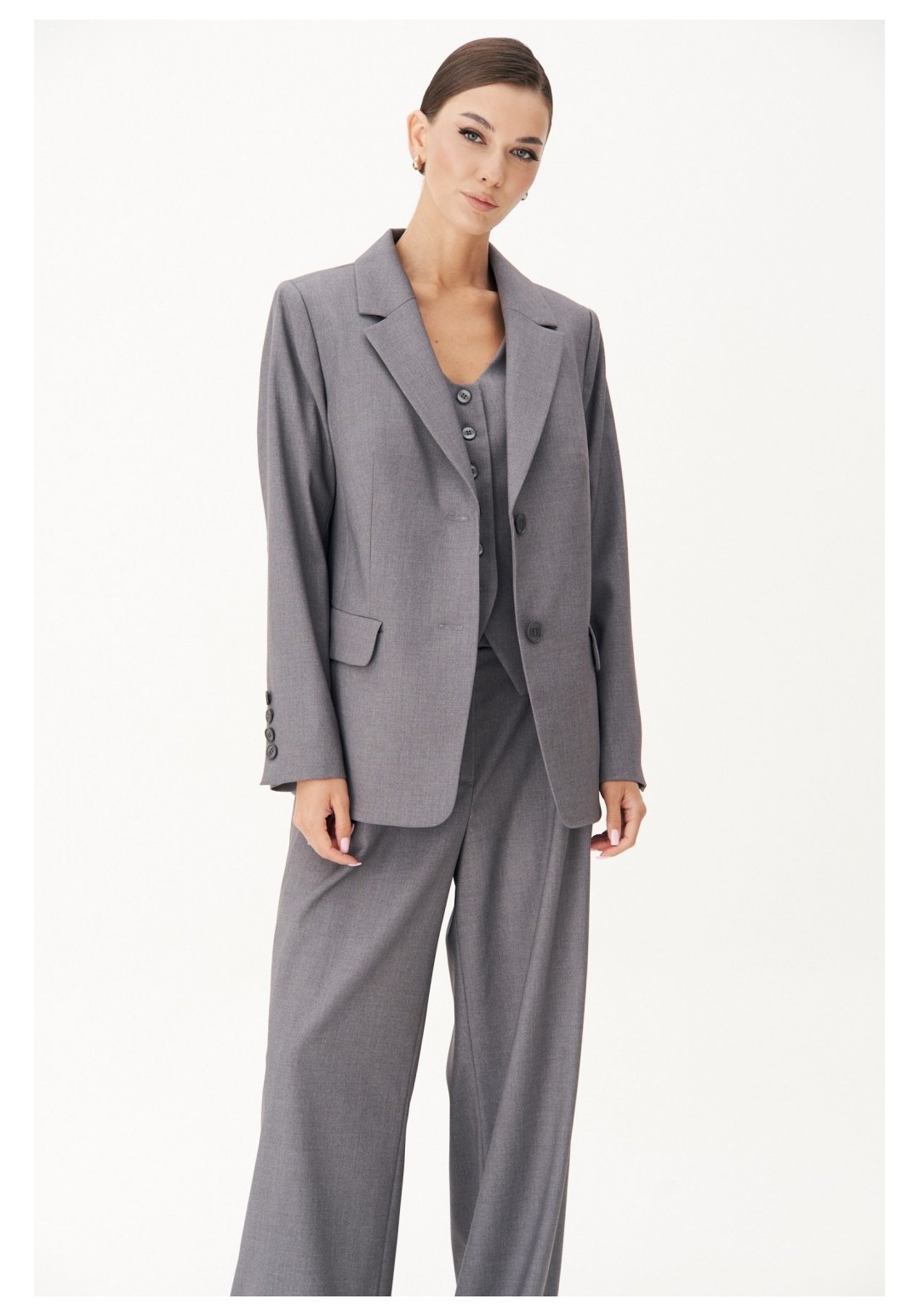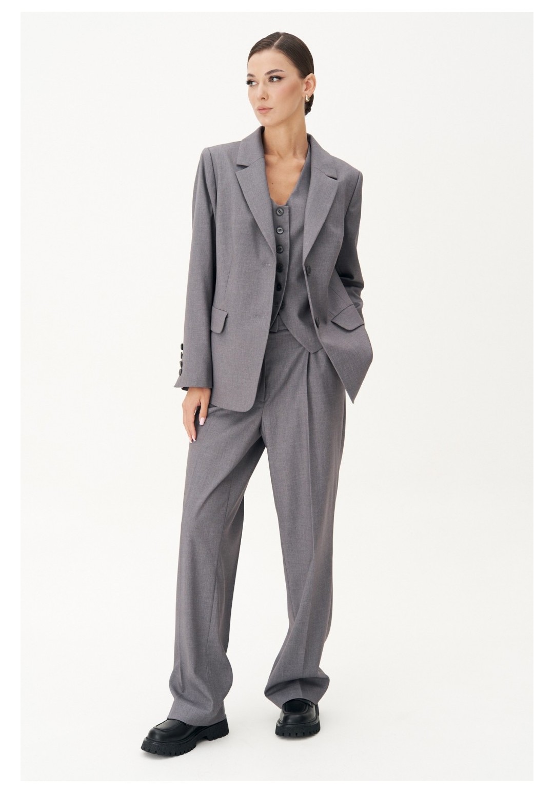 Жакет классического полуприлегающего силуэта, втачного покроя с центральной застёжкой и английским воротником. Полочка с отрезным бочком, талиевой вытачкой и прорезным карманом с клапаном. Спинка с центральным швом, отрезным бочком и плечевой вытачкой. Рукав двухшовный с отлетной шлицей и отделочными пуговицами. Длина жакета около 70 см. Длина рукава около 62 см.