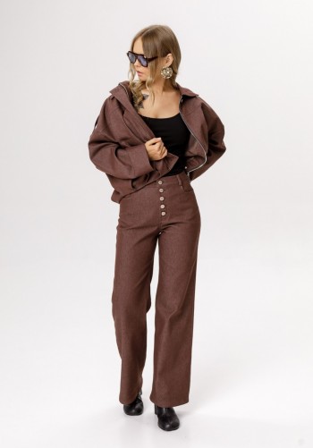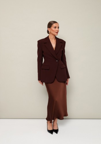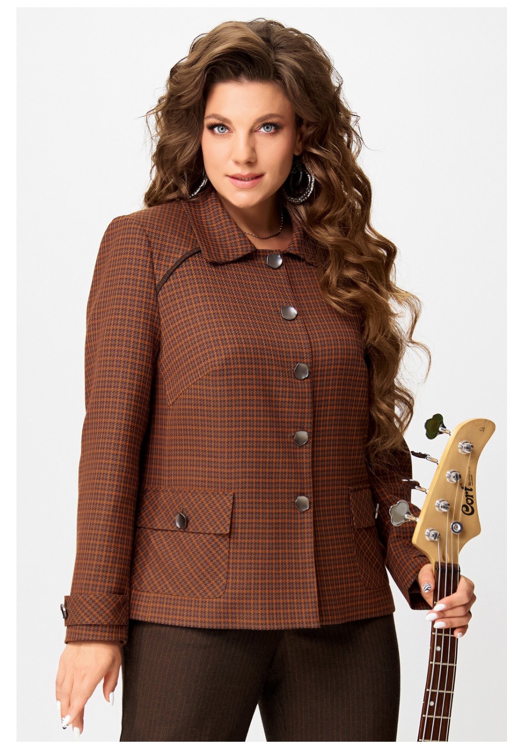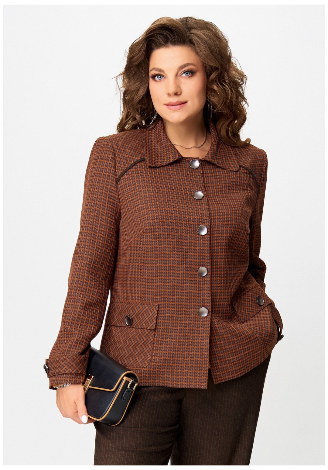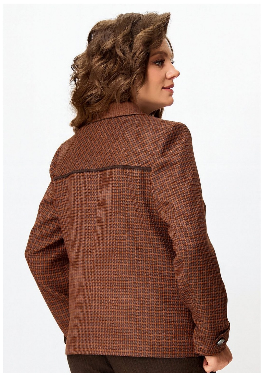 Женский стильный жакет "Венциана" из клетчатого текстиля, полностью на подкладке, с элегантным полуприлегающим силуэтом. Его дизайн отличает однобортная застежка на пуговицы и классический отложной воротник. Передняя часть изделия искусно оформлена нагрудными вытачками и отрезными бочками, а верхняя часть полочки украшена кокеткой с вшитым декоративным кантом. Функциональные накладные карманы с клапанами также застегиваются на пуговицы. Спинка имеет средний шов и отрезную кокетку сверху, также с декоративным кантом. Двухшовные втачные рукава завершаются декоративными патами на пуговицах.