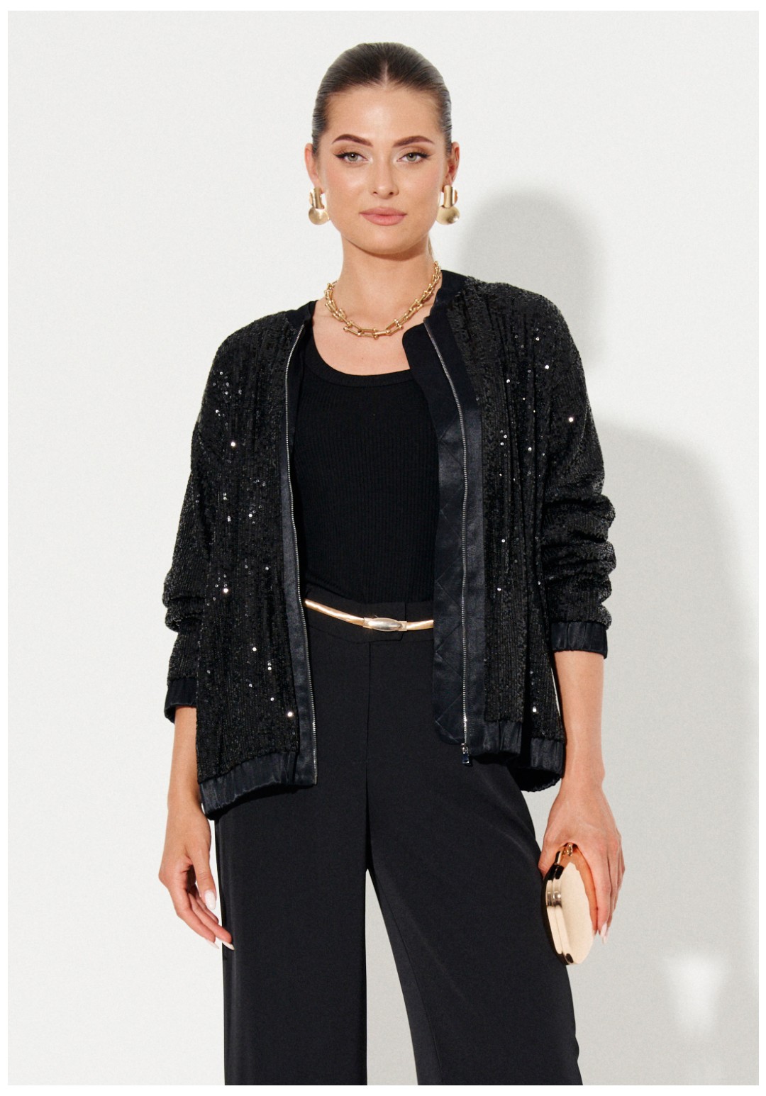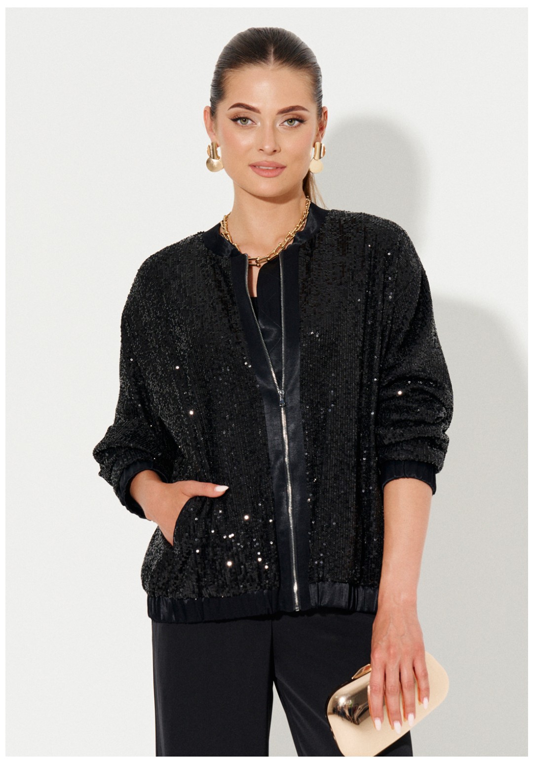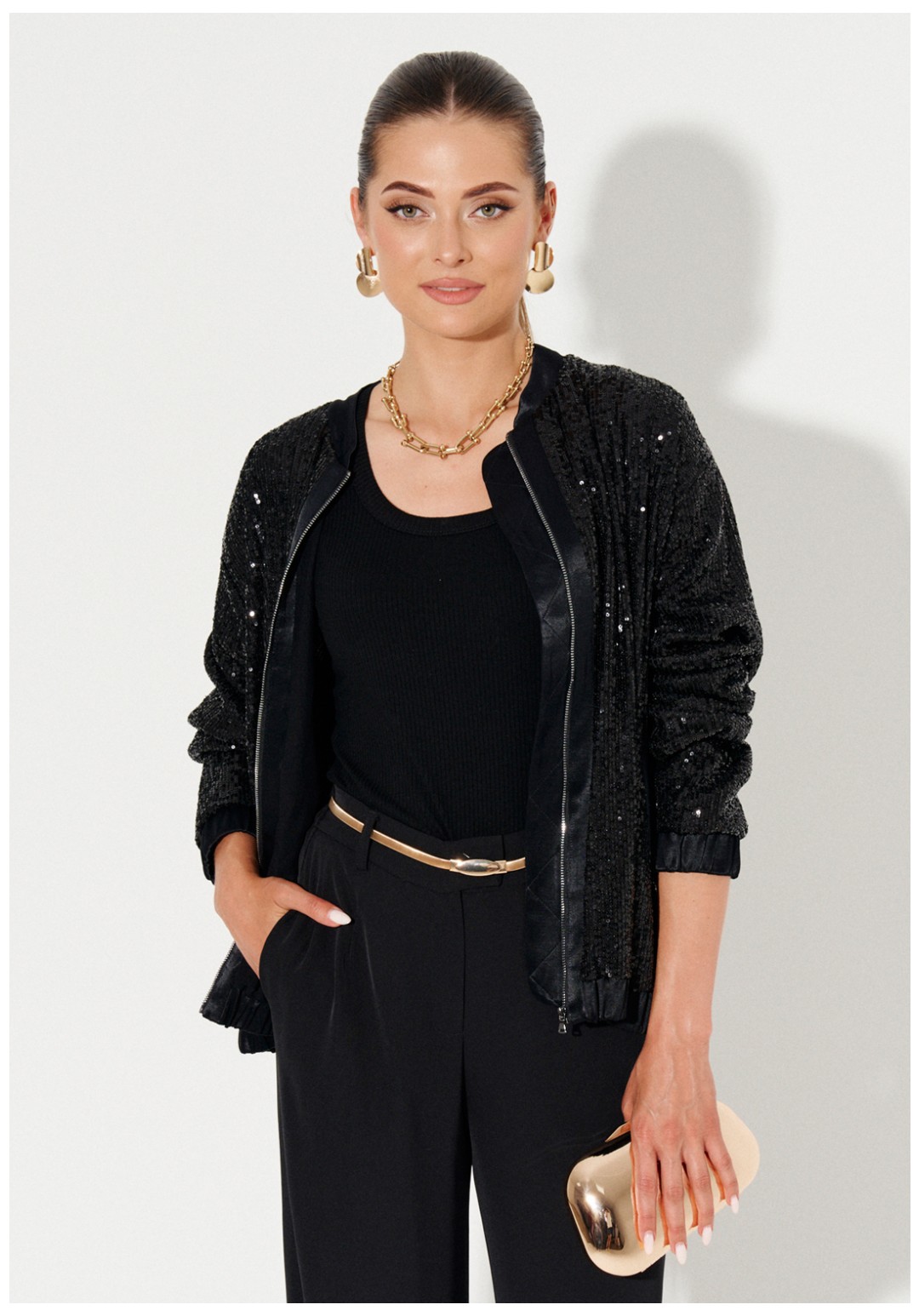 Женский бомбер из ткани с пайетками станет настоящим украшением вашего гардероба. Модель с удобными прорезными карманами и отделочными планками вдоль молнии добавляет образу яркости и стиля. Втачные рукава с манжетами на резинке и пояс по низу изделия создают стильный и завершенный образ. Подкладка из вискозы обеспечивает комфорт, делая бомбер отличным выбором для вечеринок и мероприятий. Блеск пайеток и отделка атласной тканью придают модели праздничный вид, который обязательно привлечет внимание окружающих.