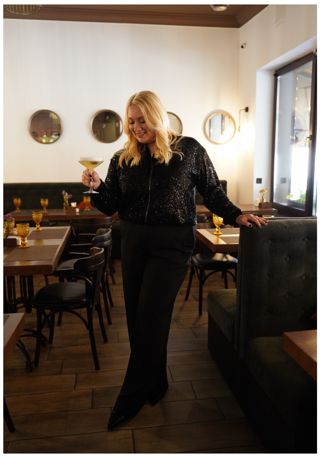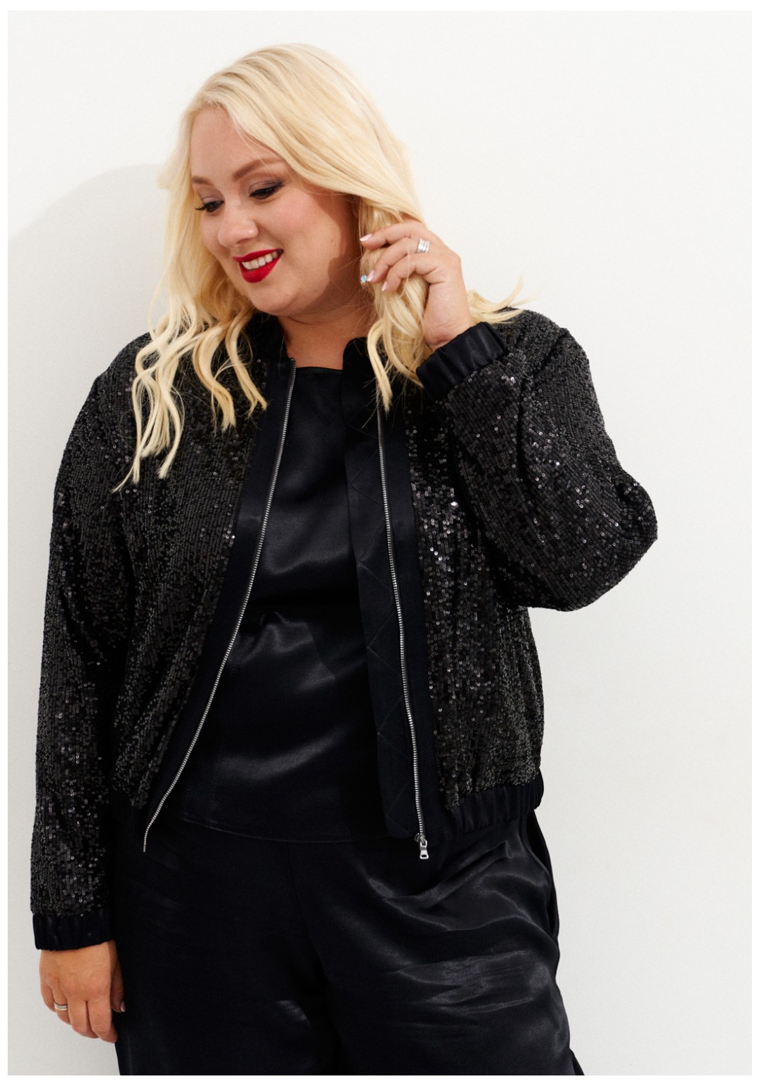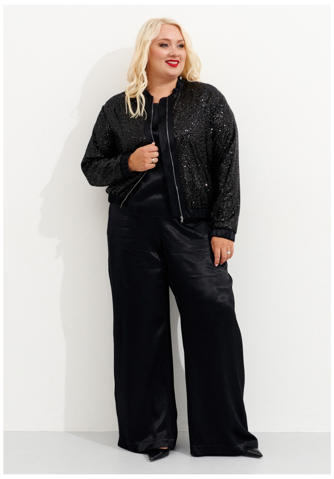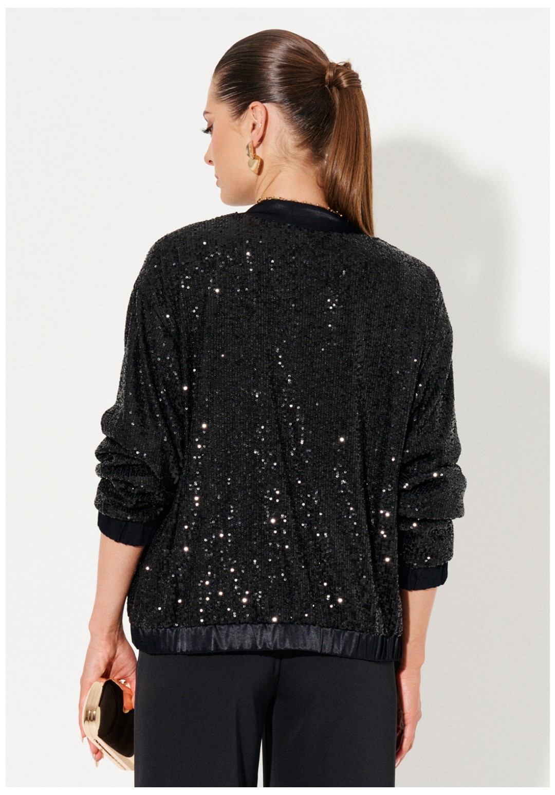 Женский бомбер из ткани с пайетками станет настоящим украшением вашего гардероба. Модель с удобными прорезными карманами и отделочными планками вдоль молнии добавляет образу яркости и стиля. Втачные рукава с манжетами на резинке и пояс по низу изделия создают стильный и завершенный образ. Подкладка из вискозы обеспечивает комфорт, делая бомбер отличным выбором для вечеринок и мероприятий. Блеск пайеток и отделка атласной тканью придают модели праздничный вид, который обязательно привлечет внимание окружающих.