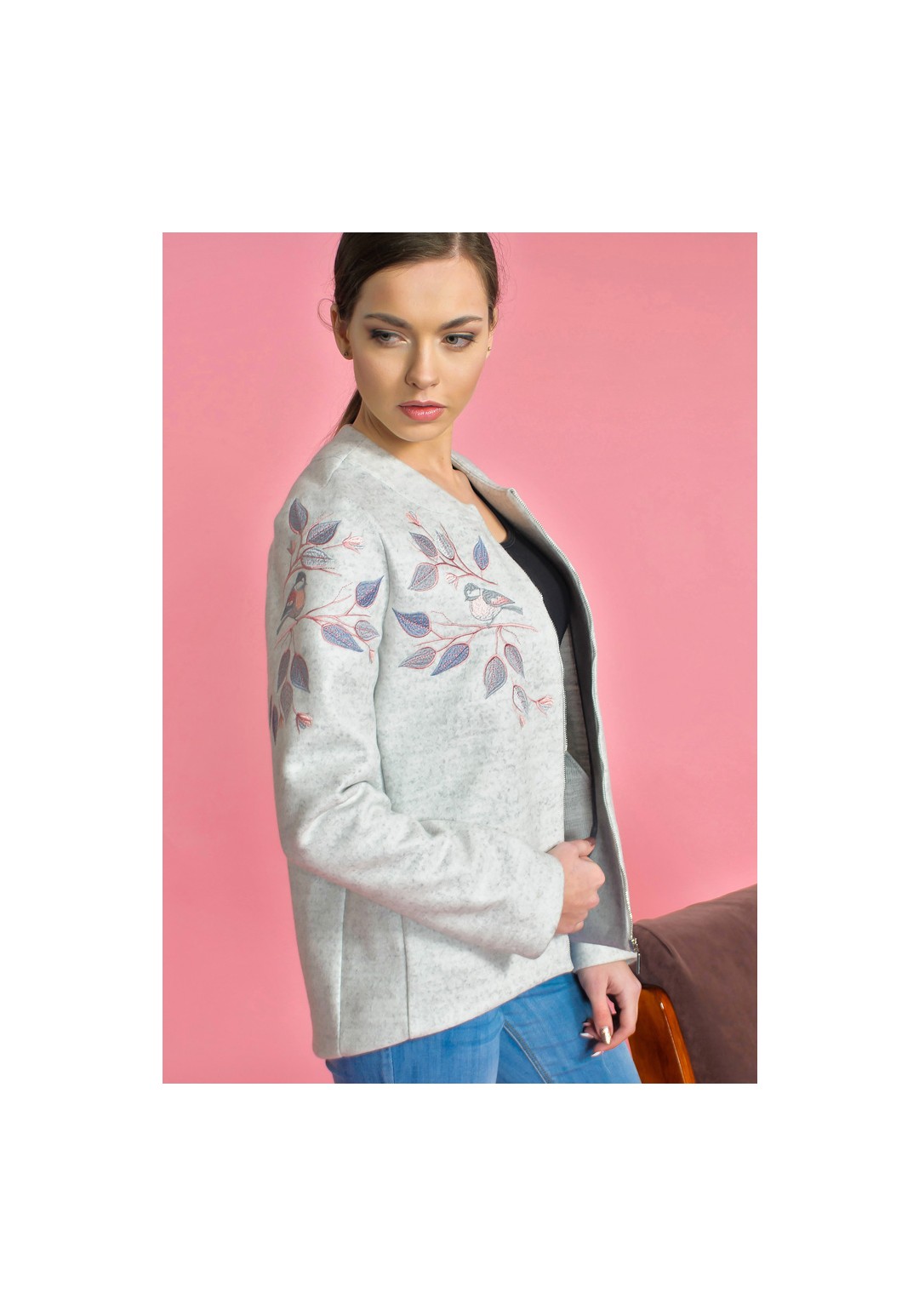 Жакет (куртка) женский свободного силуэта, передние полочки плавно переходят в удлиненную спинку, на передней правой полочке и внешней части правого рукава вышивка, спинка однотонная, застежка-молния, имеется карман в рельефе бокового шва, спинка бесшовная, рукав втачной, круглая горловина, изделие без подкладки.