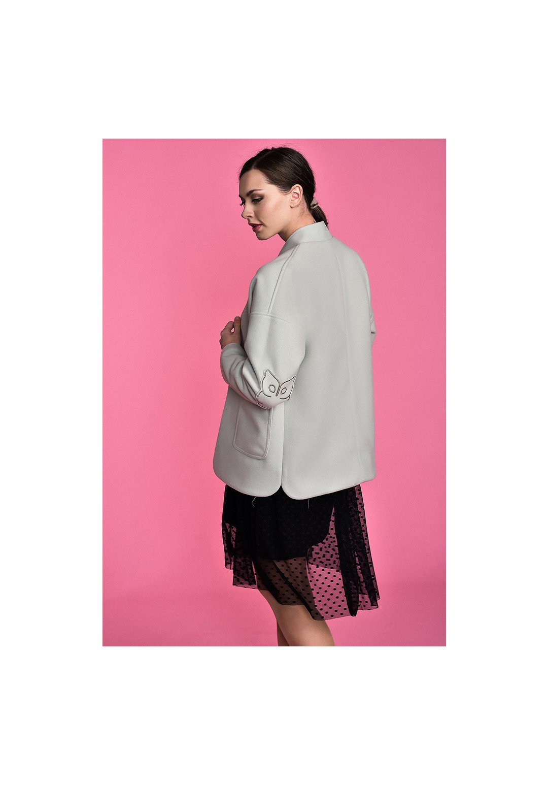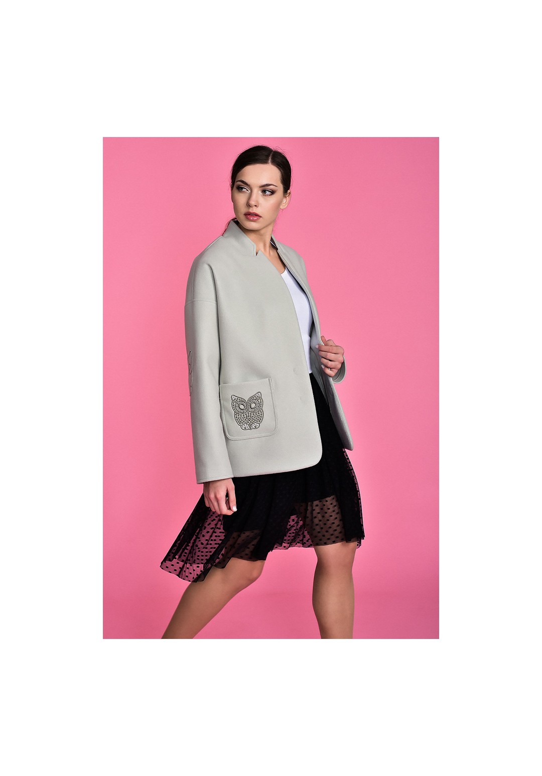 Жакет женский, нарядно-повседневный, прямого силуэта, застежка - потайные магниты. Перед прямой. Воротник - стойка.  На полочках  накладные  отстроченные  карманы. На кармане декоративная  вышивка-сова. Спинка прямая с центральным швом. Рукав втачной, спущенный, одношовный, в зоне притачивания  отстрочен. На рукавах в зоне локтя - декоративная пришивная вышивка.