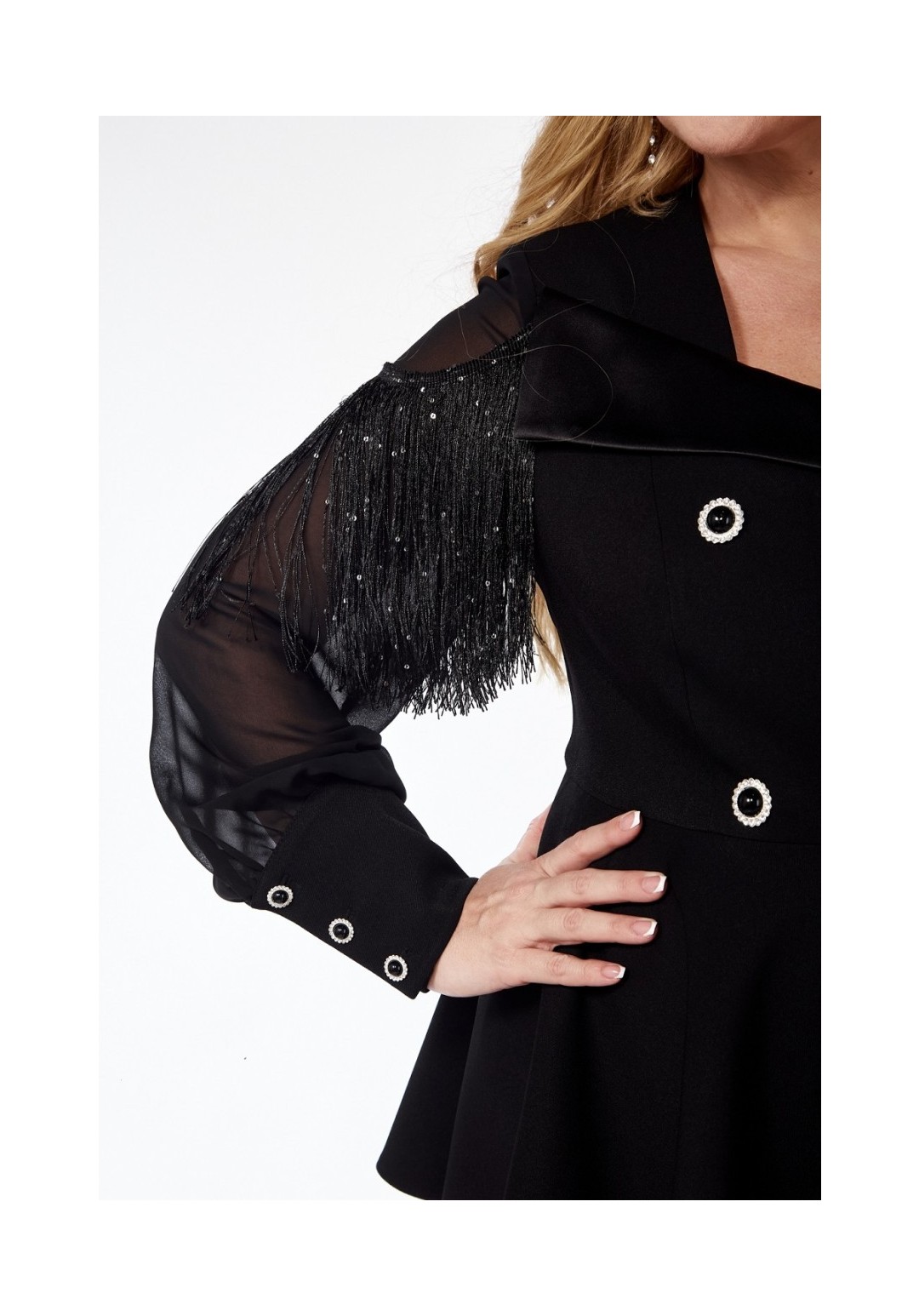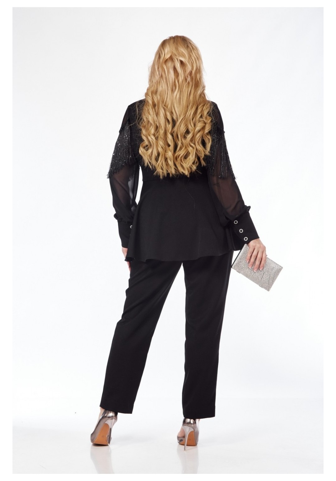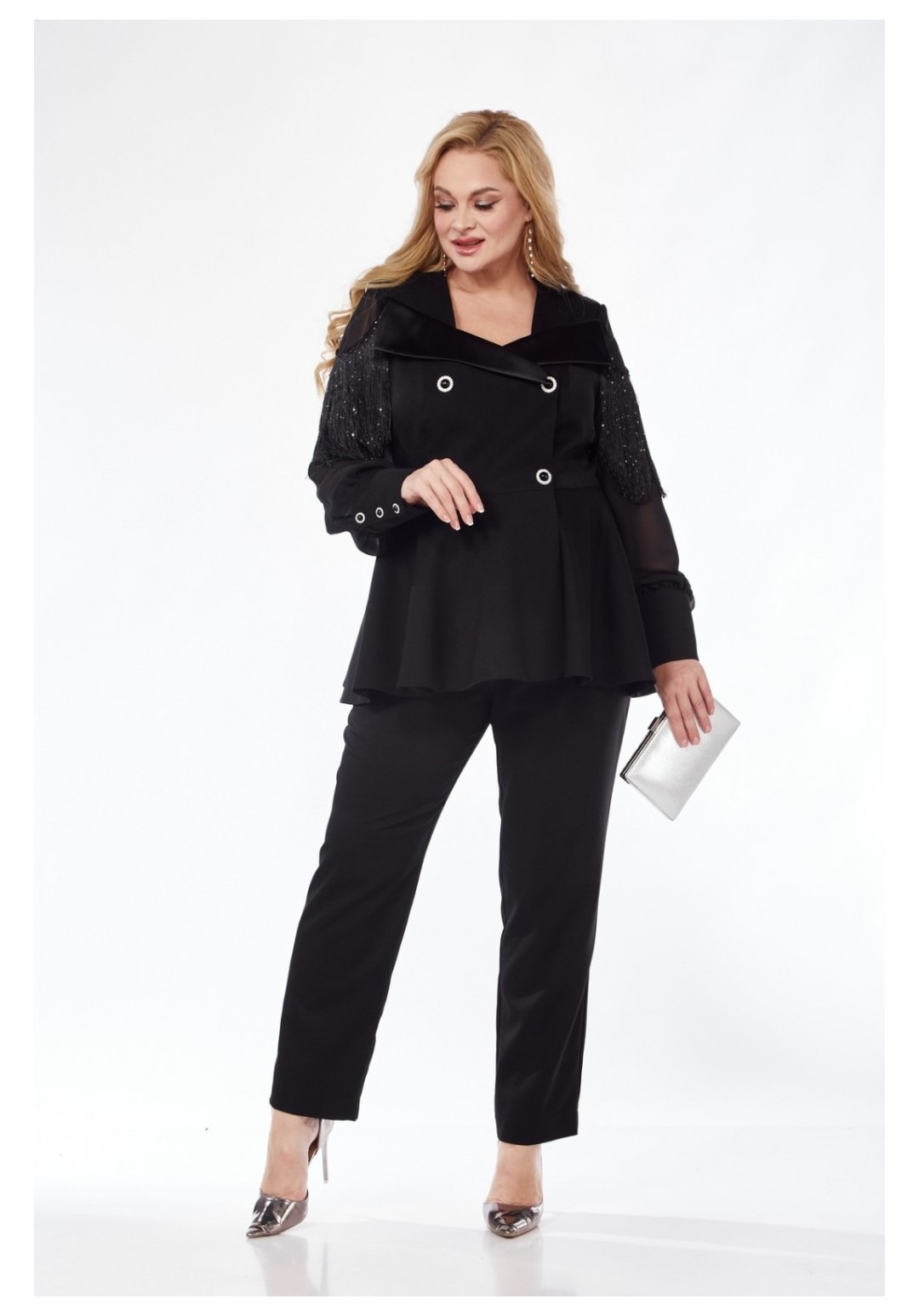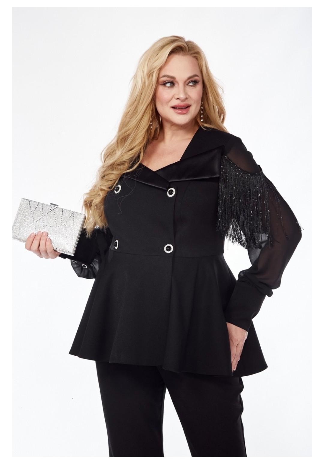 Жакет с баской и втачными рукавами. Отрезной в талии лиф выполнен с двубортной застёжкой и фигурным вырезом декольте, декорированным лацканами из отделочной ткани. Рукава из шифона на отрезной высокой манжете. Изделие на подкладке и с плечевыми накладками.