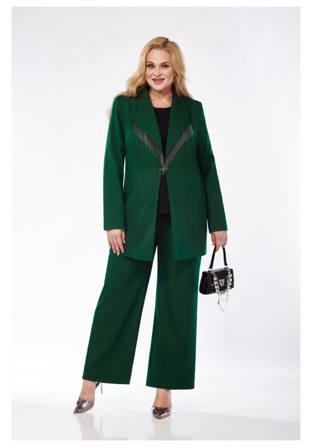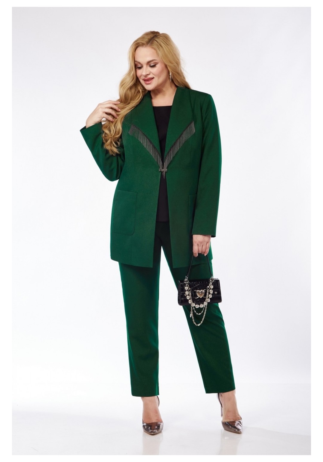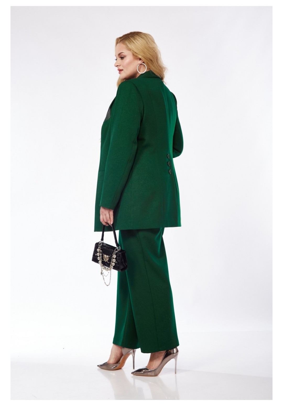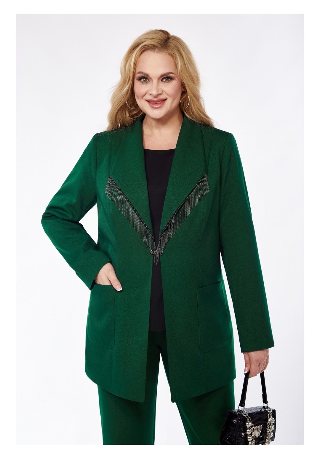 Удлинённый жакет полуприлегающего силуэта с шалевым фигурным воротником и отделочной тесьмой. На деталях переда и спинки обработаны рельефы, накладные карманы, сзади средний шов с высокой шлицей. Рукава втачные двухшовные. Застёжка в стык на декоративную фурнитуру. Шлица с отделкой из пуговиц. Изделие на подкладке и с плечевыми накладками.