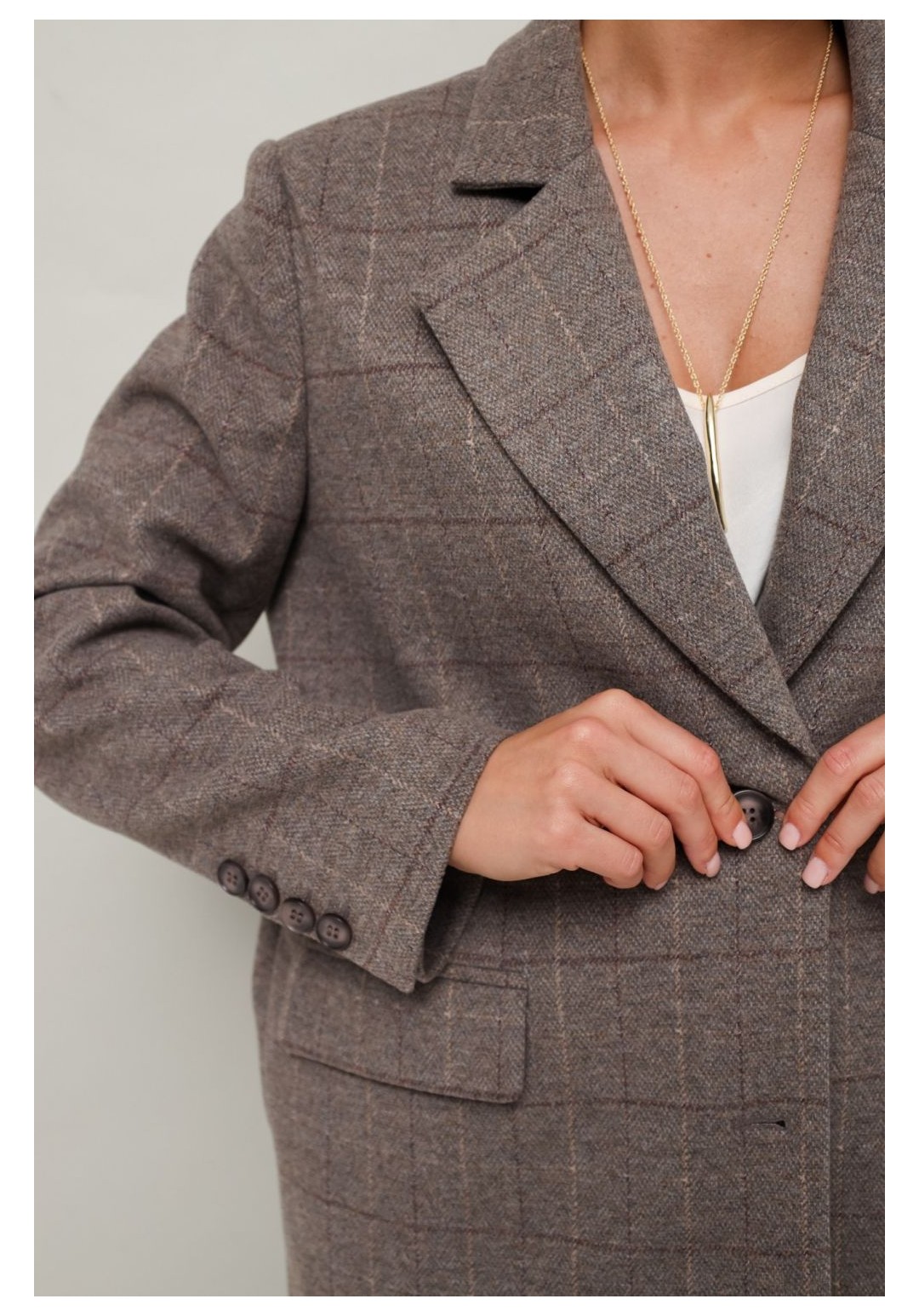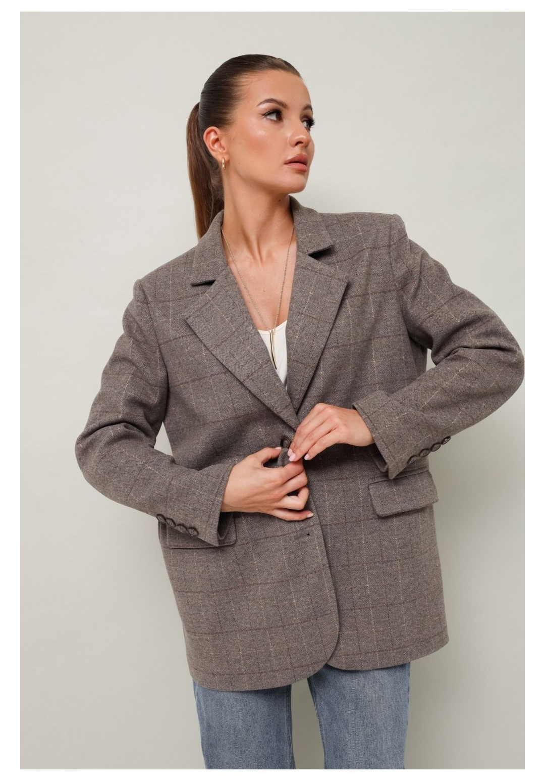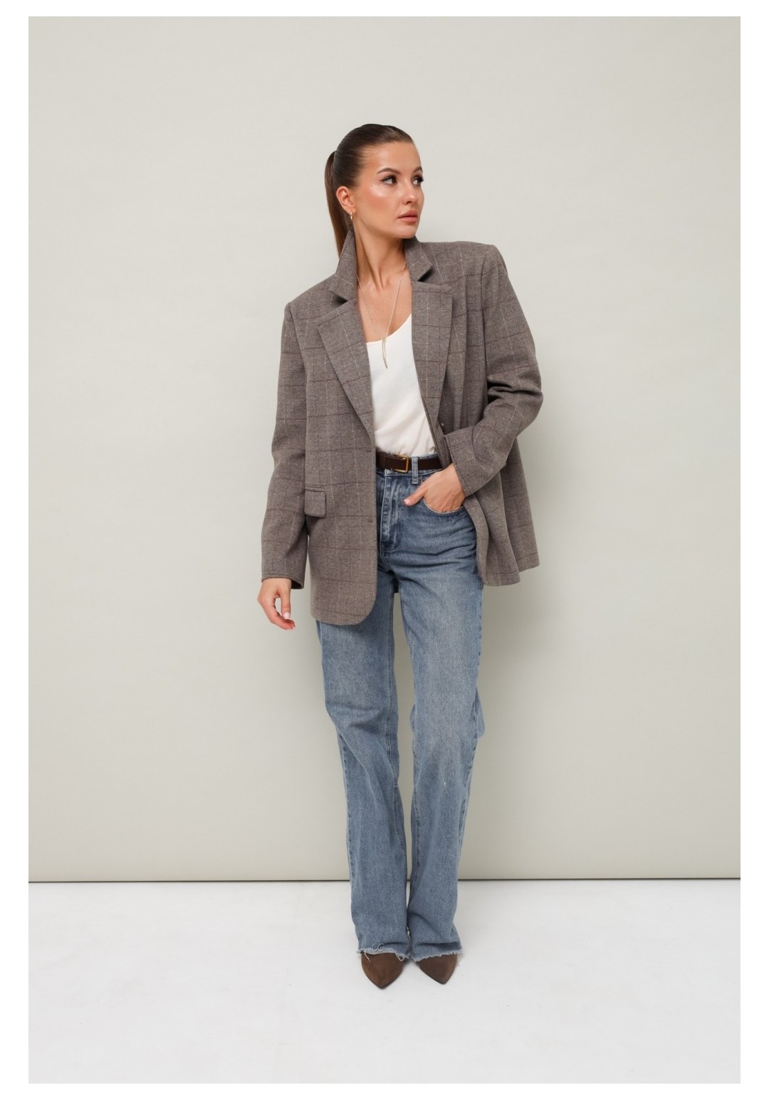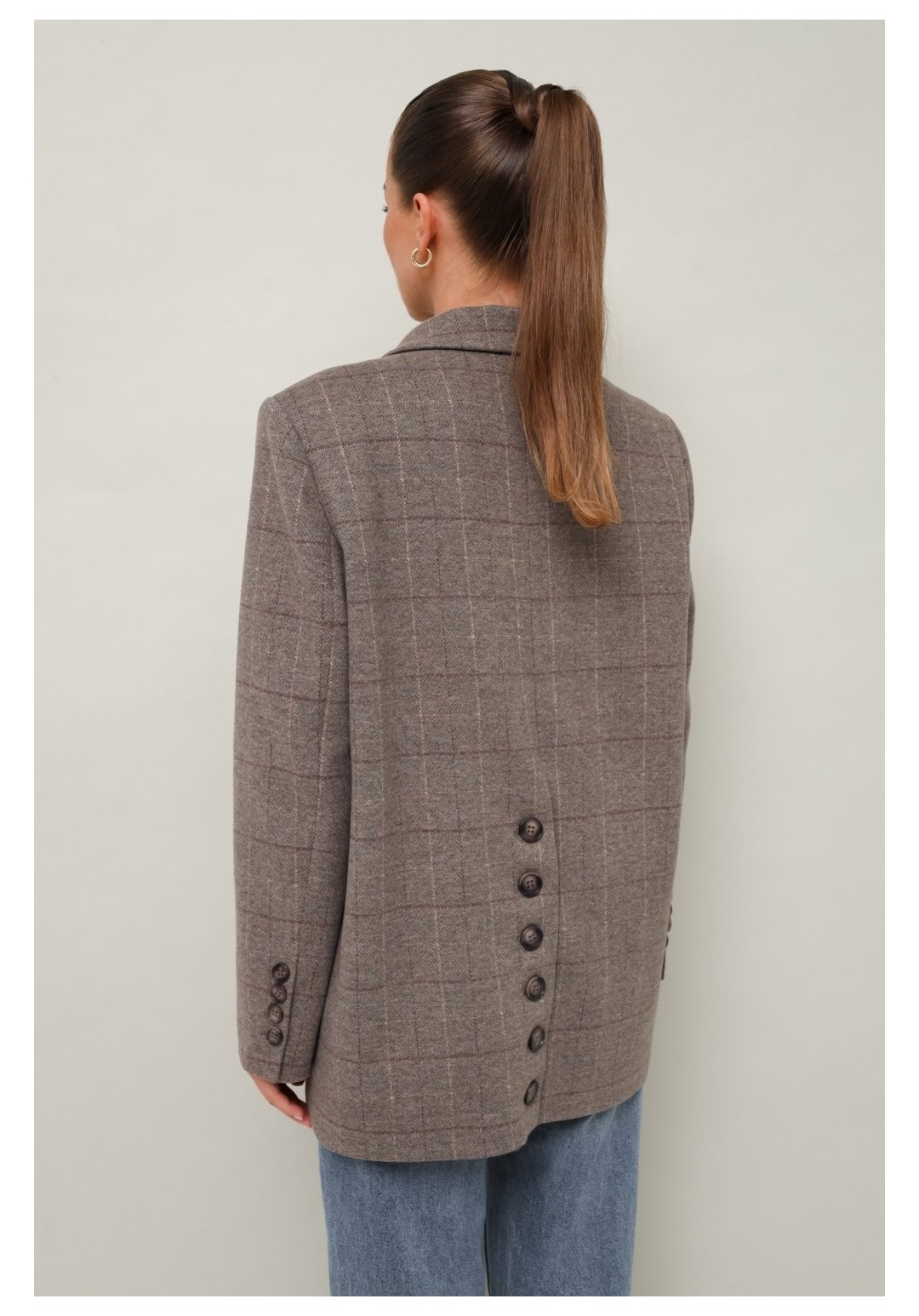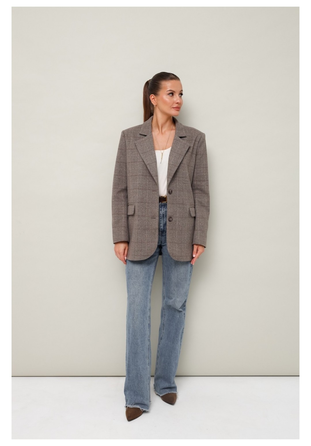 Жакет актуального прямого кроя, выполнен из костюмной ткани. Воротник пиджачного типа с отложными лацканами, край борта скругленный по низу жакета. Спереди обработаны прорезные карманы в рамку с клапанами. Рукава втачные двухшовные со шлицей и пуговицами. Спинка со средним швом, переходящим в высокую шлицу с застежкой на петли и пуговицы. Жакет на подкладке.
