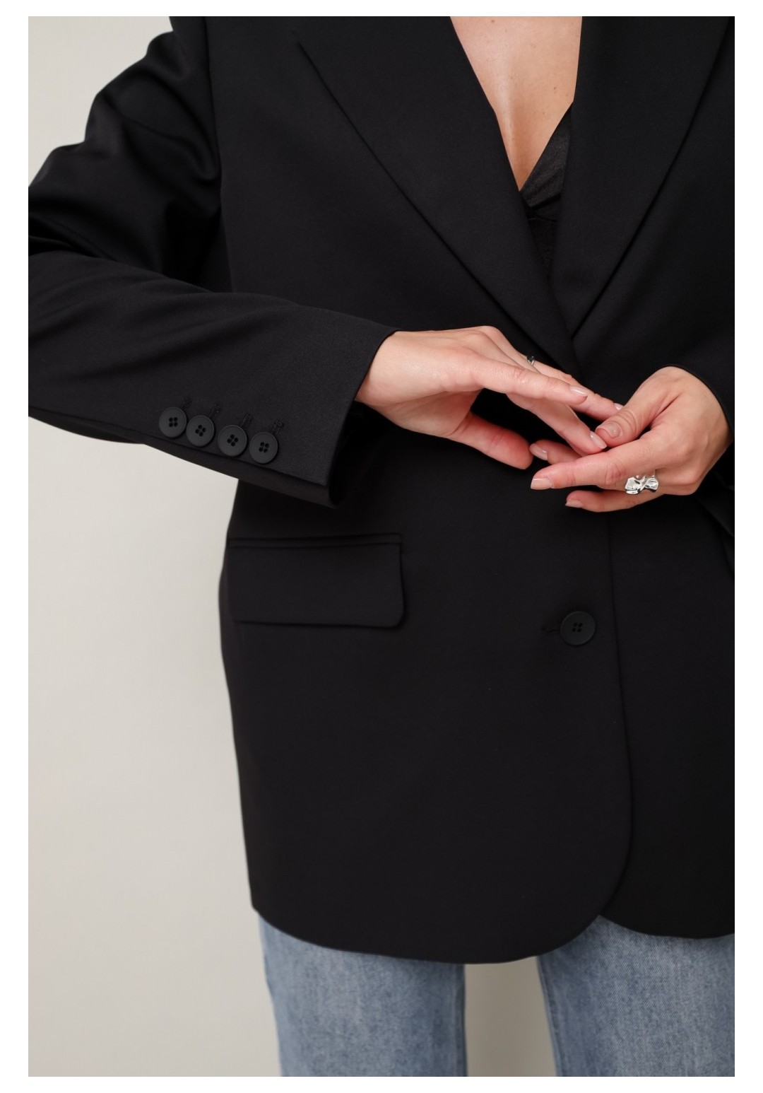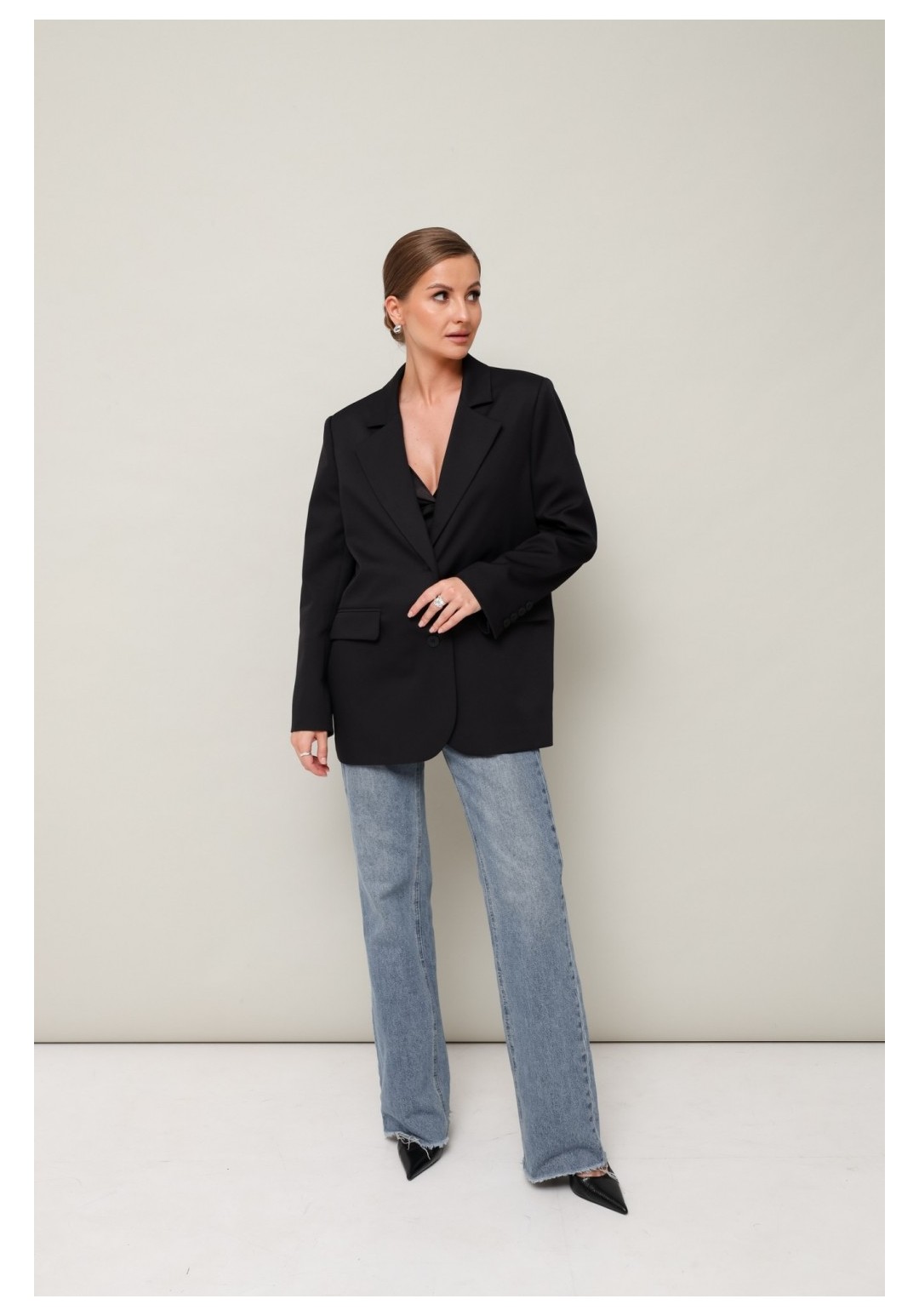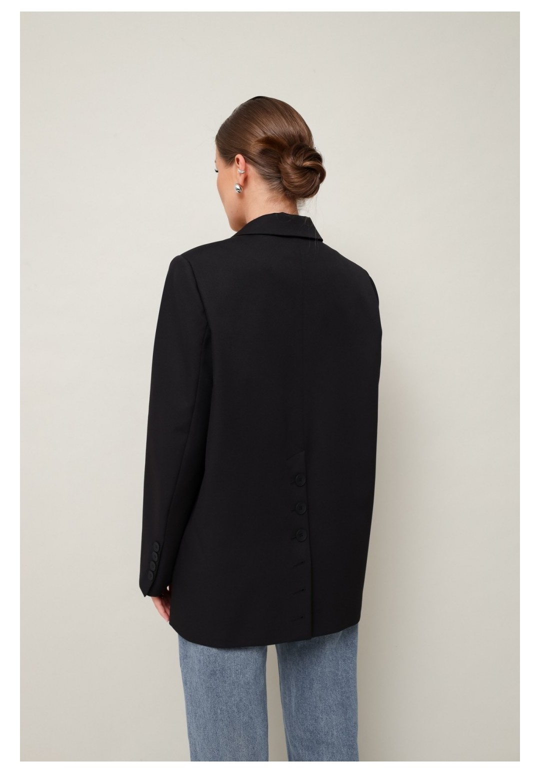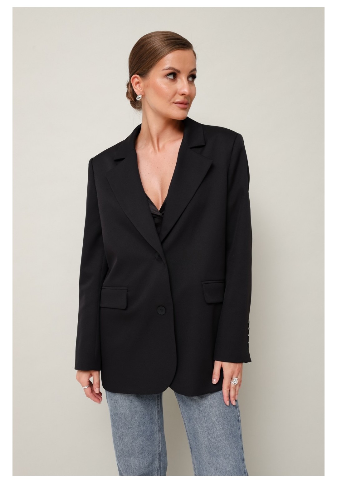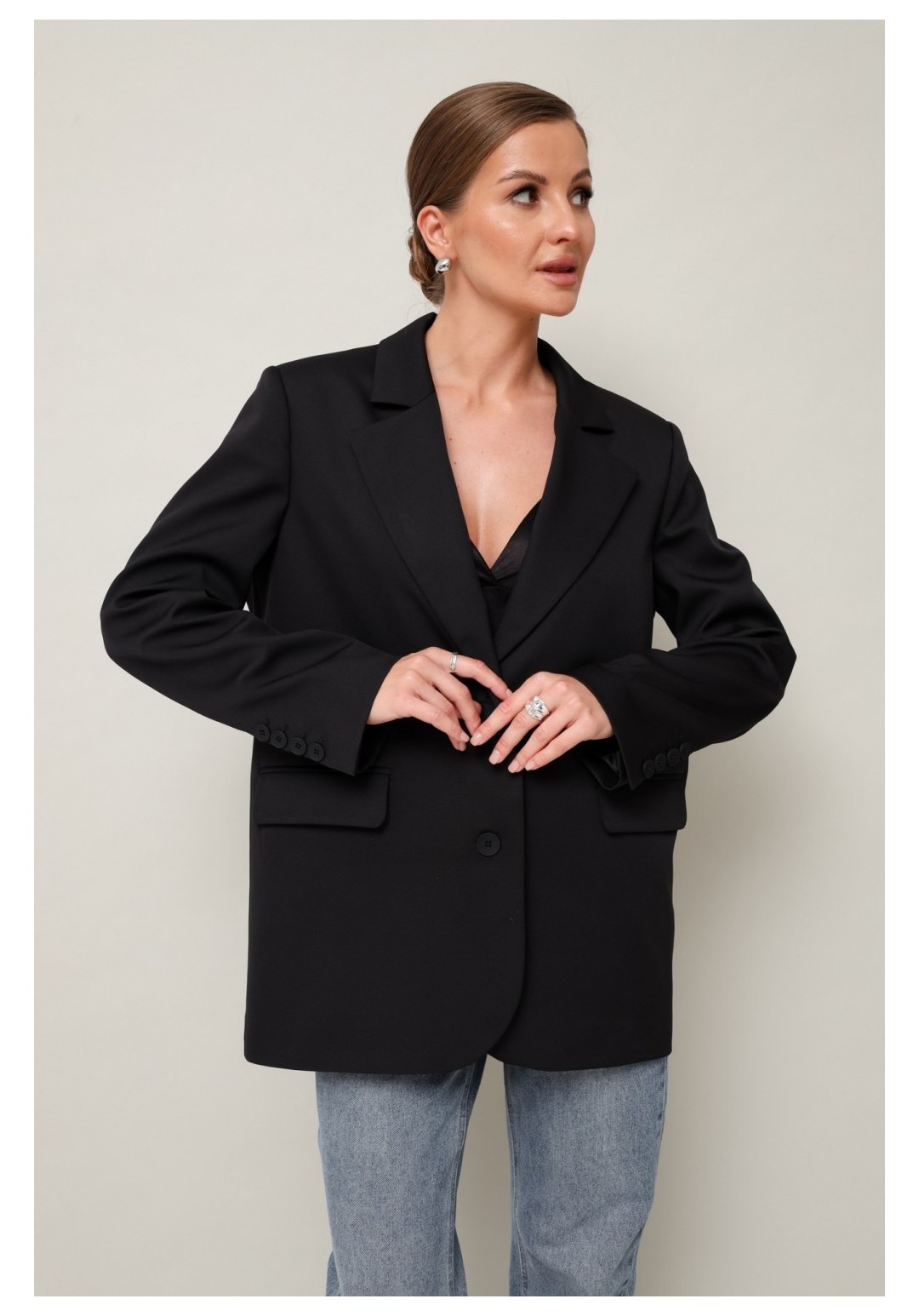Жакет актуального прямого кроя, выполнен из костюмной ткани. Воротник пиджачного типа с отложными лацканами, край борта скругленный по низу жакета. Спереди обработаны прорезные карманы в рамку с клапанами. Рукава втачные двухшовные со шлицей и пуговицами. Спинка со средним швом, переходящим в высокую шлицу с застежкой на петли и пуговицы. Жакет на подкладке.
