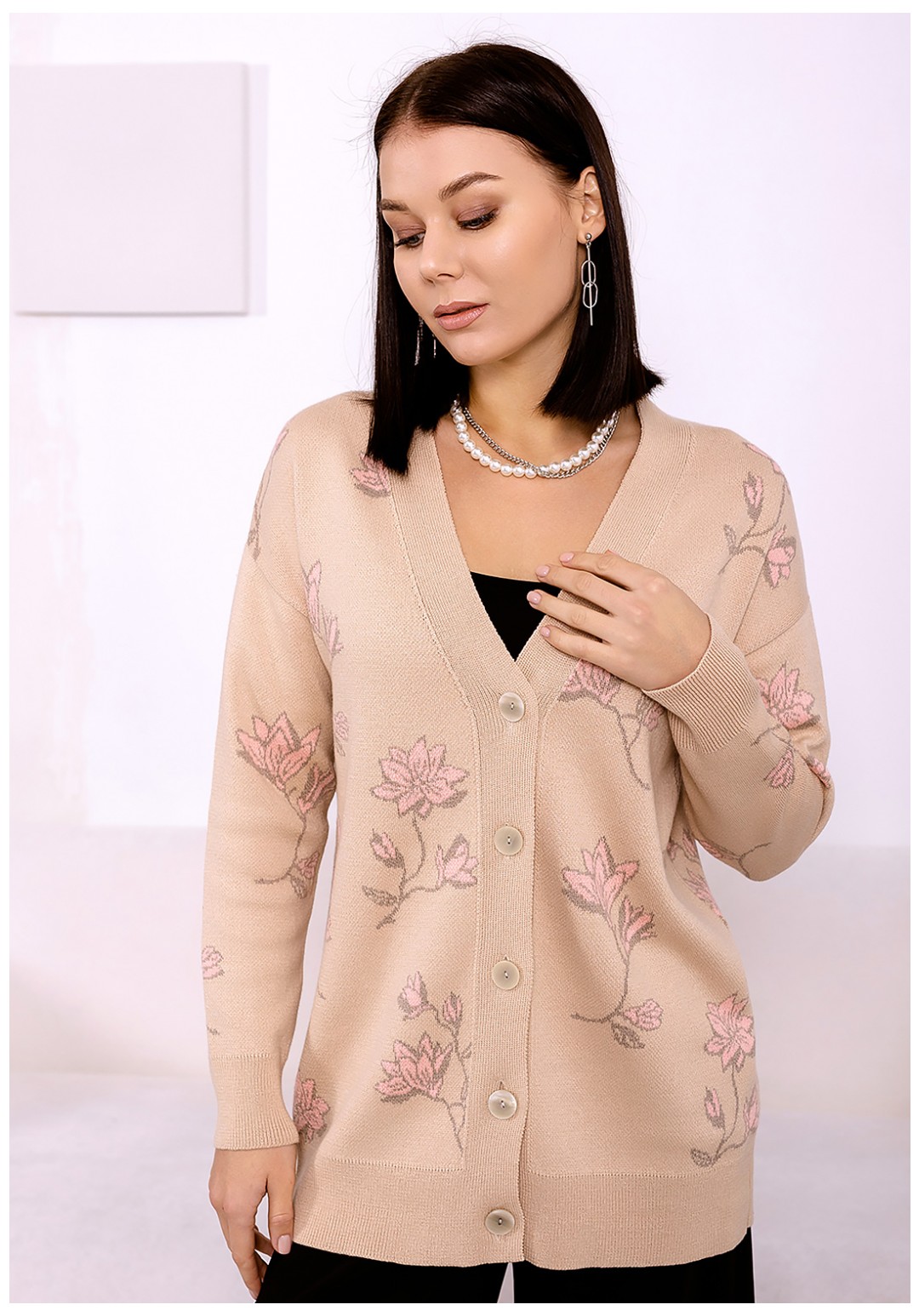 Кардиган прямого силуэта со спущенной линией плеча. Рукав длинный. Форма горловины переда - V-образная. Планка борта цельновязанная с передом, переходит в стойку для обработки горловины спинки.Застёжка центральная на петли и пуговицы.Кардиган связан жаккардовым переплетением. По переду, спинке и рукавам вывязаны цветы ,этот акцент обязательно выделит Вас из толпы. Низ изделия и низ рукавов связаны ластиком. Кардиган изготовлен из пряжи, в составе которой хлопок 50%, ПАН 50%.