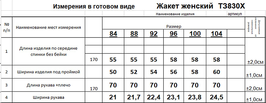 Таблица размеров