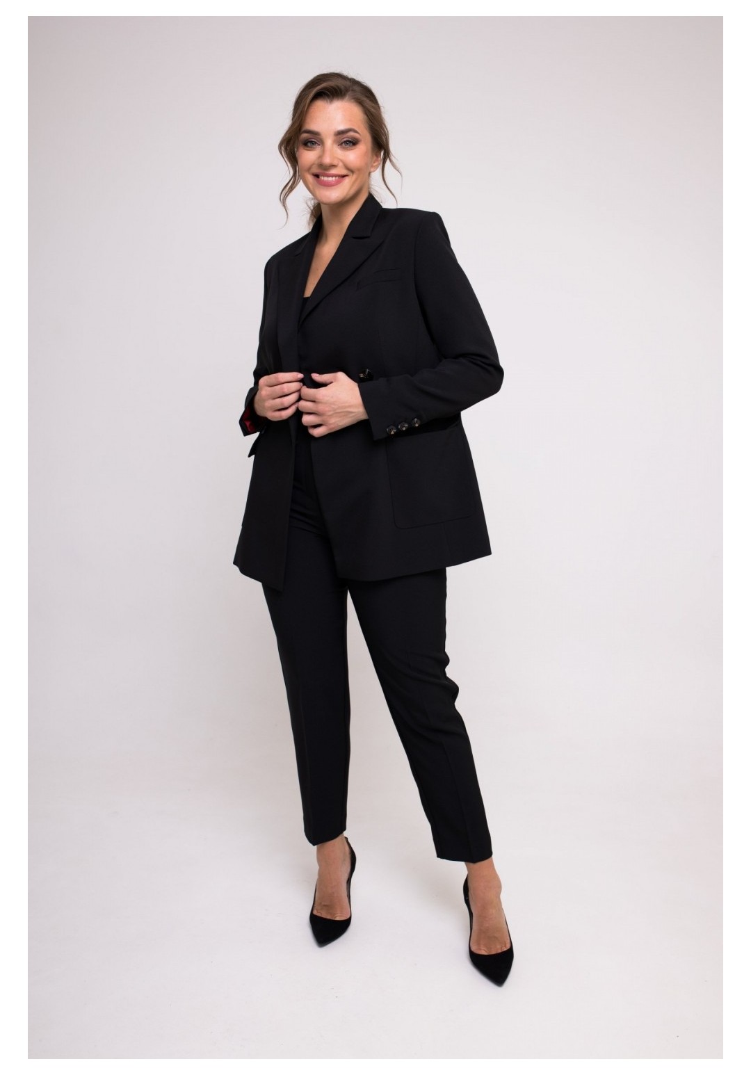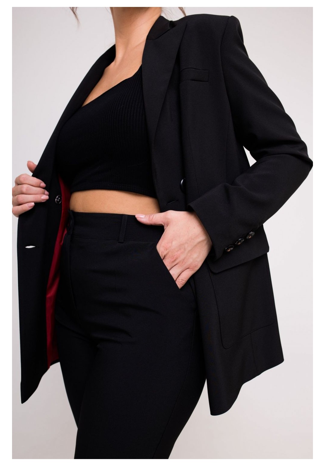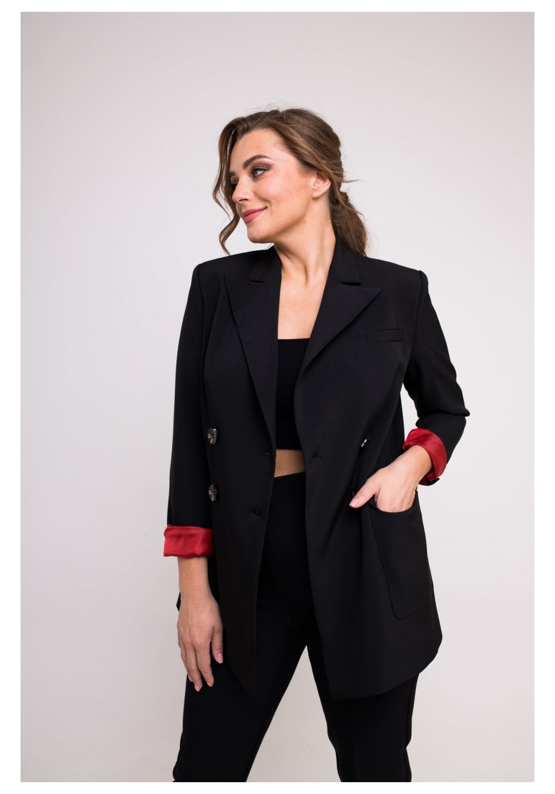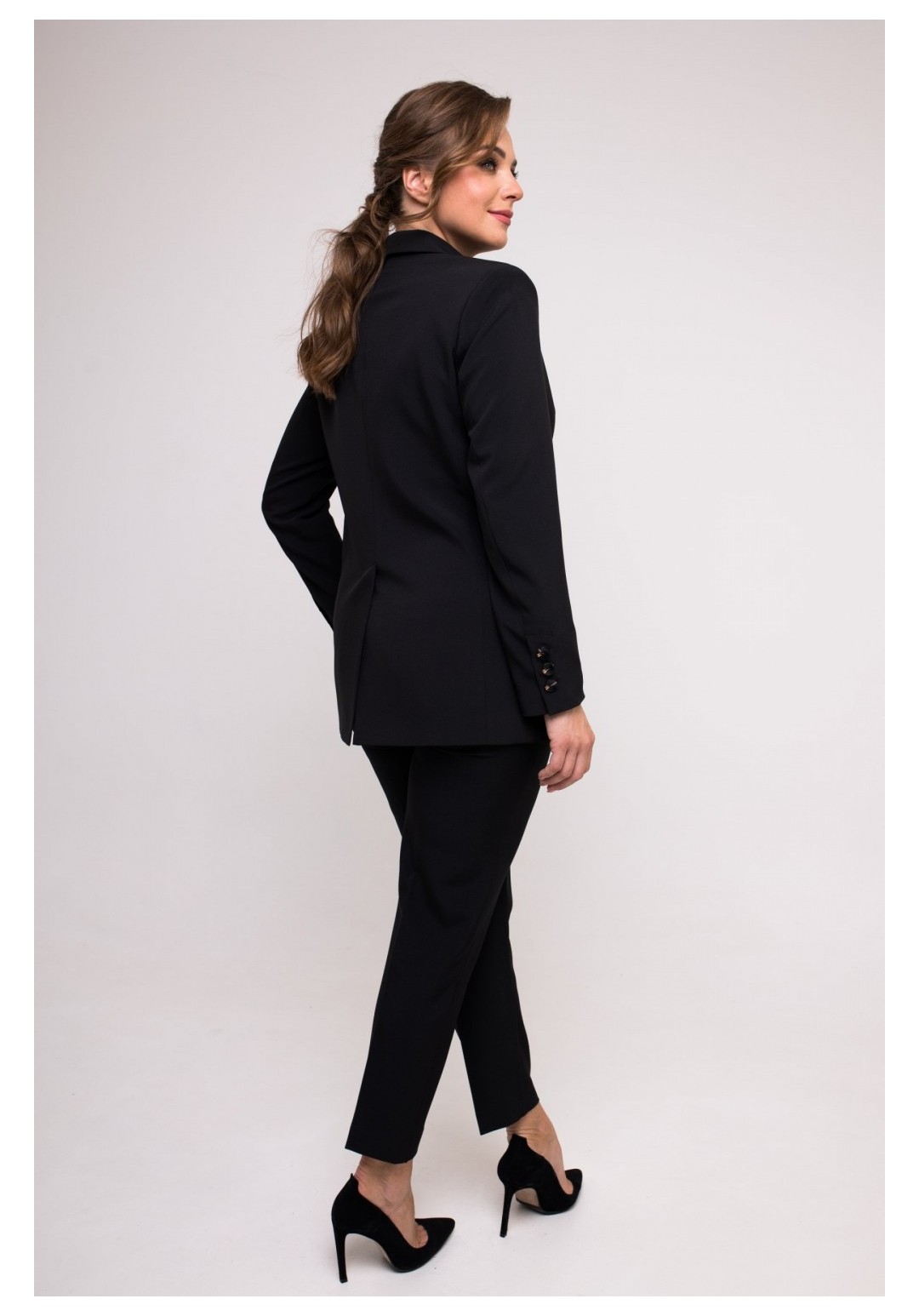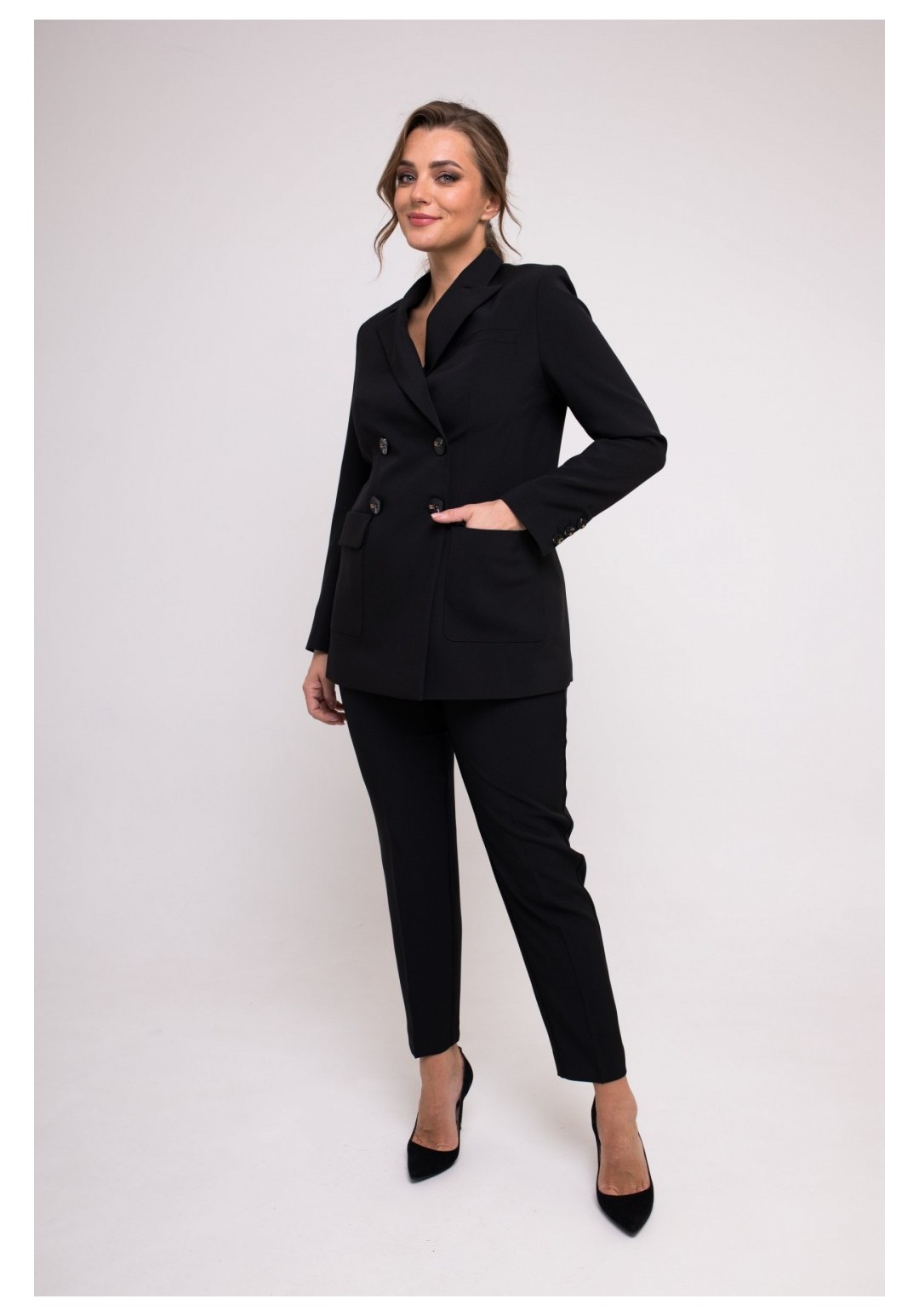 Жакет женский прямого силуэта из модной ткани . Перед с рельефами, с функциональными накладными карманами. С левой стороны переда карман -обманка. По центру переда двубортная застежка на две петли и две пуговицы и на одну потайную петлю и одну потайную пуговицу. Спинка с рельефами, со средним швом переходящим в шлицу. Рукав втачной, двухшовный, длинный. по низу рукава шлица на три петли три пуговицы. Воротник пиджачного типа. Изделие на подкладке.