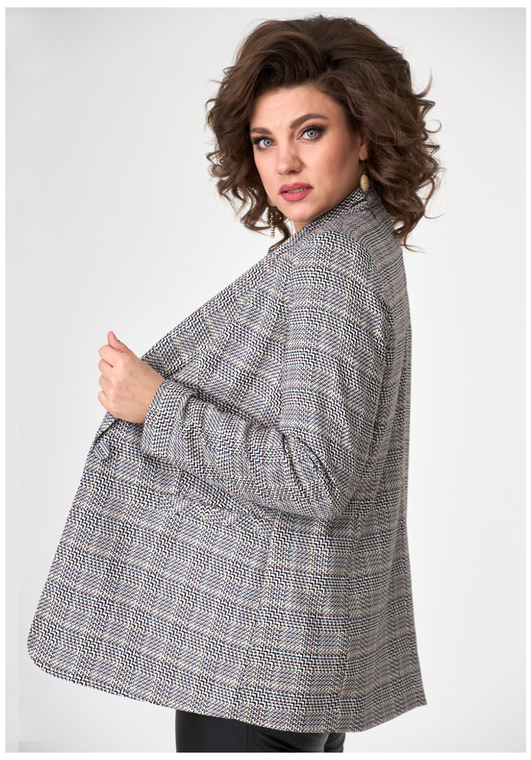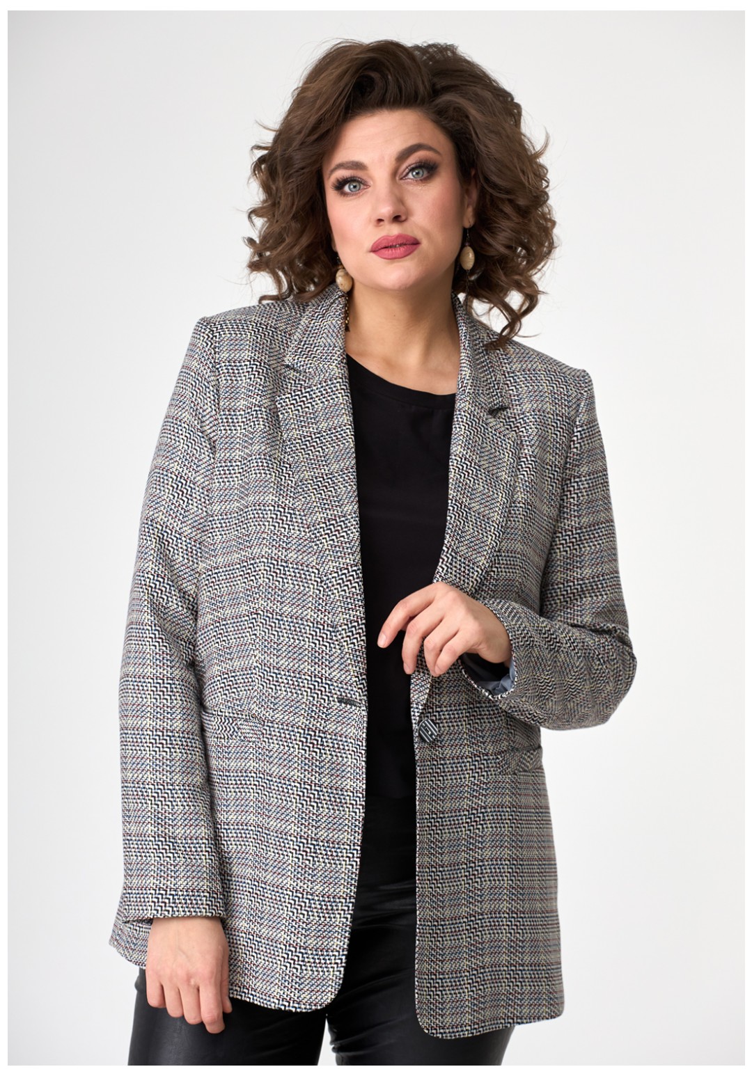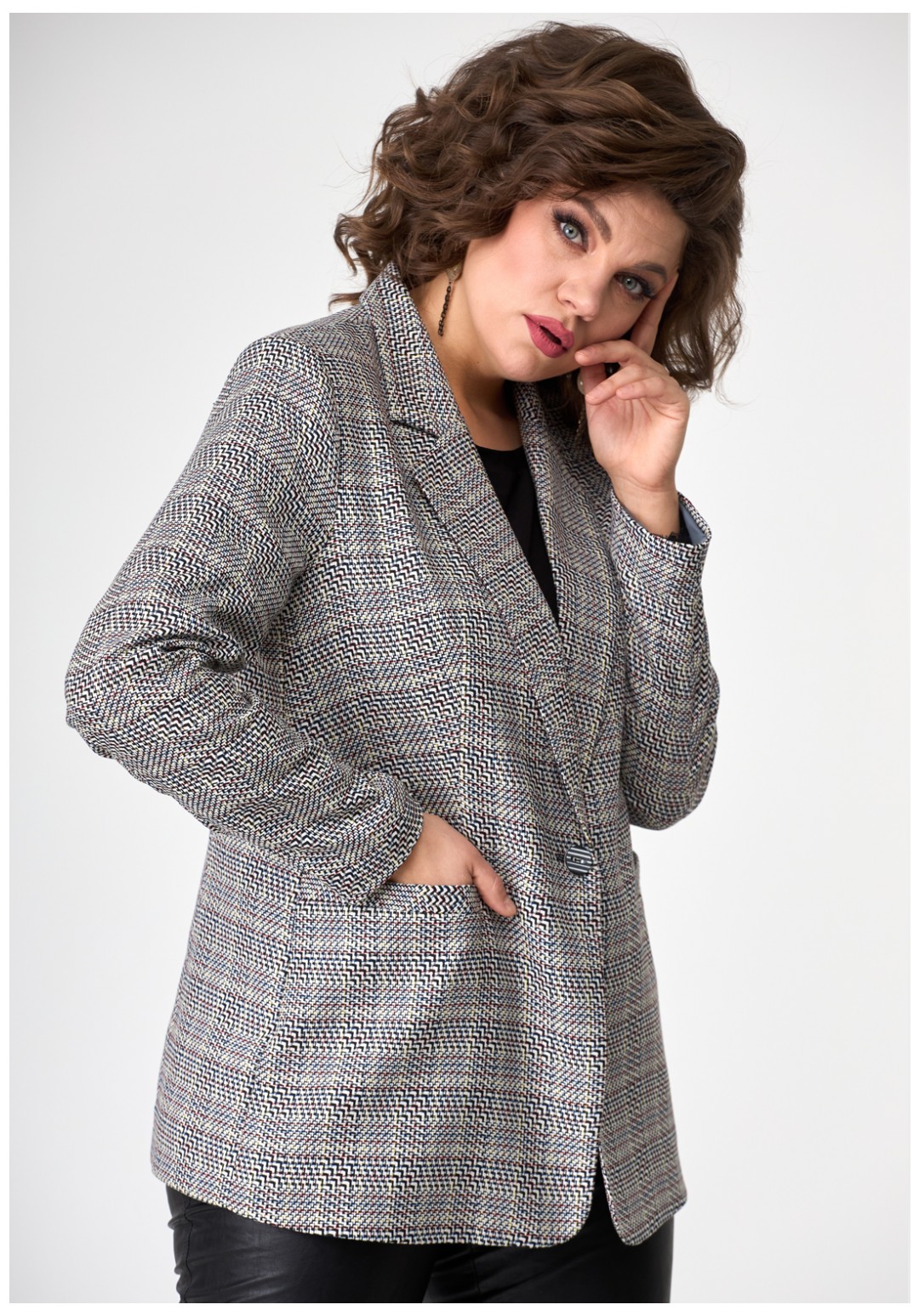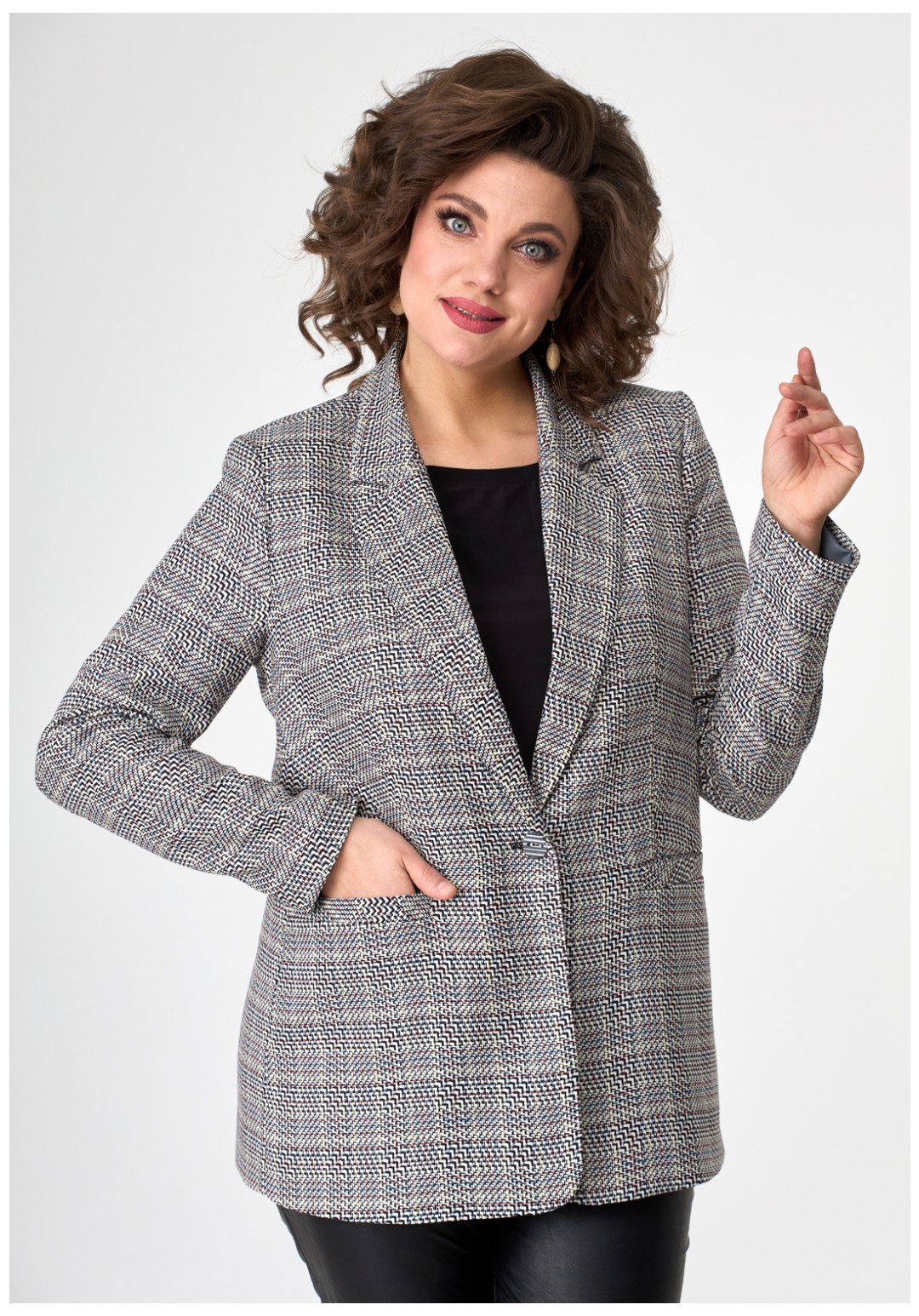 Молодежный свободный жакет из современной меланжированной ткани с воротником и лацканами, застегивается на одну пуговицу, с прорезными карманами по переду. Рукав длинный втачной двушовный.