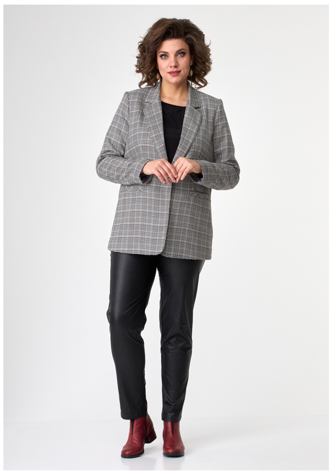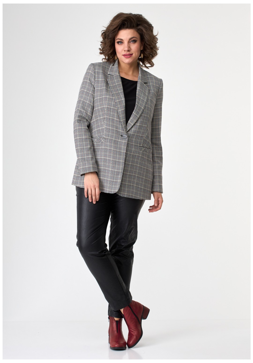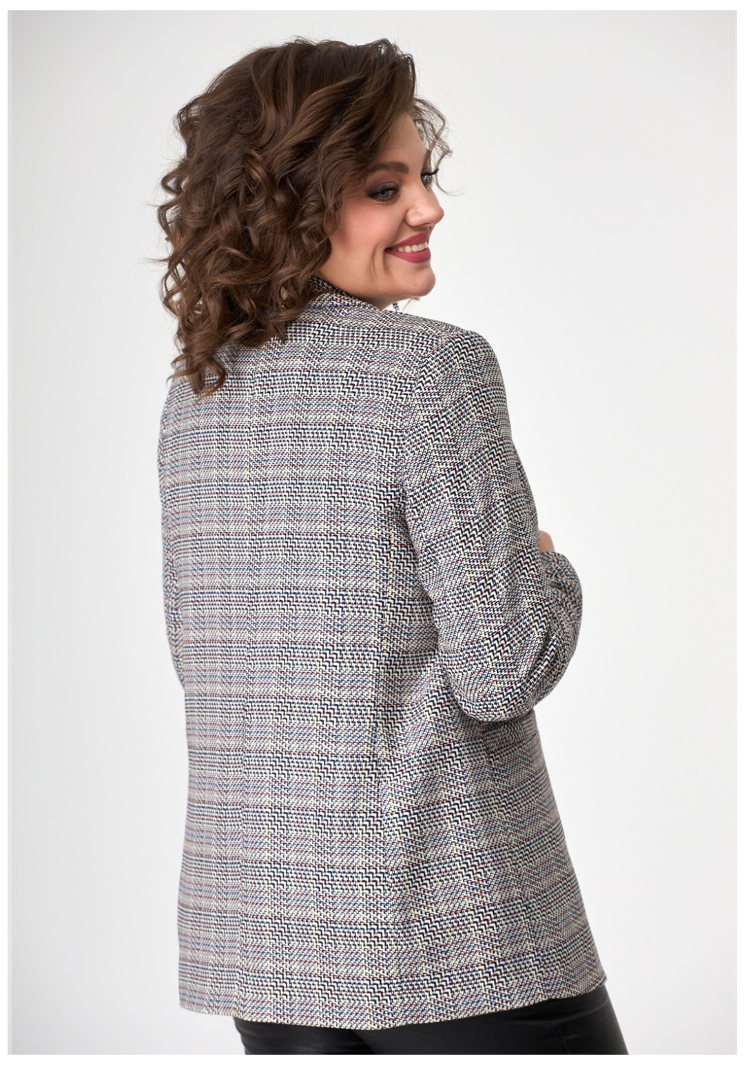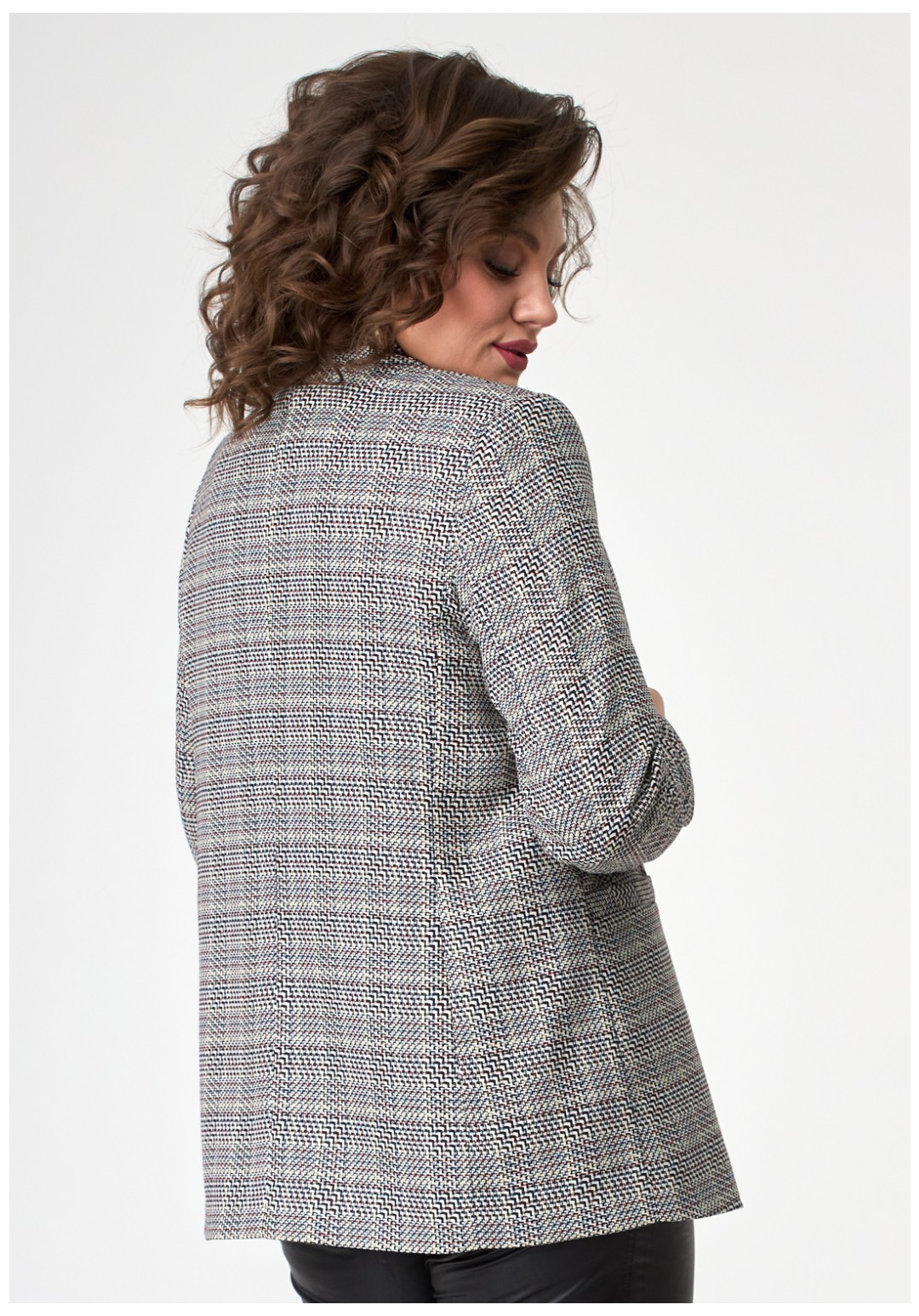 Молодежный свободный жакет из современной меланжированной ткани с воротником и лацканами, застегивается на одну пуговицу, с прорезными карманами по переду. Рукав длинный втачной двушовный.