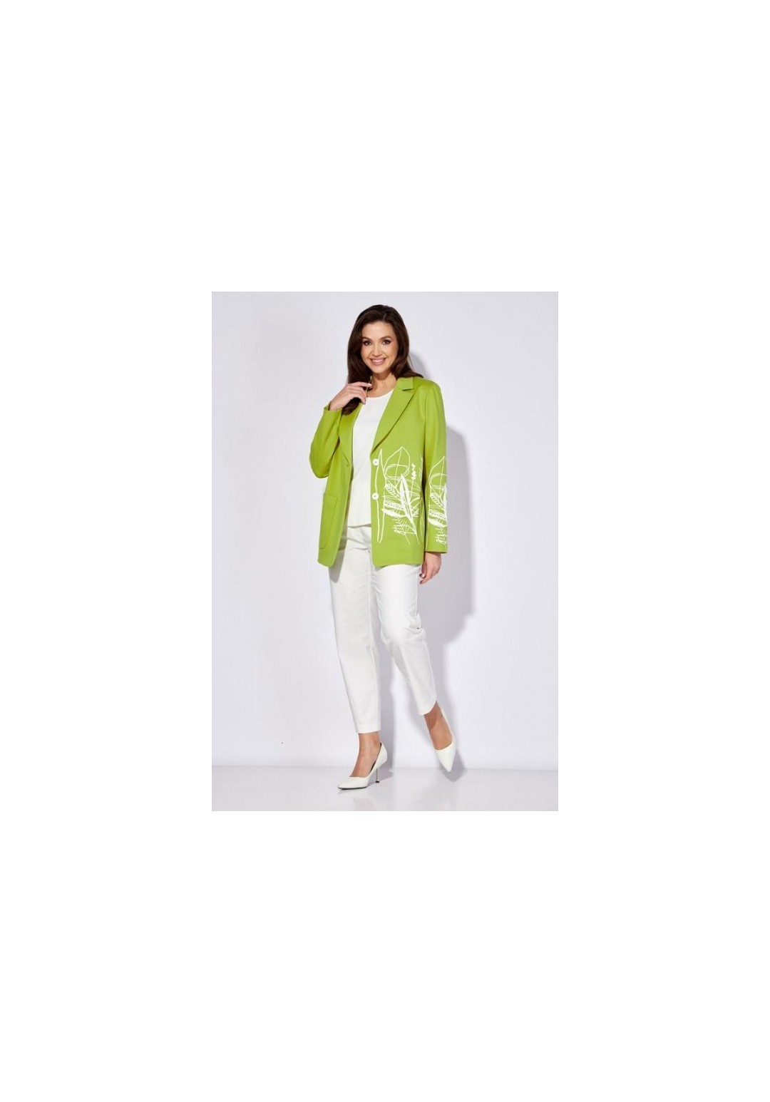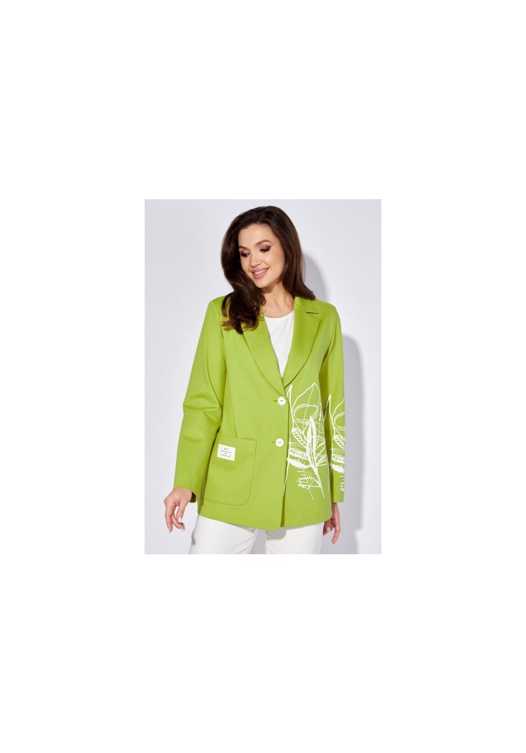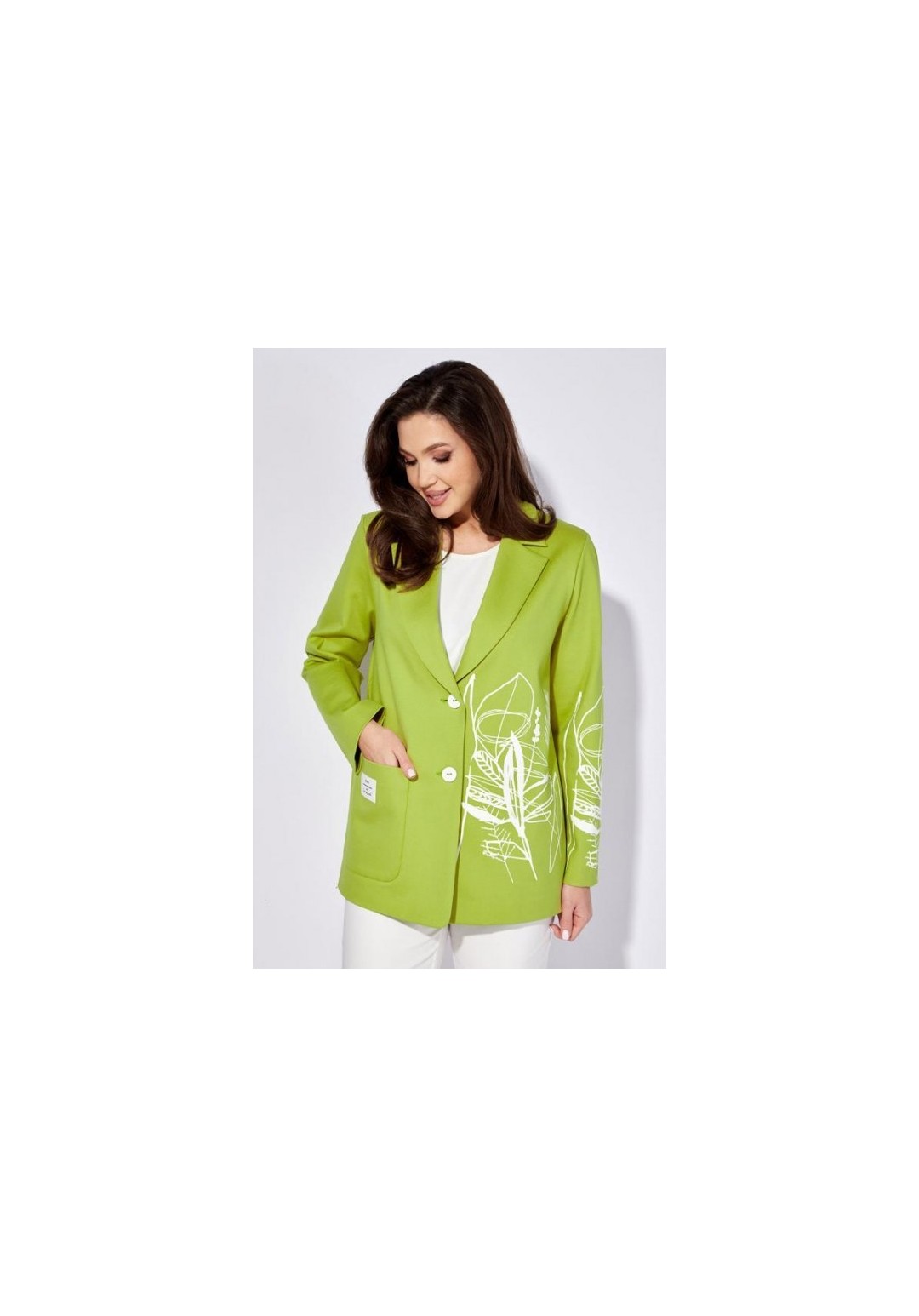 Жакет женский, облегченный, выполнен из трикотажного полотна, без подкладки, прямого силуэта с длинным втачным рукавом. Воротник пиджачного типа с лацканами. Застежка однобортная на петли и пуговицы. Левая полочка и рукав акцентированы ярким принтом. На правой полочке накладной карман с декоративной нашивкой. Спинка со средним швом.