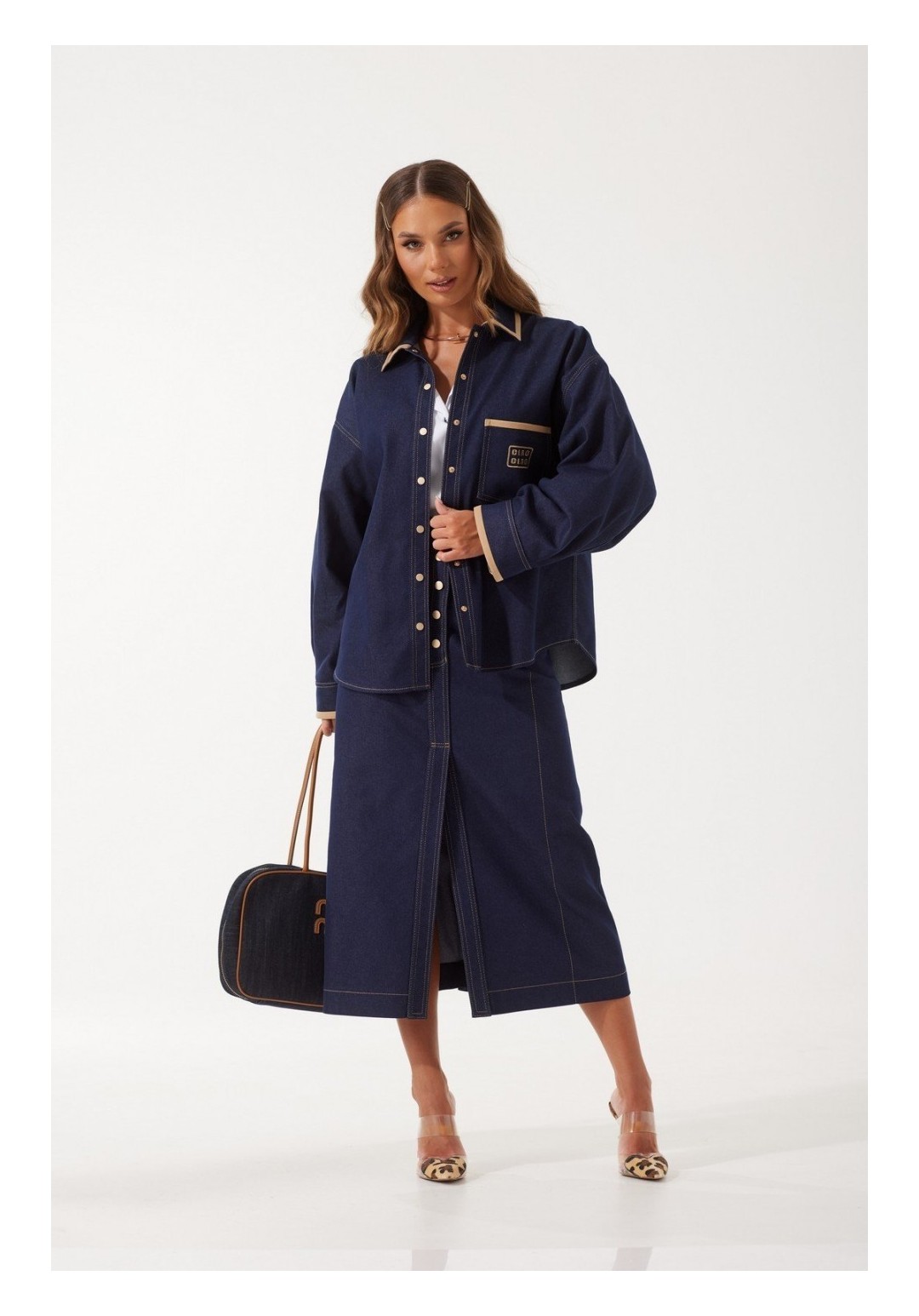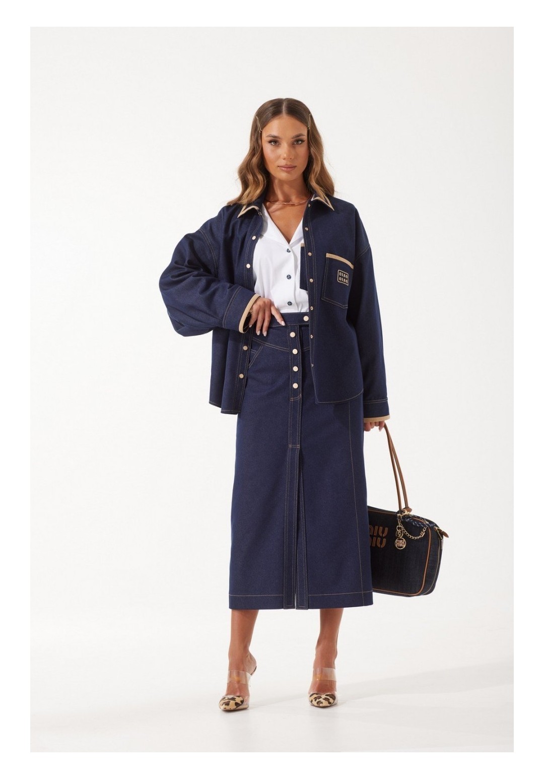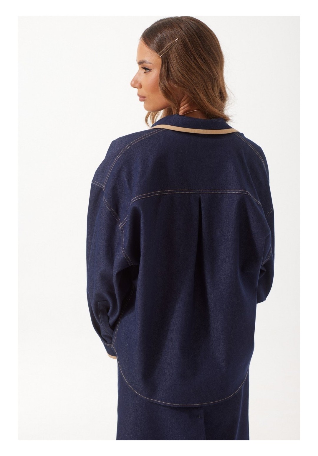 Элегантный джинсовый жакет темно-синего цвета объединяет в себе стиль и комфорт. Модель с рубашечным воротником и застежкой на кнопки спереди предлагает непринужденный, но продуманный вид. Особенностью дизайна является расширенная линия плеча и рукава широкого кроя с регулируемыми по ширине манжетами на кнопках. Элементы из контрастной ткани украшают воротник, низ манжет и карман на передней части. Накладной карман дополнен изысканной вышивкой, добавляя жакету уникального шарма. Рукав длиной 75 см идеально сочетается с широкой формой модели, создавая ощущение расслабленной роскоши. Этот жакет станет идеальным дополнением к гардеробу, подчеркивающим индивидуальность и чувство стиля.