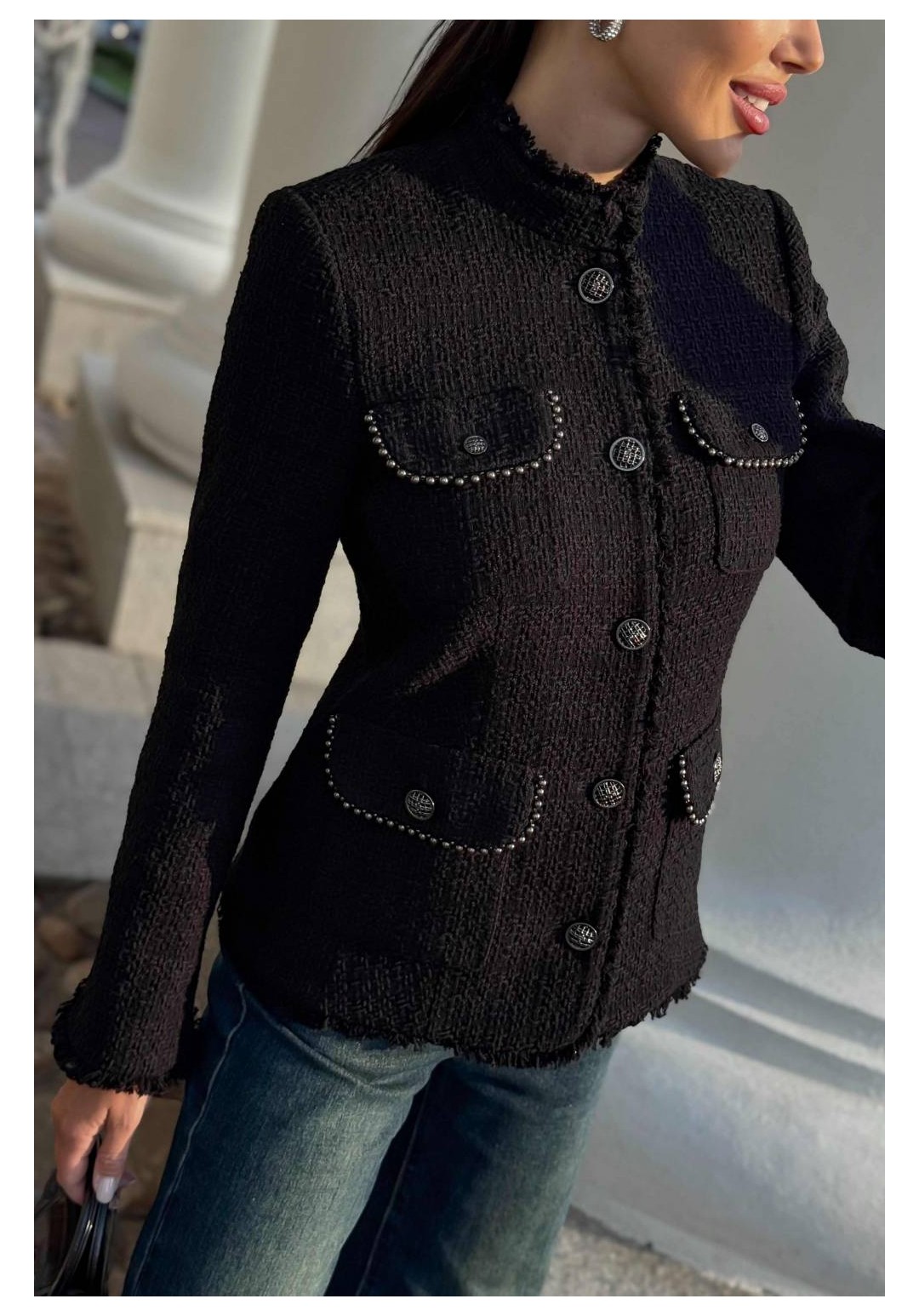 Этот жакет в стиле Шанель выполнен из черного твида, что придает ему особый шарм и элегантность. Красивая отделка и фурнитура дополняют образ, делая его еще более изысканным. Жакет идеально подойдет для создания строгого, но в то же время женственного образа. Он прекрасно сочетается с платьями и юбками, а также с джинсами и брюками. Благодаря качественным материалам и мастерству исполнения, жакет сохранит свою форму и внешний вид на долгое время. В этом жакете вы будете выглядеть стильно и уверенно в любой ситуации. Жакет женский полуприлегающего силуэта на подкладке, нарядный. Жакет с центральной бортовой застежкой на 5 петель и пуговиц (фурнитура может незначительно отличаться от фото). Перед с отрезным бочком и талиевой вытачкой. На переде расположены 2 пары накладных карманов с клапаном, по низу карманы немного больше, карманов расположенных на уровне груди. Карманы, клапаны и низ борта закругленной формы. По краю клапанов идет декоративная отделочная тесьма, карманы застегиваются на петлю и пуговицу. Спинка со средним швом и отрезными бочками. Рукава втачные двухшовные длинные по низу локтевого шва обработан разрез с закругленными краями. Плечевой пояс оформлен плечевыми накладками. Горловина обработана воротником стойкой. По низу рукавов, борту жакета, низу и стойке идет отделка бахромой. Средняя длина жакета - 60,5 см (±3,0 см), средняя длина рукава - 61,0 см (±3,0 см).