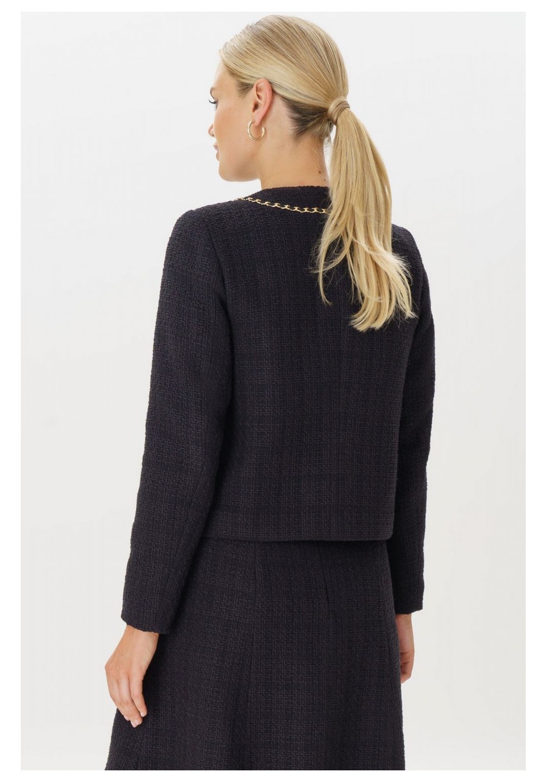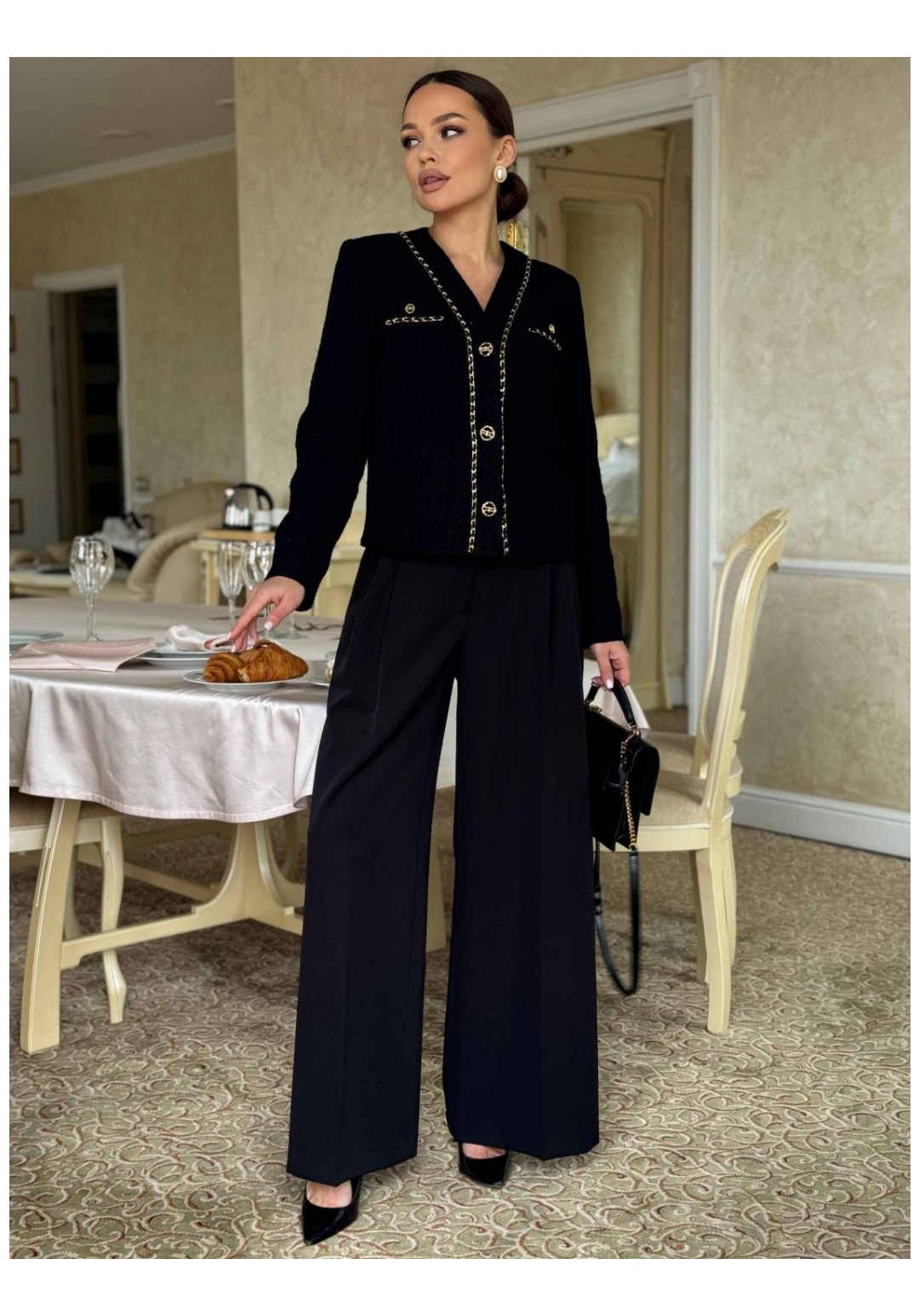 Шикарный черный жакет с цепью, декорированный в стиле Шанель, придаст вашему образу изысканность и элегантность. Этот жакет идеально подходит для создания стильного и современного образа в стиле casual или business casual. Сочетайте его с любимыми брюками или юбкой, или наденьте поверх платья для создания неповторимого вечернего образа. Черный цвет жакета является классическим и универсальным, что позволяет легко сочетать его с другими элементами гардероба. Не бойтесь экспериментировать и искать новые образы, ведь стиль Шанель - это свобода творчества и индивидуальность. Будьте уверены, в таком жакете вы всегда будете в центре внимания и продемонстрируете свой безупречный вкус. Жакет женский с центральной бортовой застежкой на планку на 3 петли и пуговицы (фурнитура может незначительно отличаться от фото). По переду стачаны нагрудные вытачки идущие от бокового шва. На уровне линии груди накладные карманы, с отделкой в виде тесьмы и пуговицы (фурнитура может незначительно отличаться от фото). Горловина V- образной формы, обтачная. Спинка со средним швом и притачной планкой по горловине. По планке переда, горловине и карманам идет декоративная отделочная тесьма с цепью. Рукава втачные двухшовные длинные. Средняя длина жакета по среднему шву спинки - 52,0 см (±3,0 см), Средняя длина рукава - 60,5 см (±3,0 см).