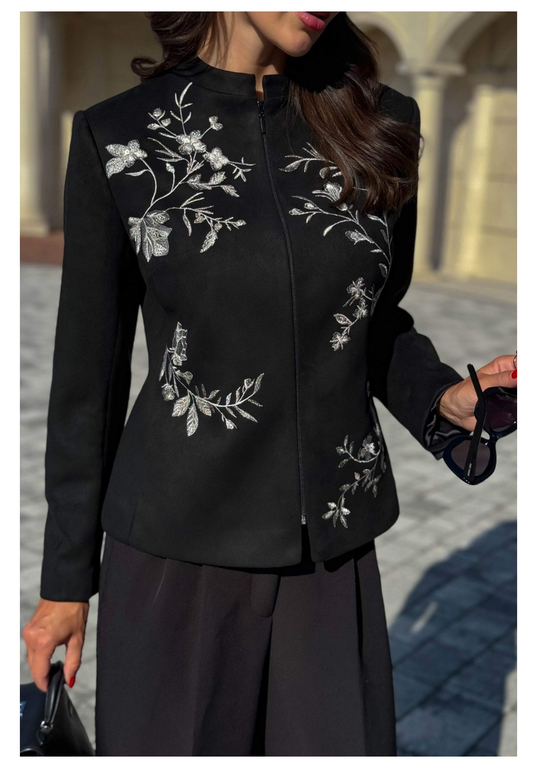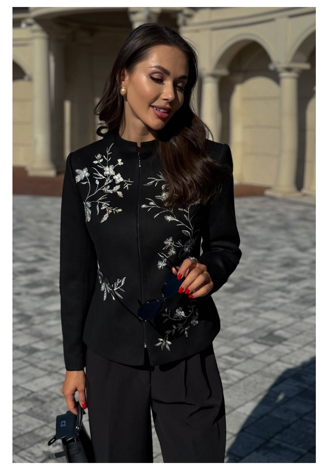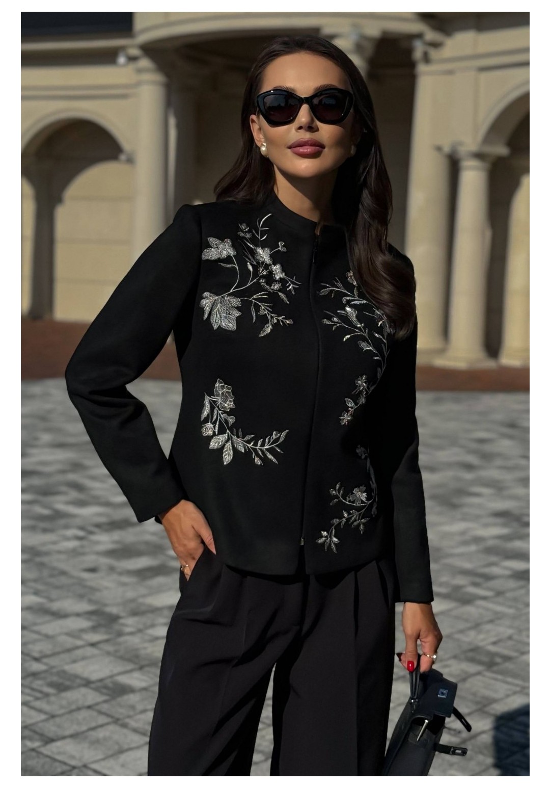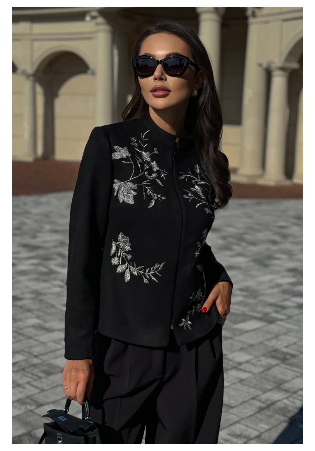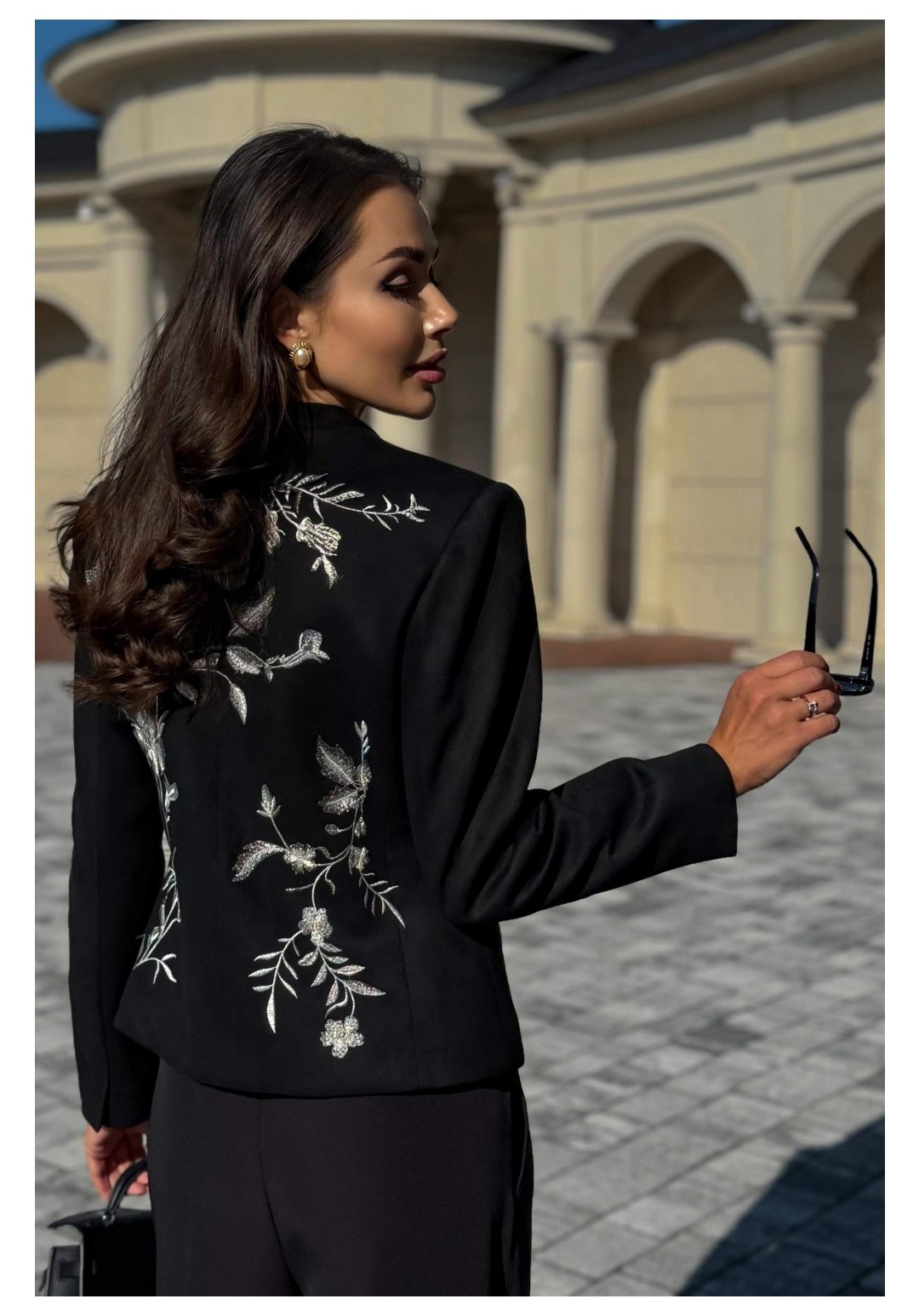 Этот изысканный жакет из искусственной замши – воплощение элегантности и современного стиля. Глубокий черный цвет ткани выгодно подчеркивает изящную вышивку с серебристыми цветочными мотивами, которая добавляет образу нотки роскоши и утонченности. Лаконичный крой с воротником-стойкой создает идеальный баланс между строгостью и женственностью, делая модель универсальной для любых случаев – от деловых встреч до вечерних мероприятий. Жакет подчеркивает статусность и безупречный вкус, прекрасно сочетаясь как с классическими брюками, так и с элегантной юбкой или платьем. Это выбор для тех, кто ценит стиль и комфорт в каждой детали. Жакет женский нарядный, полуприлегающего силуэта, выполнен из мягкой искусственной замши на трикотажной основе, с центральной бортовой застежкой встык с разъемной потайной молнией. Молния расположена на расстоянии 5,0 см от низа и заканчивается у воротника-стойки. Жакет на подкладке. Перед и спинка оформлены художественной вышивкой. Перед со смещенными рельефными швами, идущими из пройм до низа, с нагрудными вытачками от рельефов. Спинка с рельефными швами, идущими из пройм до низа и средним швом. Горловина оформлена воротником-стойкой. Рукава втачные, двухшовные, длинные, по низу локтевых швов с отлетными шлицами. Жакет с плечевыми накладками.