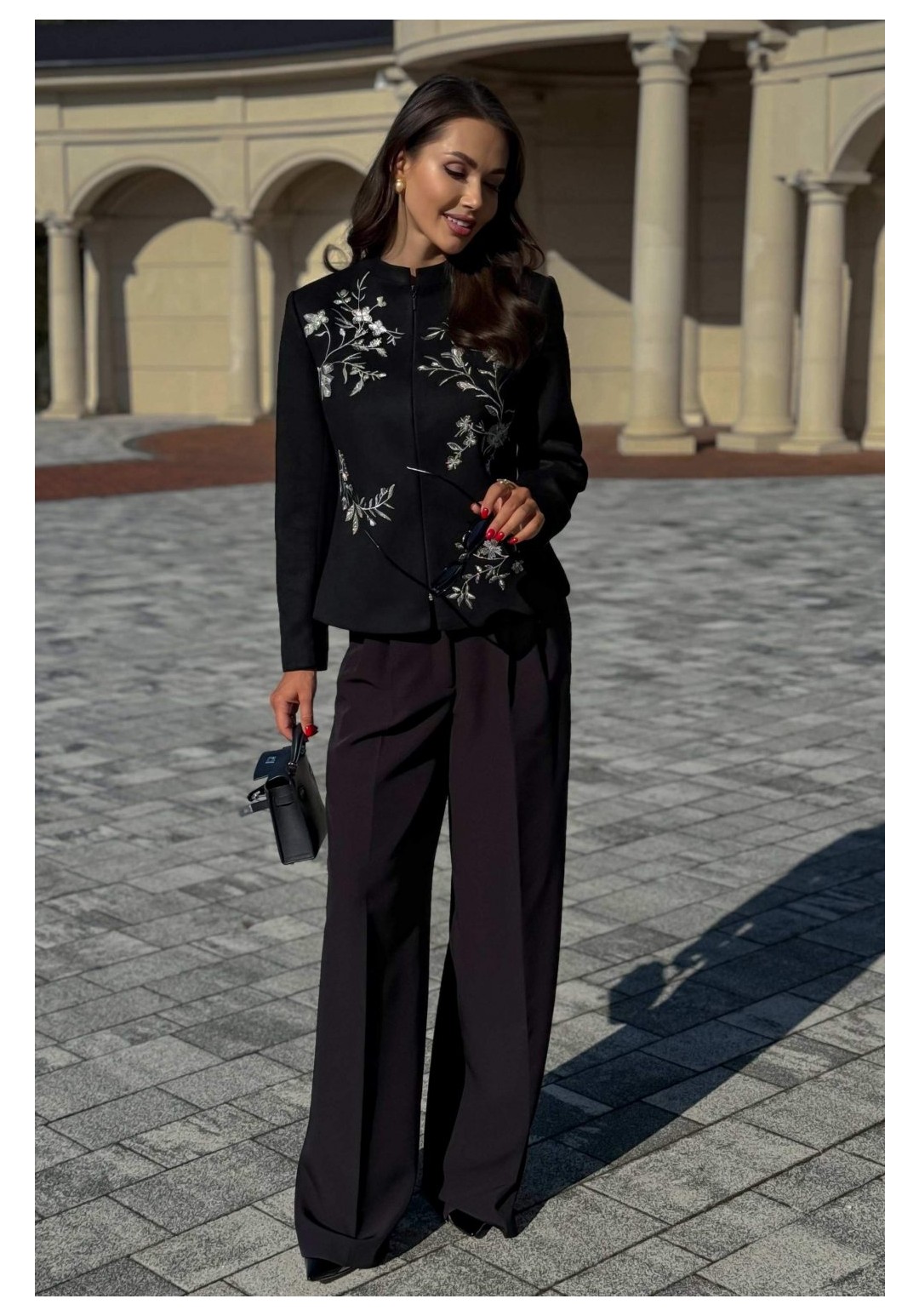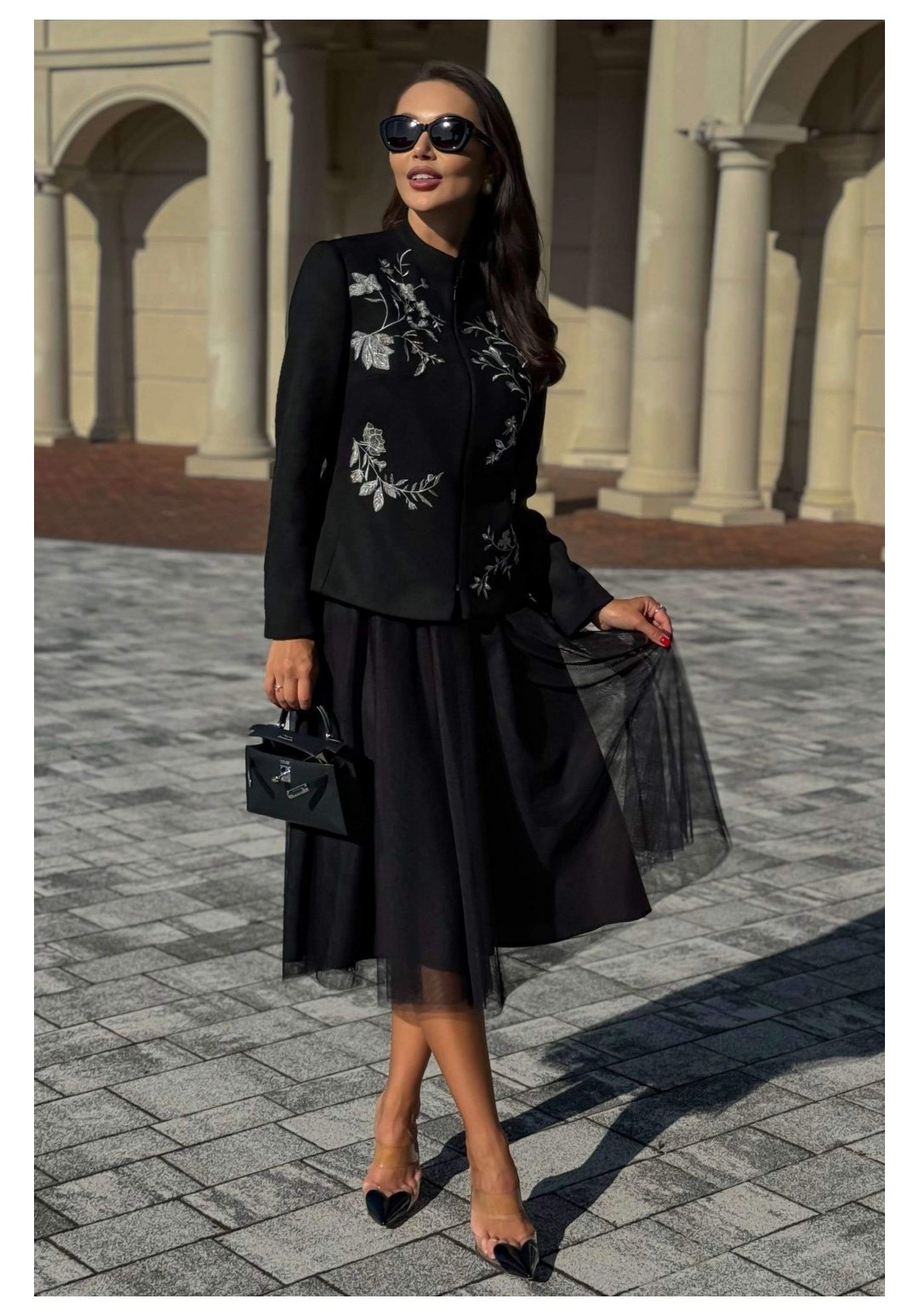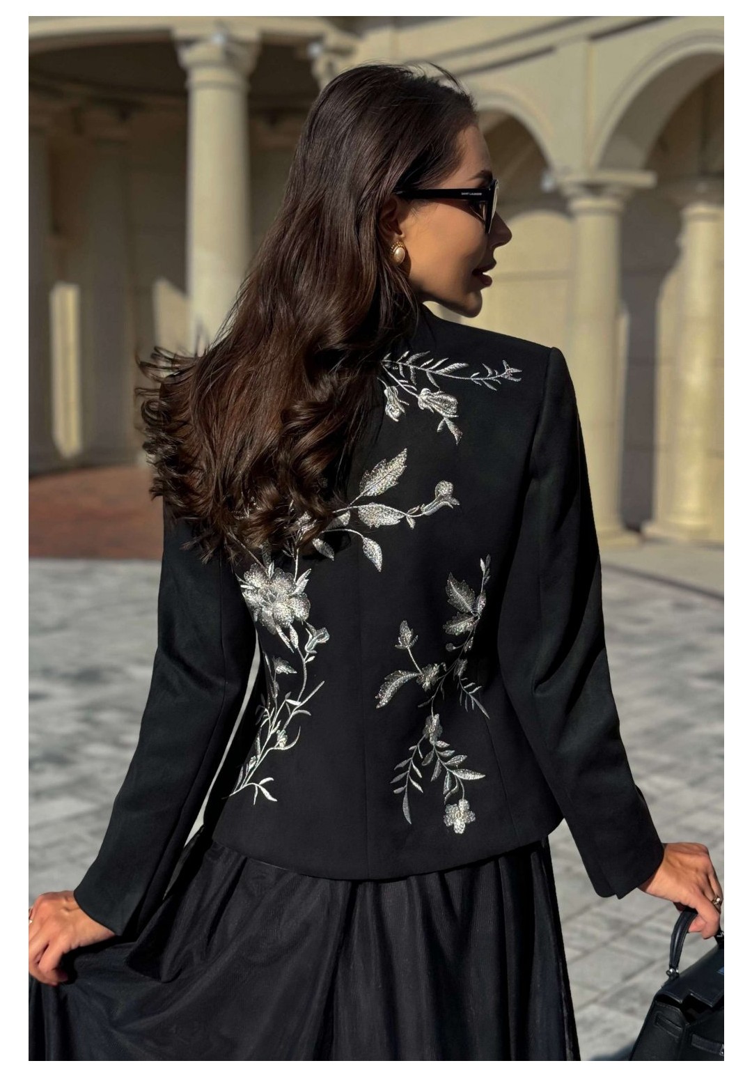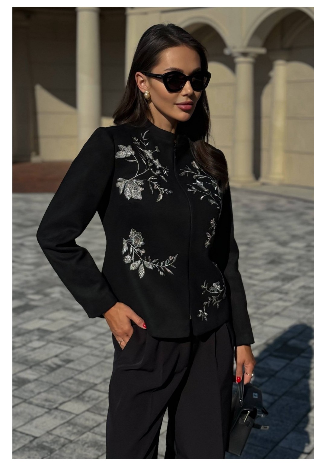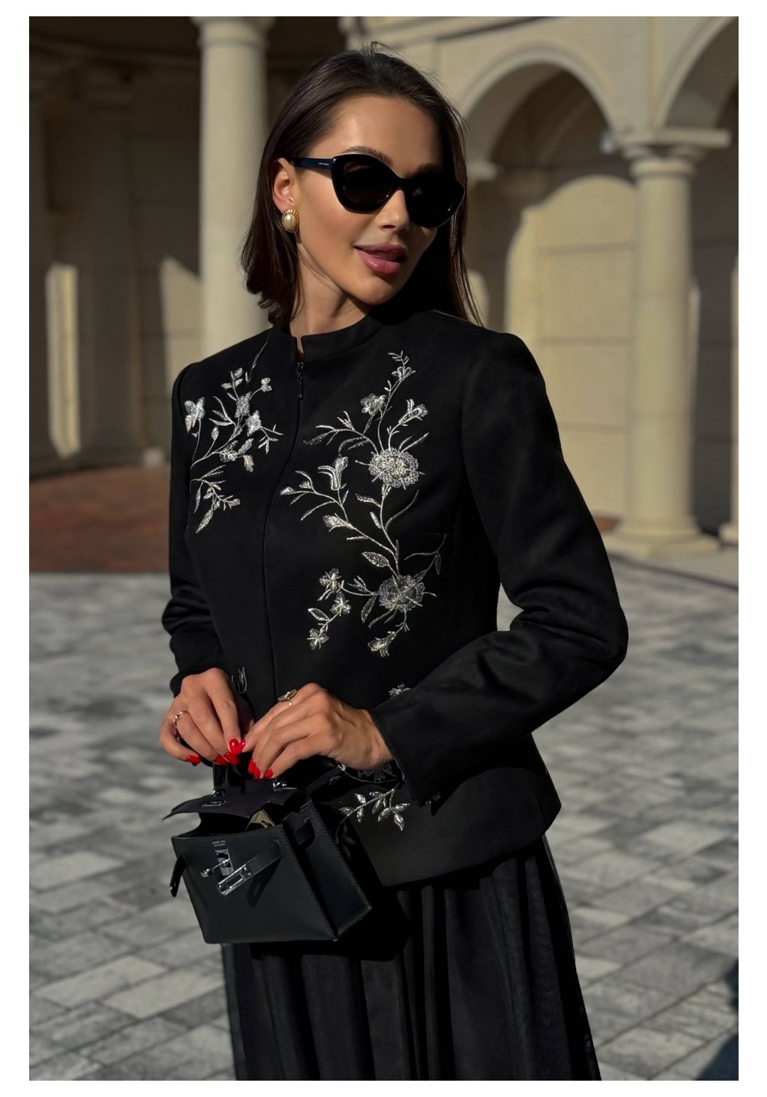 Этот изысканный жакет из искусственной замши – воплощение элегантности и современного стиля. Глубокий черный цвет ткани выгодно подчеркивает изящную вышивку с серебристыми цветочными мотивами, которая добавляет образу нотки роскоши и утонченности. Лаконичный крой с воротником-стойкой создает идеальный баланс между строгостью и женственностью, делая модель универсальной для любых случаев – от деловых встреч до вечерних мероприятий. Жакет подчеркивает статусность и безупречный вкус, прекрасно сочетаясь как с классическими брюками, так и с элегантной юбкой или платьем. Это выбор для тех, кто ценит стиль и комфорт в каждой детали. Жакет женский нарядный, полуприлегающего силуэта, выполнен из мягкой искусственной замши на трикотажной основе, с центральной бортовой застежкой встык с разъемной потайной молнией. Молния расположена на расстоянии 5,0 см от низа и заканчивается у воротника-стойки. Жакет на подкладке. Перед и спинка оформлены художественной вышивкой. Перед со смещенными рельефными швами, идущими из пройм до низа, с нагрудными вытачками от рельефов. Спинка с рельефными швами, идущими из пройм до низа и средним швом. Горловина оформлена воротником-стойкой. Рукава втачные, двухшовные, длинные, по низу локтевых швов с отлетными шлицами. Жакет с плечевыми накладками.