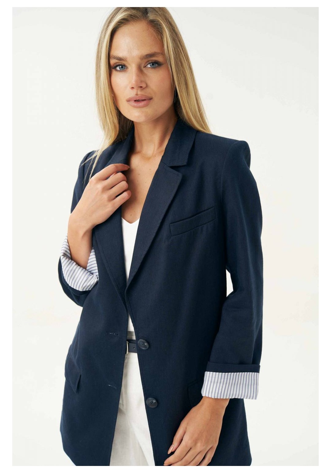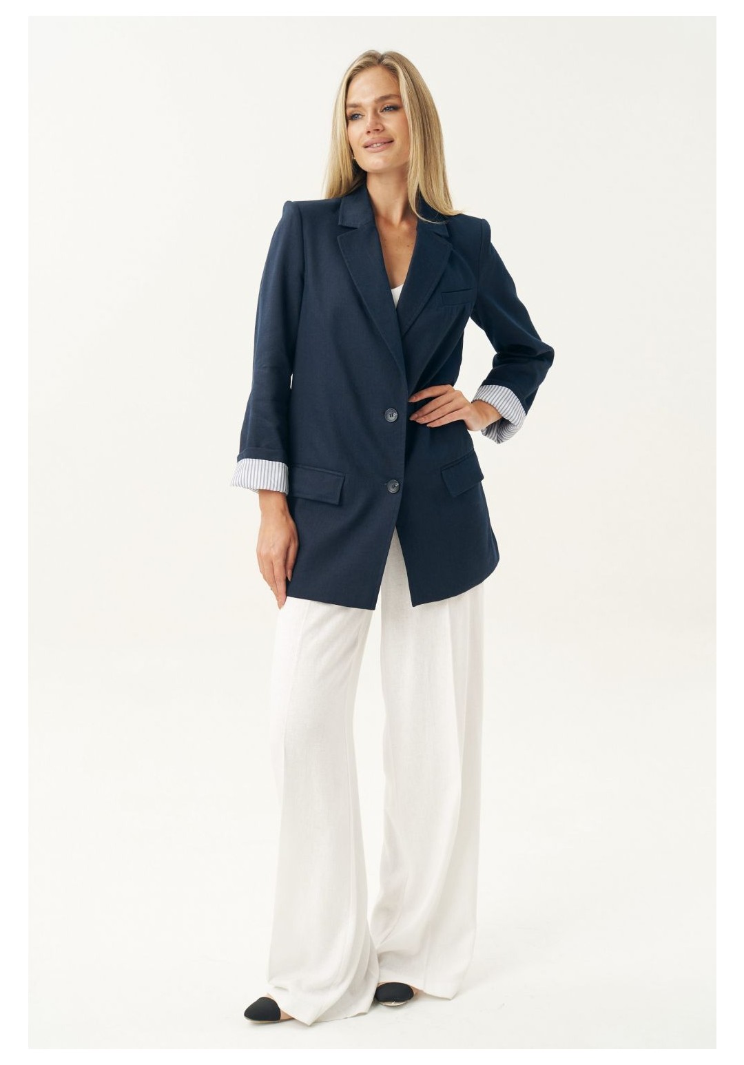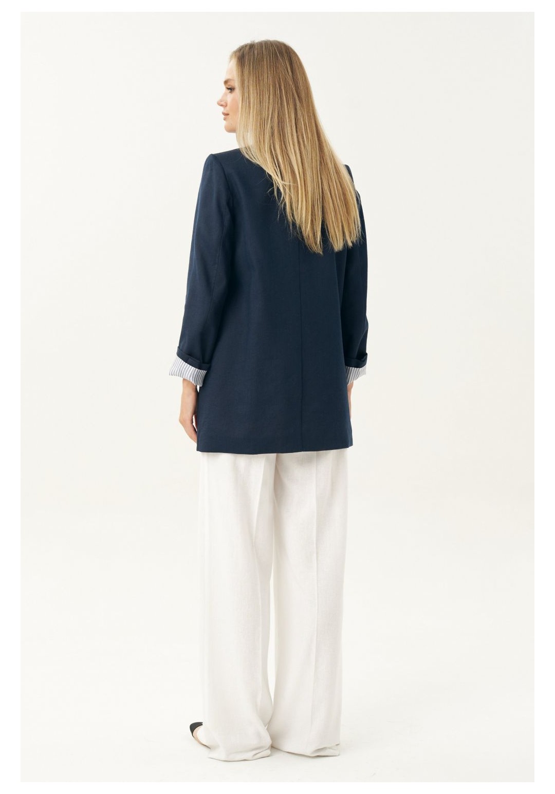 Женский льняной жакет синего цвета — это универсальный элемент гардероба, который легко вписывается в любой стиль: от классического до повседневного. Жакет женский, свободного силуэта, из костюмно-плательной льняной ткани, на подкладке, с центральной бортовой застежкой на 2 петли и пуговицы (размер и цвет фурнитуры может незначительно отличаться от фото), для повседневной носки. Перед в нижней части с прорезными карманами с клапанами и двумя обтачками, с вытачками, от горловины вниз. Левая верхняя часть переда с имитацией прорезного кармана с листочкой с втачными концами. Спинка со средним швом. Рукава втачные, двухшовные, длинные. В локтевом шве по низу с отлетной шлицей с 3-мя петлями и пуговицами. Нижняя часть подкладки рукава выполнена из контрастной по цвету в полоску подкладки, что дает возможность завернуть рукав наверх на манжету. Горловина оформлена воротником пиджачного типа. Жакет с плечевыми накладками. Средняя длина жакета по среднему шву спинки - 79,0 см (±2,0 см); Средняя длина рукава - 63,0 см (±1,5 см); Средняя длина рукава завернутого на манжету 55,0 см (±1,5 см); Жакет с плечевыми накладками. 46 размер Длина по среднему шву спинки - 80,0 см (±2,0 см), Ширина на уровне глубины проймы - 54,0 см (±1,0 см), Ширина на уровне линии талии - 58,0 см (±1,0 см), Ширина на уровне линии бедер - 65,0 см (±1,0 см), Длина рукава - 63,0 см (±1,0 см), Ширина рукава вверху - 18,0 см (±1,0 см), Ширина рукава по низу - 16,0 см (±0,5 см), Длина плеча - 13,5 см (±0,5 см). 48 размер Длина по среднему шву спинки - 80,0 см (±2,0 см), Ширина на уровне глубины проймы - 56,0 см (±1,0 см), Ширина на уровне линии талии - 60,0 см (±1,0 см), Ширина на уровне линии бедер - 67,0 см (±1,0 см), Длина рукава - 63,0 см (±1,0 см), Ширина рукава вверху - 19,0 см (±1,0 см), Ширина рукава по низу - 16,0 см (±0,5 см), Длина плеча - 13,5 см (±0,5 см). 50 размер Длина по среднему шву спинки - 80,0 см (±2,0 см), Ширина на уровне глубины проймы - 58,0 см (±1,0 см), Ширина на уровне линии талии - 62,0 см (±1,0 см), Ширина на уровне линии бедер - 69,0 см (±1,0 см), Длина рукава - 63,0 см (±1,0 см), Ширина рукава вверху - 20,0 см (±1,0 см), Ширина рукава по низу - 16,0 см (±0,5 см), Длина плеча - 13,5 см (±0,5 см). 52 размер Длина по среднему шву спинки - 82,0 см (±2,0 см), Ширина на уровне глубины проймы - 61,0 см (±1,0 см), Ширина на уровне линии талии - 65,5 см (±1,0 см), Ширина на уровне линии бедер - 70,5 см (±1,0 см), Длина рукава - 63,0 см (±1,0 см), Ширина рукава вверху - 20,5 см (±1,0 см), Ширина рукава по низу - 17,0 см (±0,5 см), Длина плеча - 13,7 см (±0,5 см). 54 размер Длина по среднему шву спинки - 82,0 см (±2,0 см), Ширина на уровне глубины проймы - 63,0 см (±1,0 см), Ширина на уровне линии талии - 66,5 см (±1,0 см), Ширина на уровне линии бедер - 72,5 см (±1,0 см), Длина рукава - 63,0 см (±1,0 см), Ширина рукава вверху - 21,5 см (±1,0 см), Ширина рукава по низу - 17,0 см (±0,5 см), Длина плеча - 13,7 см (±0,5 см). 56 размер Длина по среднему шву спинки - 82,0 см (±2,0 см), Ширина на уровне глубины проймы - 65,0 см (±1,0 см), Ширина на уровне линии талии - 67,5 см (±1,0 см), Ширина на уровне линии бедер - 74,5 см (±1,0 см), Длина рукава - 63,0 см (±1,0 см), Ширина рукава вверху - 22,5 см (±1,0 см), Ширина рукава по низу - 17,0 см (±0,5 см), Длина плеча - 13,7 см (±0,5 см).
