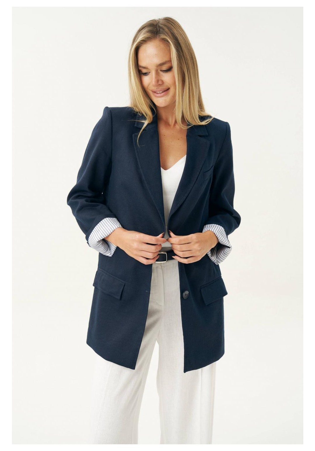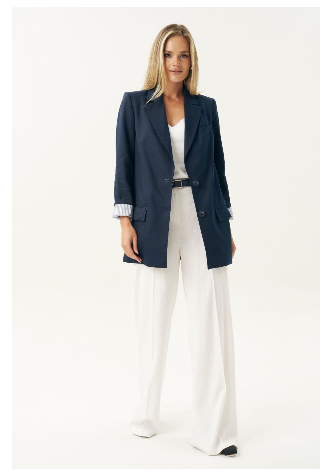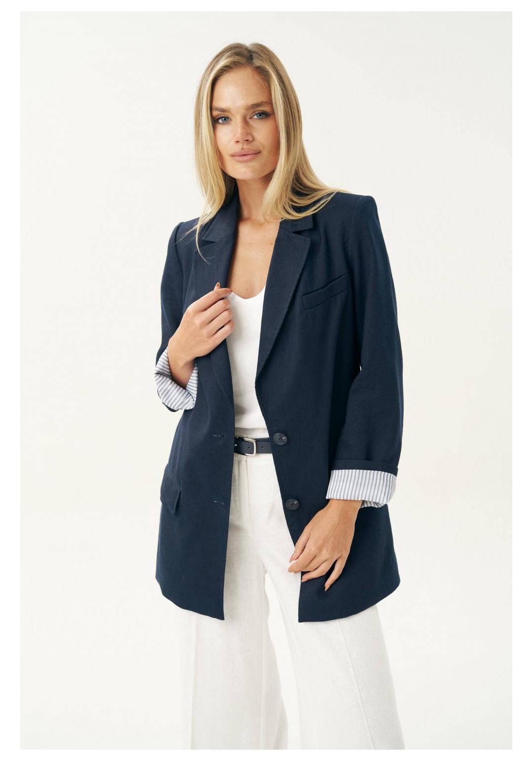 Женский льняной жакет синего цвета — это универсальный элемент гардероба, который легко вписывается в любой стиль: от классического до повседневного. Жакет женский, свободного силуэта, из костюмно-плательной льняной ткани, на подкладке, с центральной бортовой застежкой на 2 петли и пуговицы (размер и цвет фурнитуры может незначительно отличаться от фото), для повседневной носки. Перед в нижней части с прорезными карманами с клапанами и двумя обтачками, с вытачками, от горловины вниз. Левая верхняя часть переда с имитацией прорезного кармана с листочкой с втачными концами. Спинка со средним швом. Рукава втачные, двухшовные, длинные. В локтевом шве по низу с отлетной шлицей с 3-мя петлями и пуговицами. Нижняя часть подкладки рукава выполнена из контрастной по цвету в полоску подкладки, что дает возможность завернуть рукав наверх на манжету. Горловина оформлена воротником пиджачного типа. Жакет с плечевыми накладками. Средняя длина жакета по среднему шву спинки - 79,0 см (±2,0 см); Средняя длина рукава - 63,0 см (±1,5 см); Средняя длина рукава завернутого на манжету 55,0 см (±1,5 см); Жакет с плечевыми накладками. 46 размер Длина по среднему шву спинки - 80,0 см (±2,0 см), Ширина на уровне глубины проймы - 54,0 см (±1,0 см), Ширина на уровне линии талии - 58,0 см (±1,0 см), Ширина на уровне линии бедер - 65,0 см (±1,0 см), Длина рукава - 63,0 см (±1,0 см), Ширина рукава вверху - 18,0 см (±1,0 см), Ширина рукава по низу - 16,0 см (±0,5 см), Длина плеча - 13,5 см (±0,5 см). 48 размер Длина по среднему шву спинки - 80,0 см (±2,0 см), Ширина на уровне глубины проймы - 56,0 см (±1,0 см), Ширина на уровне линии талии - 60,0 см (±1,0 см), Ширина на уровне линии бедер - 67,0 см (±1,0 см), Длина рукава - 63,0 см (±1,0 см), Ширина рукава вверху - 19,0 см (±1,0 см), Ширина рукава по низу - 16,0 см (±0,5 см), Длина плеча - 13,5 см (±0,5 см). 50 размер Длина по среднему шву спинки - 80,0 см (±2,0 см), Ширина на уровне глубины проймы - 58,0 см (±1,0 см), Ширина на уровне линии талии - 62,0 см (±1,0 см), Ширина на уровне линии бедер - 69,0 см (±1,0 см), Длина рукава - 63,0 см (±1,0 см), Ширина рукава вверху - 20,0 см (±1,0 см), Ширина рукава по низу - 16,0 см (±0,5 см), Длина плеча - 13,5 см (±0,5 см). 52 размер Длина по среднему шву спинки - 82,0 см (±2,0 см), Ширина на уровне глубины проймы - 61,0 см (±1,0 см), Ширина на уровне линии талии - 65,5 см (±1,0 см), Ширина на уровне линии бедер - 70,5 см (±1,0 см), Длина рукава - 63,0 см (±1,0 см), Ширина рукава вверху - 20,5 см (±1,0 см), Ширина рукава по низу - 17,0 см (±0,5 см), Длина плеча - 13,7 см (±0,5 см). 54 размер Длина по среднему шву спинки - 82,0 см (±2,0 см), Ширина на уровне глубины проймы - 63,0 см (±1,0 см), Ширина на уровне линии талии - 66,5 см (±1,0 см), Ширина на уровне линии бедер - 72,5 см (±1,0 см), Длина рукава - 63,0 см (±1,0 см), Ширина рукава вверху - 21,5 см (±1,0 см), Ширина рукава по низу - 17,0 см (±0,5 см), Длина плеча - 13,7 см (±0,5 см). 56 размер Длина по среднему шву спинки - 82,0 см (±2,0 см), Ширина на уровне глубины проймы - 65,0 см (±1,0 см), Ширина на уровне линии талии - 67,5 см (±1,0 см), Ширина на уровне линии бедер - 74,5 см (±1,0 см), Длина рукава - 63,0 см (±1,0 см), Ширина рукава вверху - 22,5 см (±1,0 см), Ширина рукава по низу - 17,0 см (±0,5 см), Длина плеча - 13,7 см (±0,5 см).