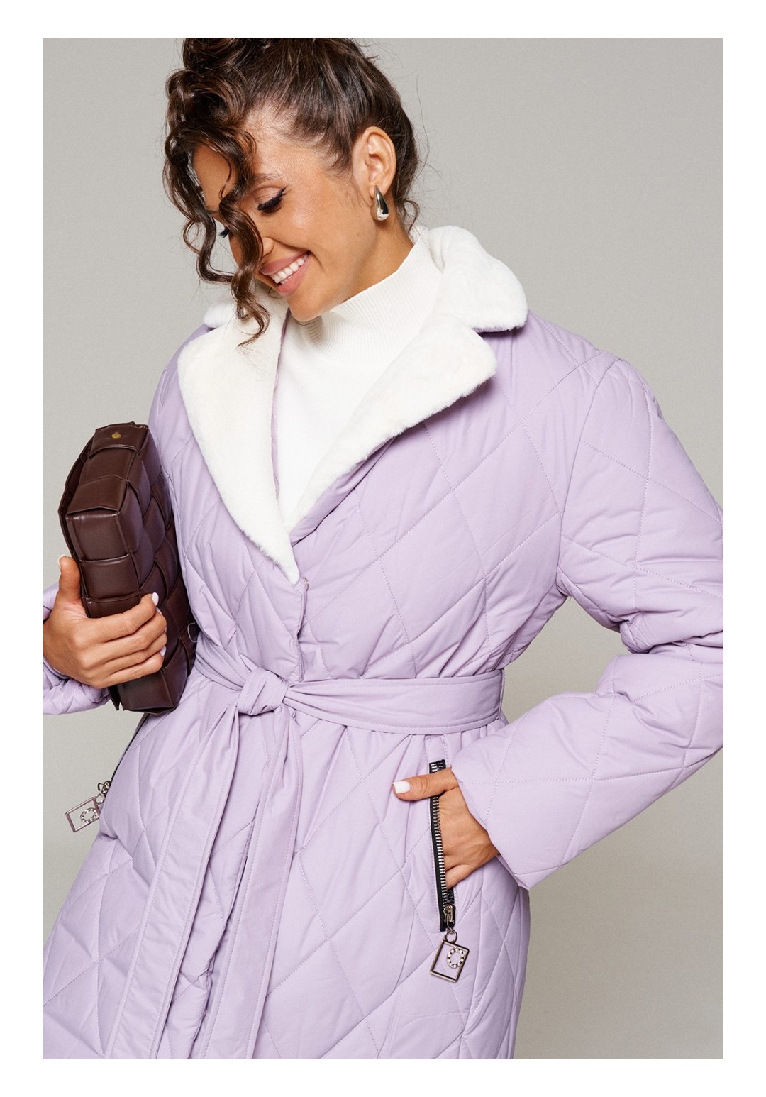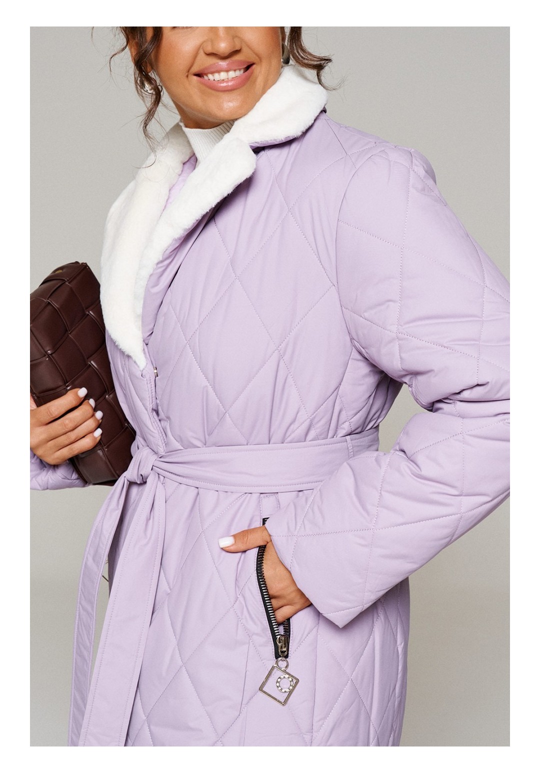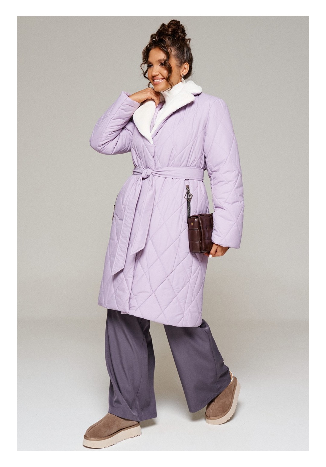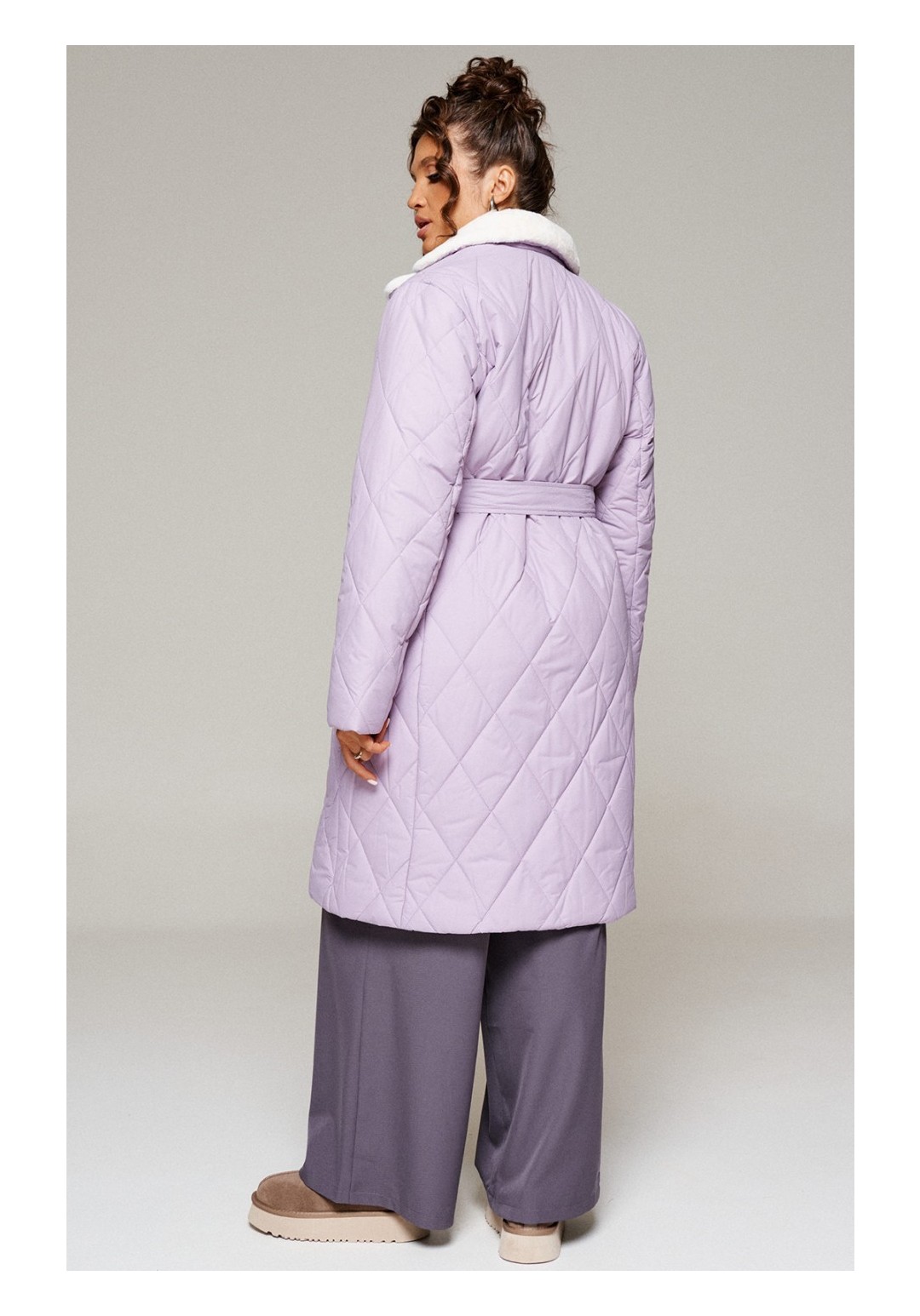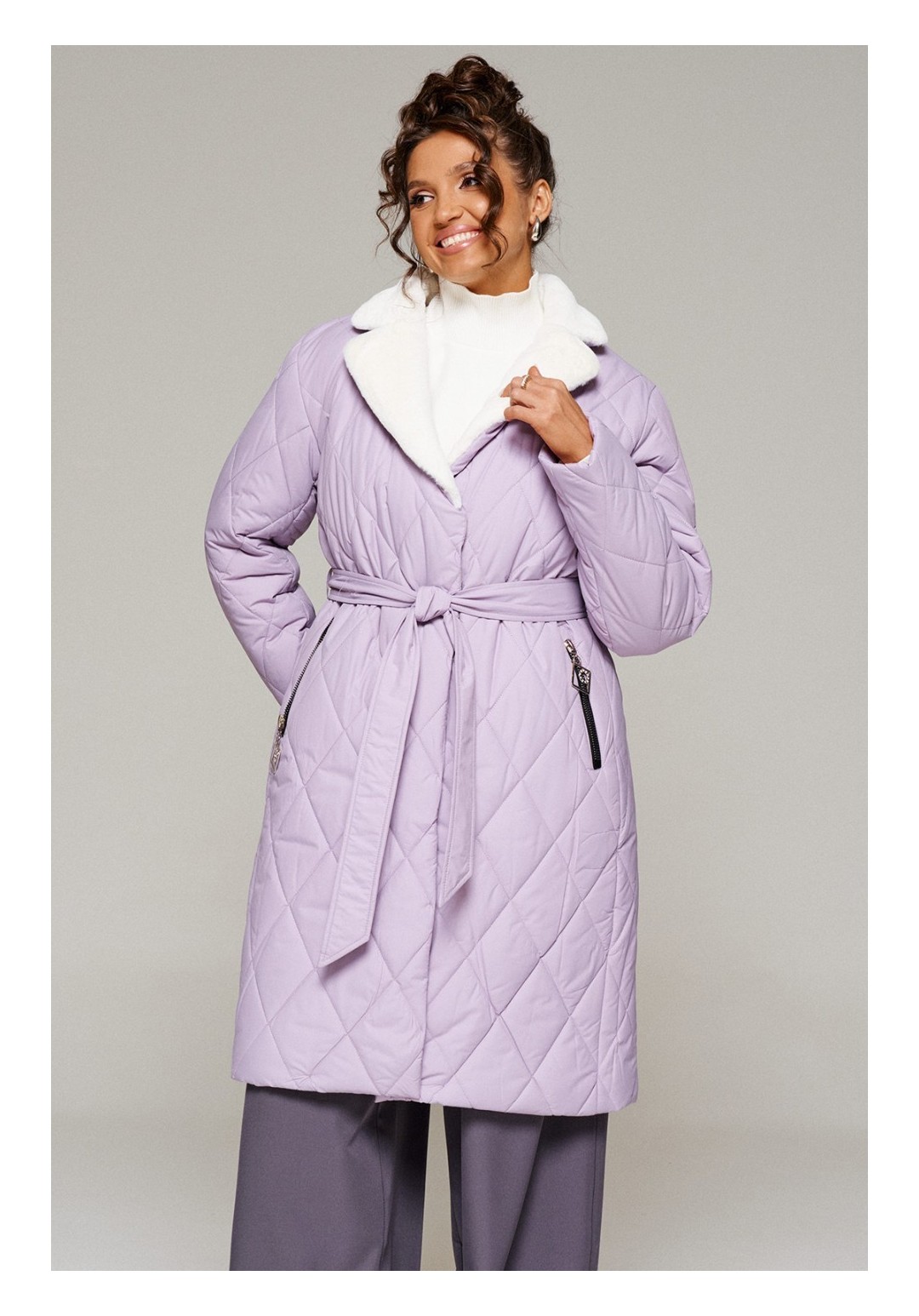 Зимнее, стеганое пальто прямого силуэта для тех, кто любит простоту и ничего лишнего. Это сочетание комфорта, современных материалов и безупречного кроя. Лёгкое, удобное и уютное пальто подходит на все случаи жизни. Сдержанное, расслабленное, не сковывающее движений, универсального цвета. Это пальто отлично впишется в повседневные образы. Пальто выполнено из стёганной, достаточно прочной и приятной на ощупь влагостойкой, полиэфирной ткани; на синтетической подкладке. Утеплитель из холлофайбера 200 г/м.кв., подходит для холодной осени и зимы. Изделие рассчитано на температурный режим от -10 до -20 градусов. Модель прямого силуэта, базового кроя; предназначена для повседневного использования. Передняя часть цельнокроеная, с двумя прорезными карманами на металлической молнии с декоративными наконечниками. Застежка центральная на декоративную молнию с цельнокроеной ветрозащитной планкой снаружи, которая фиксируется на потайные кнопки. Длина молнии от нижней части воротника до нижнего края изделия. Спинка цельнокроеная с вертикальным рельефом сбоку в виде отрезного бочка. Рукав длинный, двухшовный, втачной. Внутри рукава предусмотрена дополнительная вставка в виде трикотажной манжеты. Воротник притачной по линии горловины; пиджачного типа с лацканами. Выполнен из искусственного меха. Низ изделия ровный. Подкладка гладкая, имеет дополнительный внутренний карман. В качестве дополнительного элемента к изделию прилагается пояс – завязка. С учетом плюсовых прибавок подходит на рост 170см. Длина (по среднему шву спинки) = 102-106 см. (+1см.) Длина рукава = 62-64 см. (+1см.)