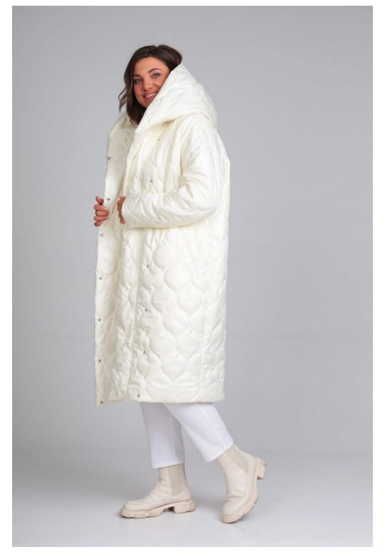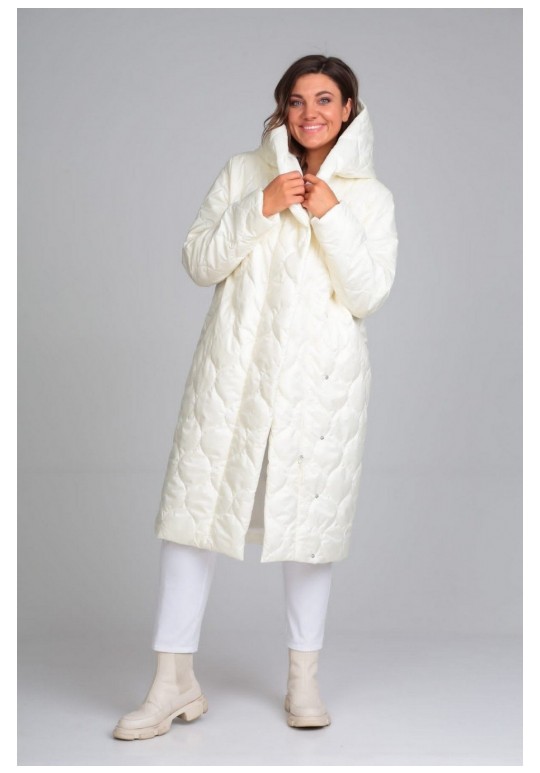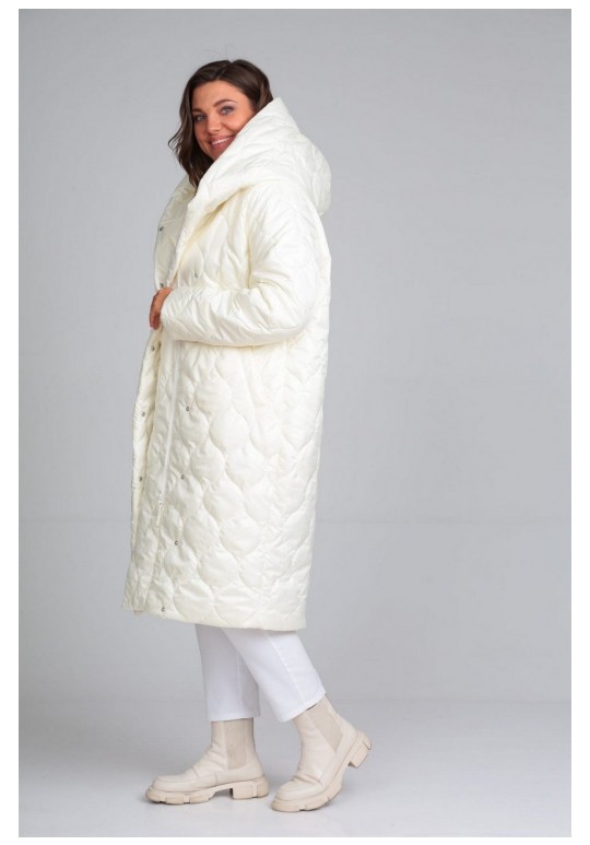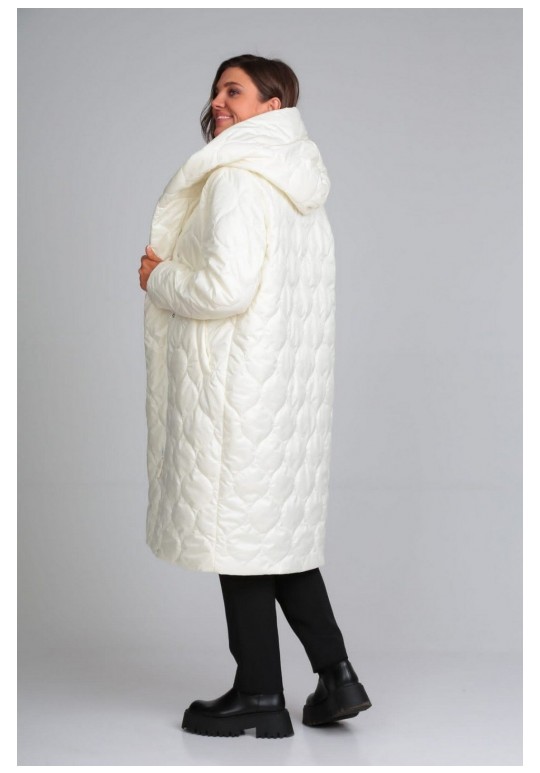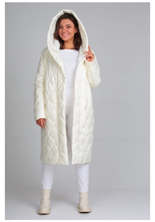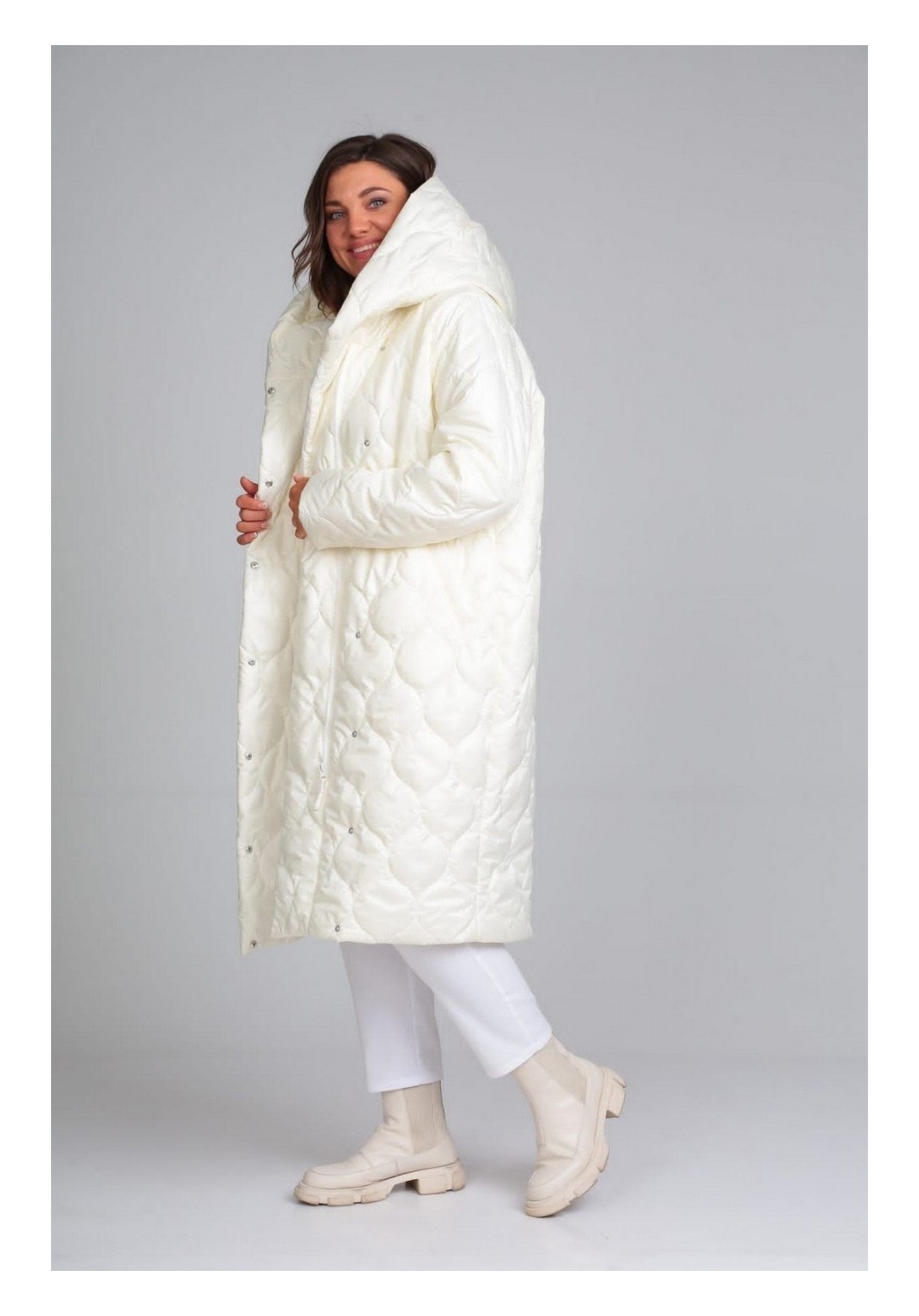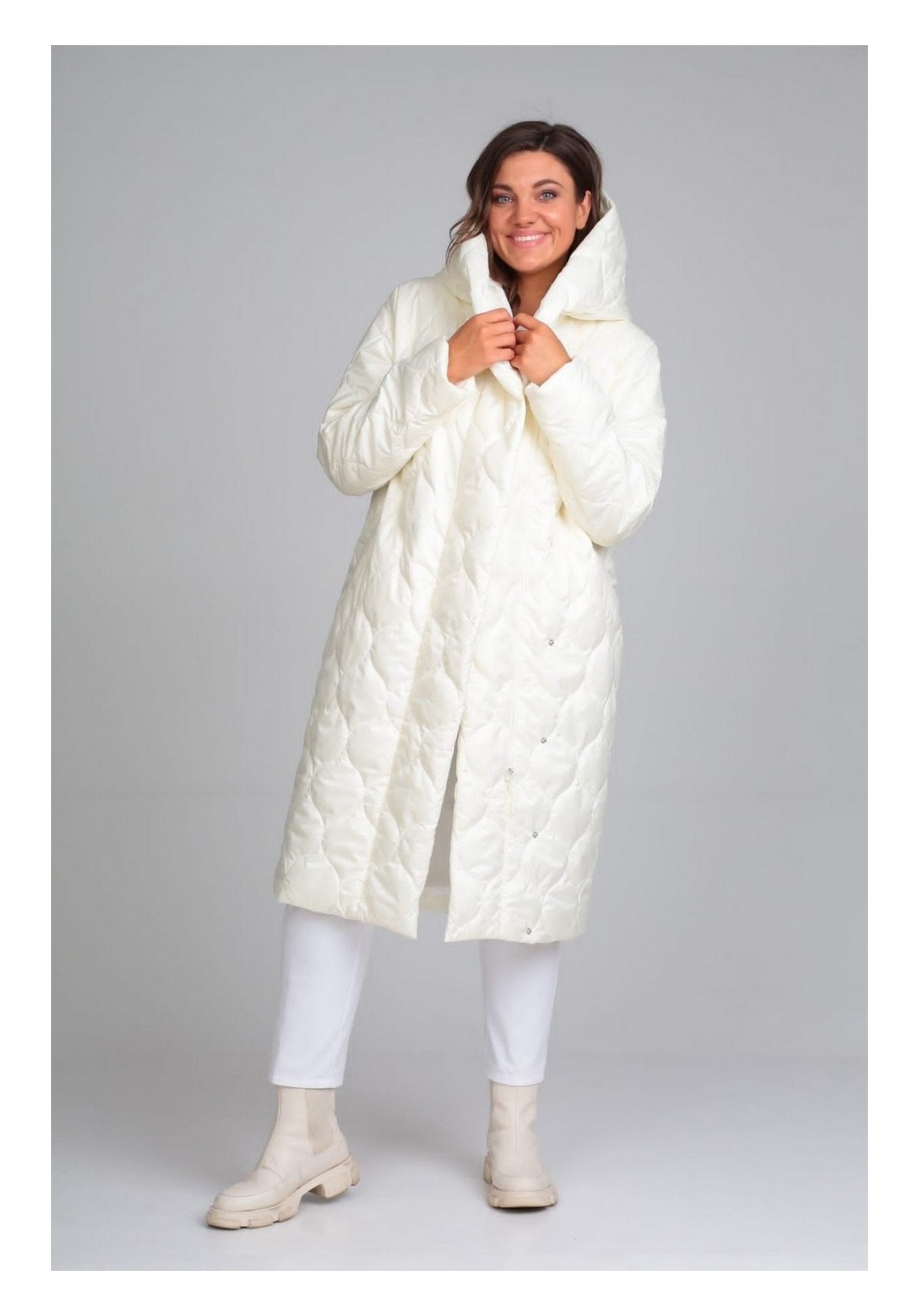 Пальто женское с центральной застежкой на тесьму молнию, отделочная застежка-планка на потайные кнопки (смещенная). По переду прорезные с втачной листочкой. Рукава втачной двухшовный с отложенным манжетом. Капюшон со средним швом и отрезной отделочной деталью по отлету воротника. в качестве отделки используется фурнитура. Пальто на подкладке. Длина по спинке 108 м, длина рукава 67 см.