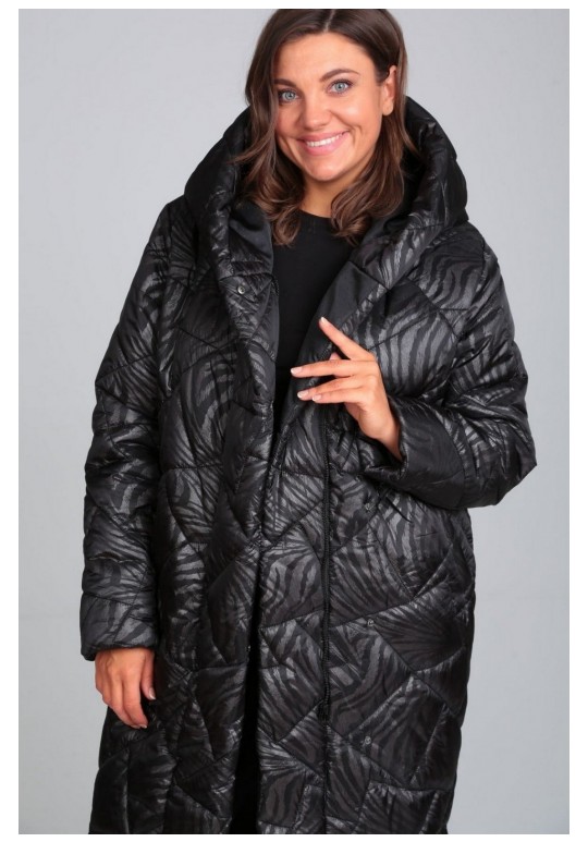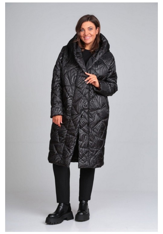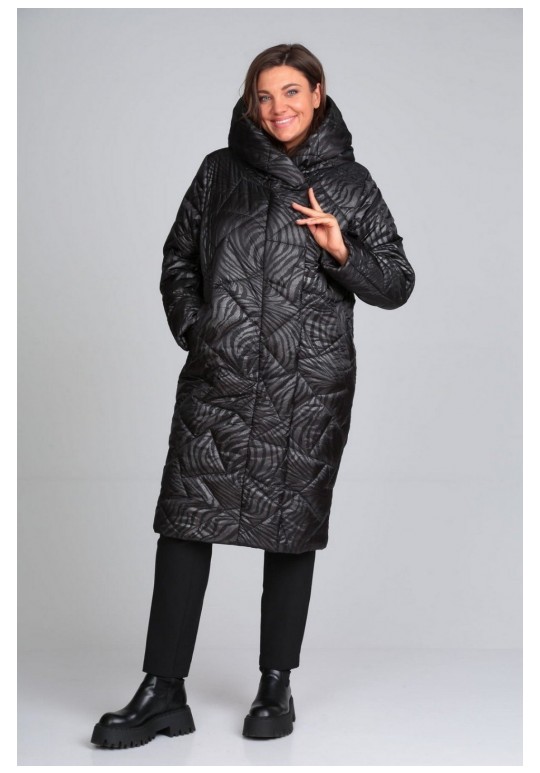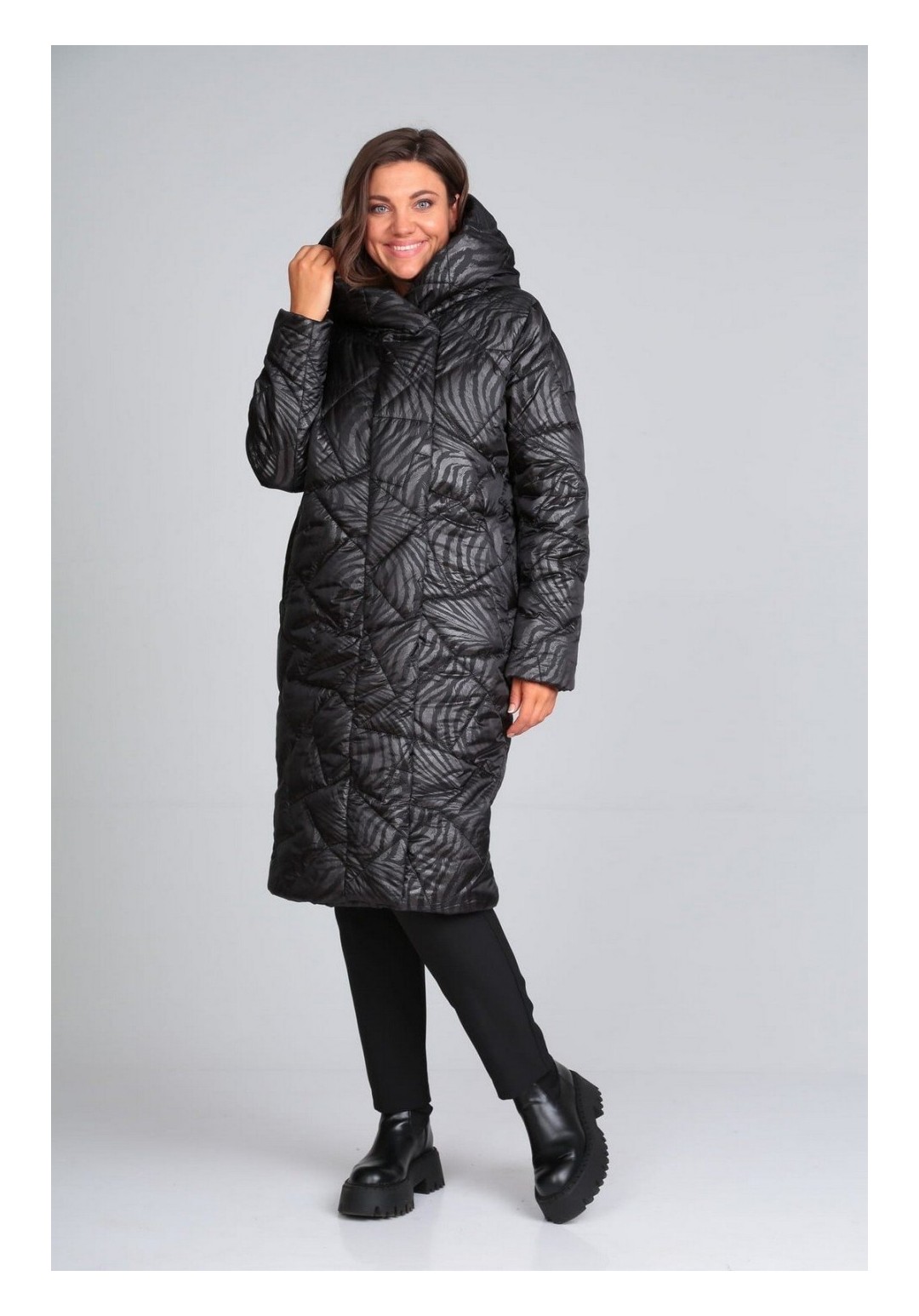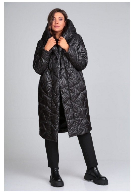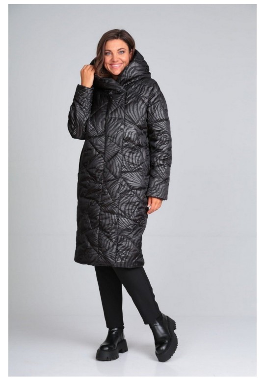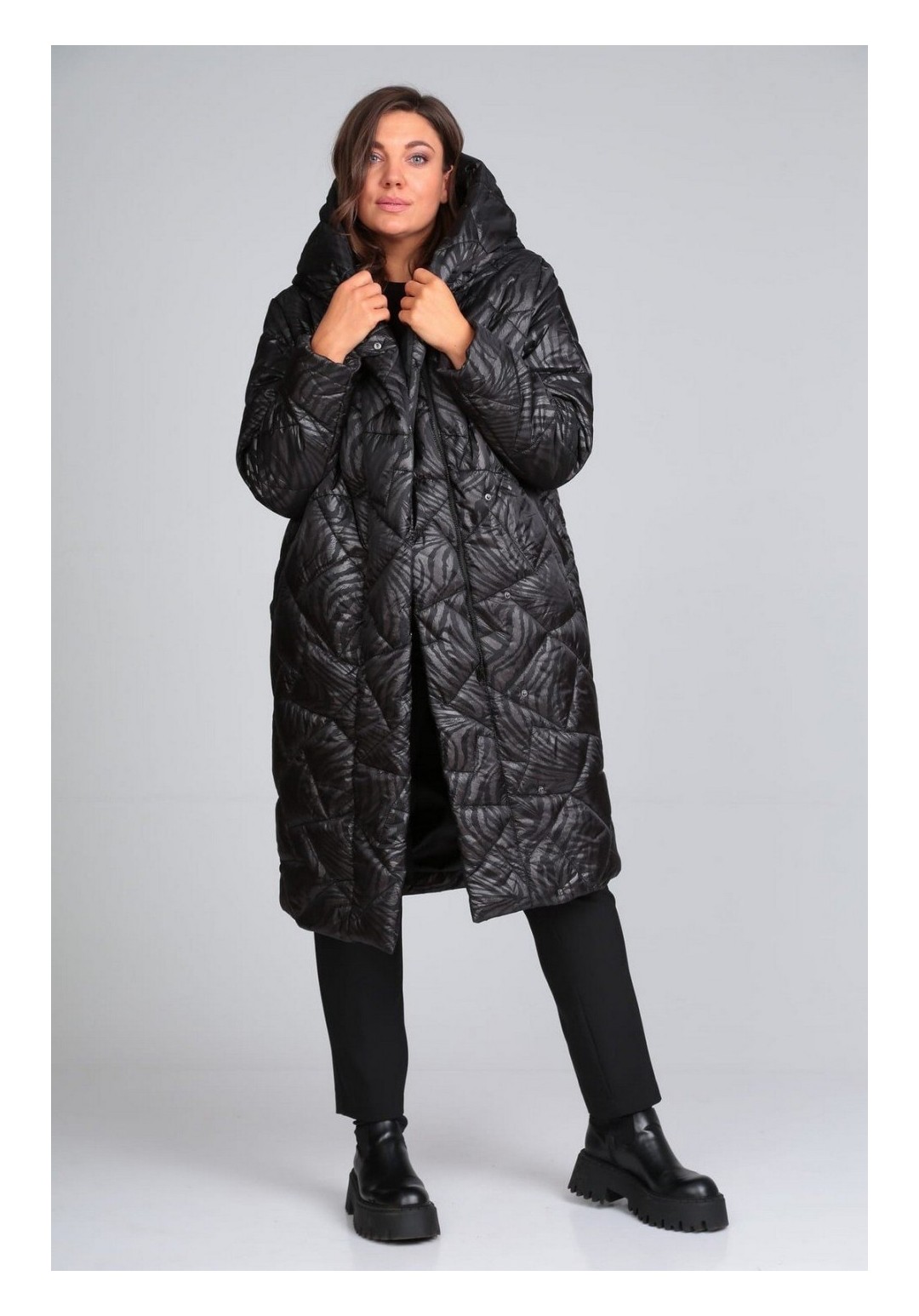 Пальто женское с центральной застежкой на тесьму молнию, отделочная застежка-планка на потайные кнопки (смещенная). По переду прорезные с втачной листочкой. Рукава втачной двухшовный с отложенным манжетом. Капюшон со средним швом и отрезной отделочной деталью по отлету воротника. в качестве отделки используется фурнитура. Пальто на подкладке. Длина по спинке 108 м, длина рукава 67 см.