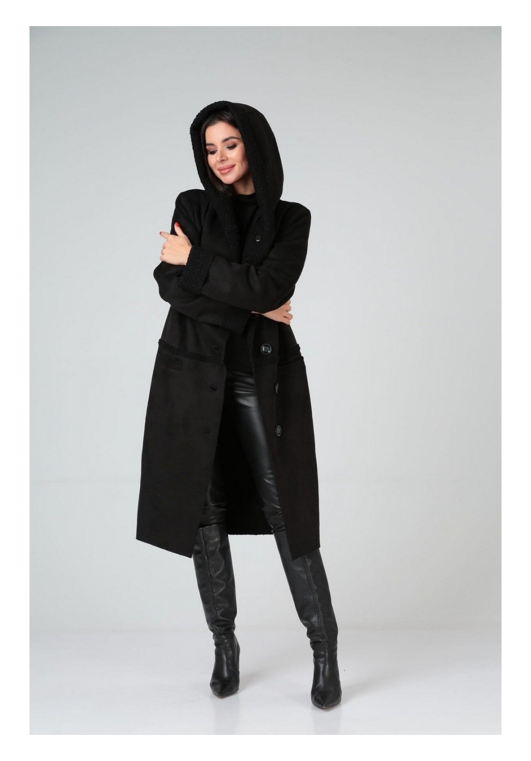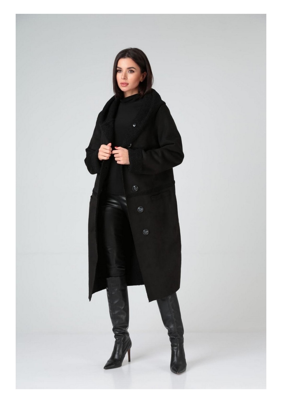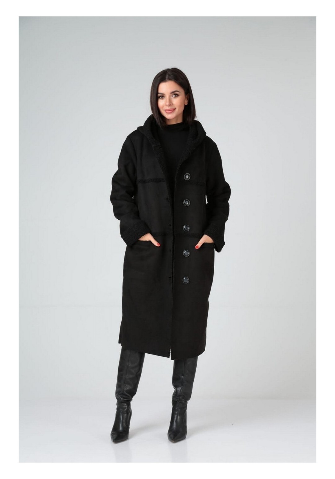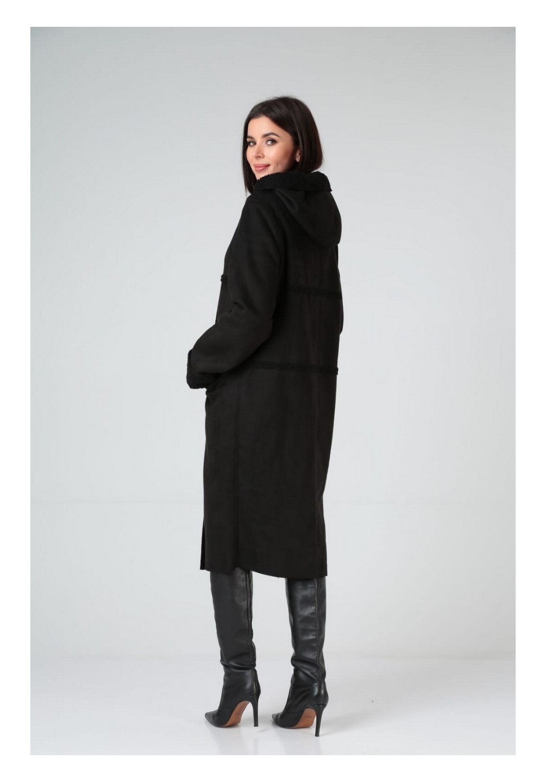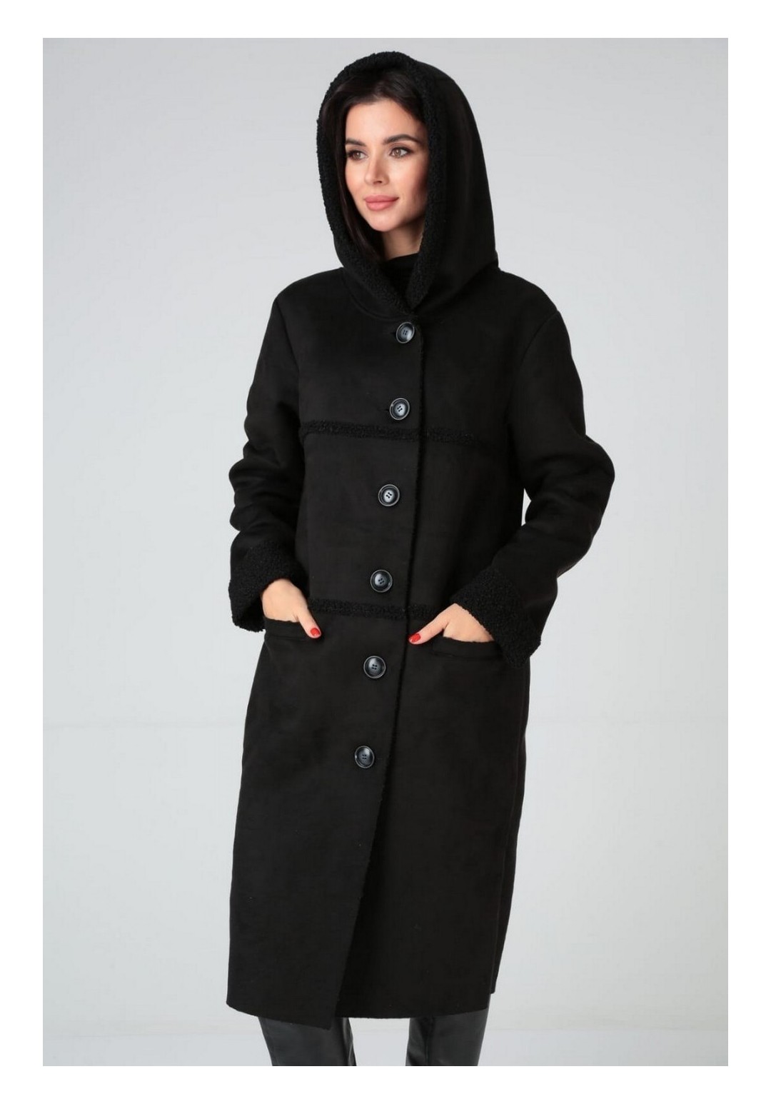 Пальто зимнее, полуприлегающего силуэта с центральной застёжкой на петли-пуговицы,с капюшоном. По полочкам и спинке- горизонтальные рельефы по линии груди и бёдрам. Рукав - втачной одношовный.Материал искусственный дубляж. Температурный режим до -5 градусов.Длина по спинке 103-105 см. , длина рукава 71-72 см.