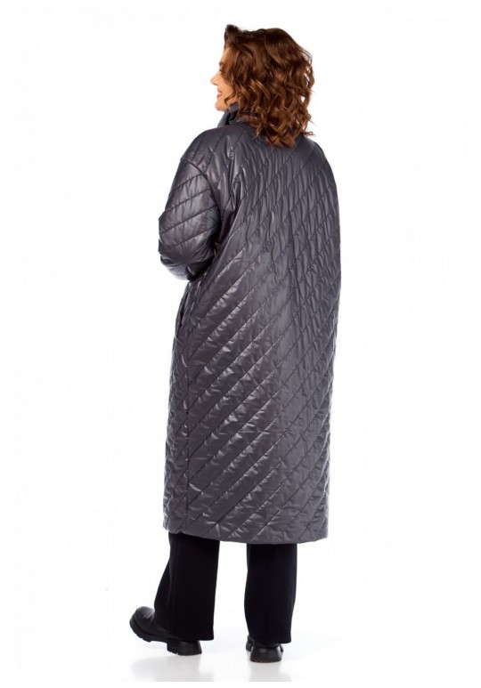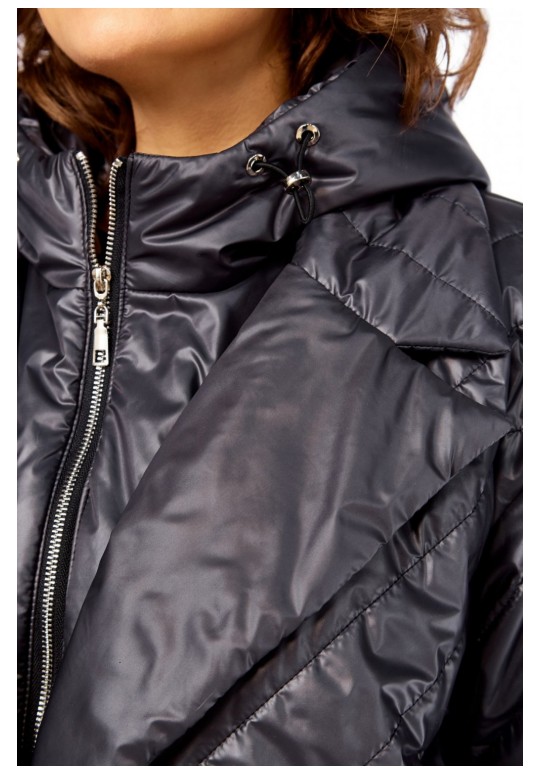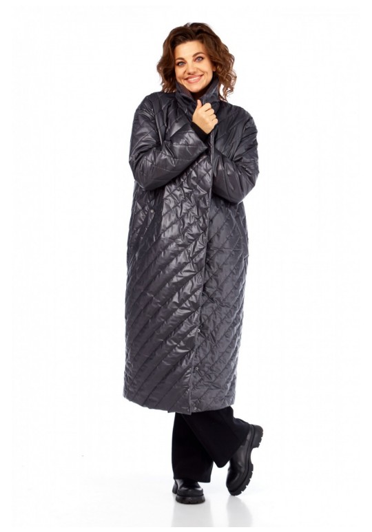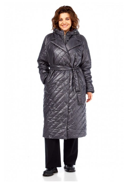 Пальто женское со смещенной застежкой на кнопки. Перед с боковыми карманами с листочкой. Рукав втачной, одношовный с трикотажными манжетами выходящими из-под подгибки низа. Воротник отложной с лацканами. В пальто пристегивается на петли и пуговицы манишка с капюшоном. Капюшон с внутренней кулисой регулируется по ширине. Манишка застегивается на молнию. Пояс обтачной. Температурный режим до -5 градусов. Длина по спинке 120 см, длина рукава 60+5 см