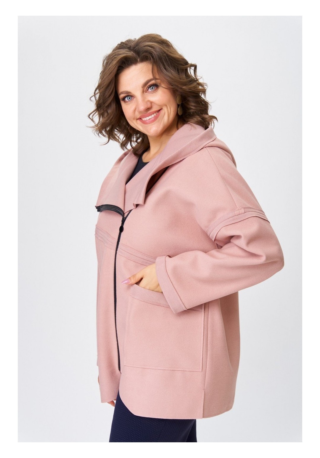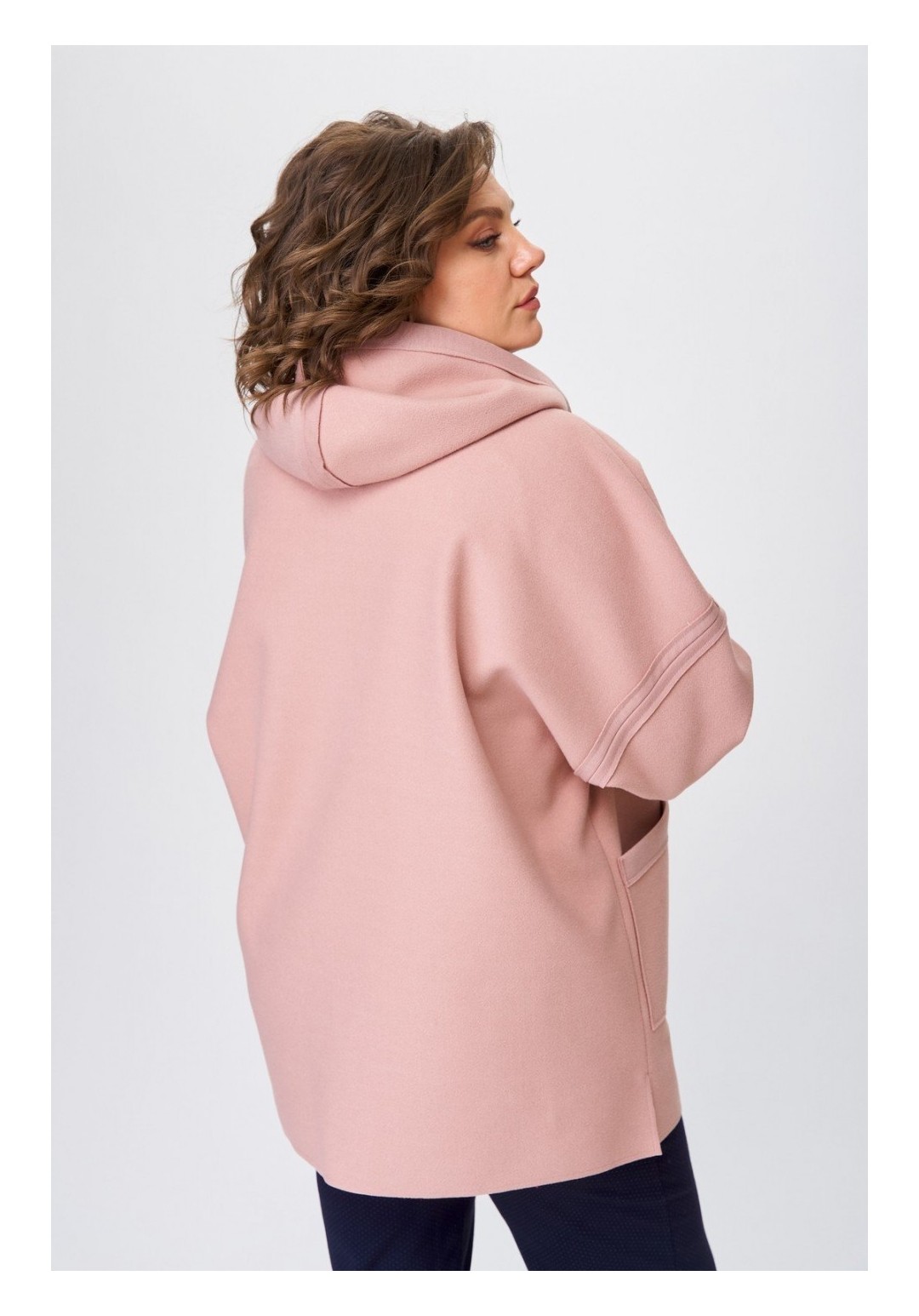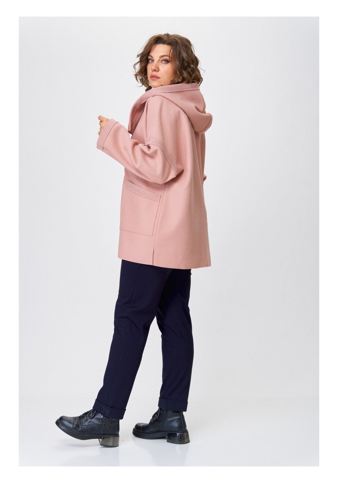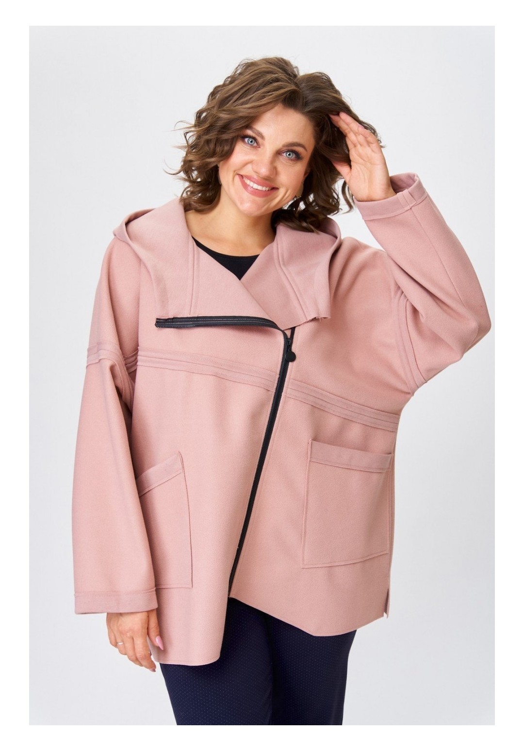 Женское полупальто для повседневной носки выполнено из тонкой пальтовой ткани. Полупальто свободного кроя с капюшоном. Плечо спущенное, рукав длинный втачной. Перед изделия с асимметричной косой застежкой на разъемную тесьму-молнию. Спинка прямая цельная. Полупальто украшено рельефными швами срезами наружу. По переду накладные карманы, на одном из которых в качестве декора используется декоративная печать. Низ изделия разноуровневый с необработанным краем. Полупальто смело сочетается с любым низом (юбка, брюки, джинсы) и обувью. Длина по спинке 75 см, длина рукава от горловины 74 см. Изделие подойдет на рост 170 см.