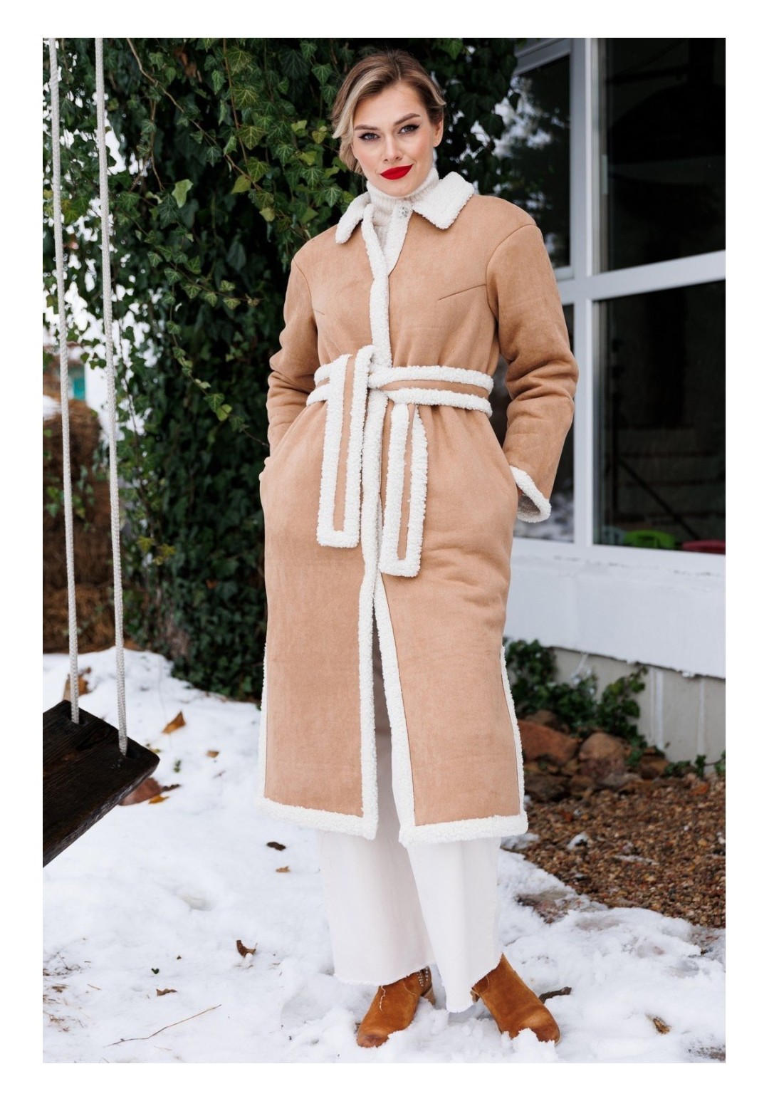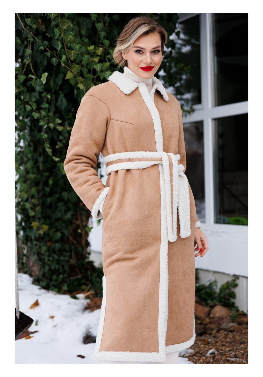 Пальто женское прямого силуэта, втачного покроя, со спущенным плечевым швом. Застежка однобортная, центральная, на шесть потайных кнопок. Горловина округлая. На полочке нагрудные вытачки из пройм. В боковых швах карманы. По низу изделия разрезы. Воротник отложной с застежкой до верху. Изделие без подкладки, со съемным поясом. длина спинки: 120 см длина рукава: 55,5 см