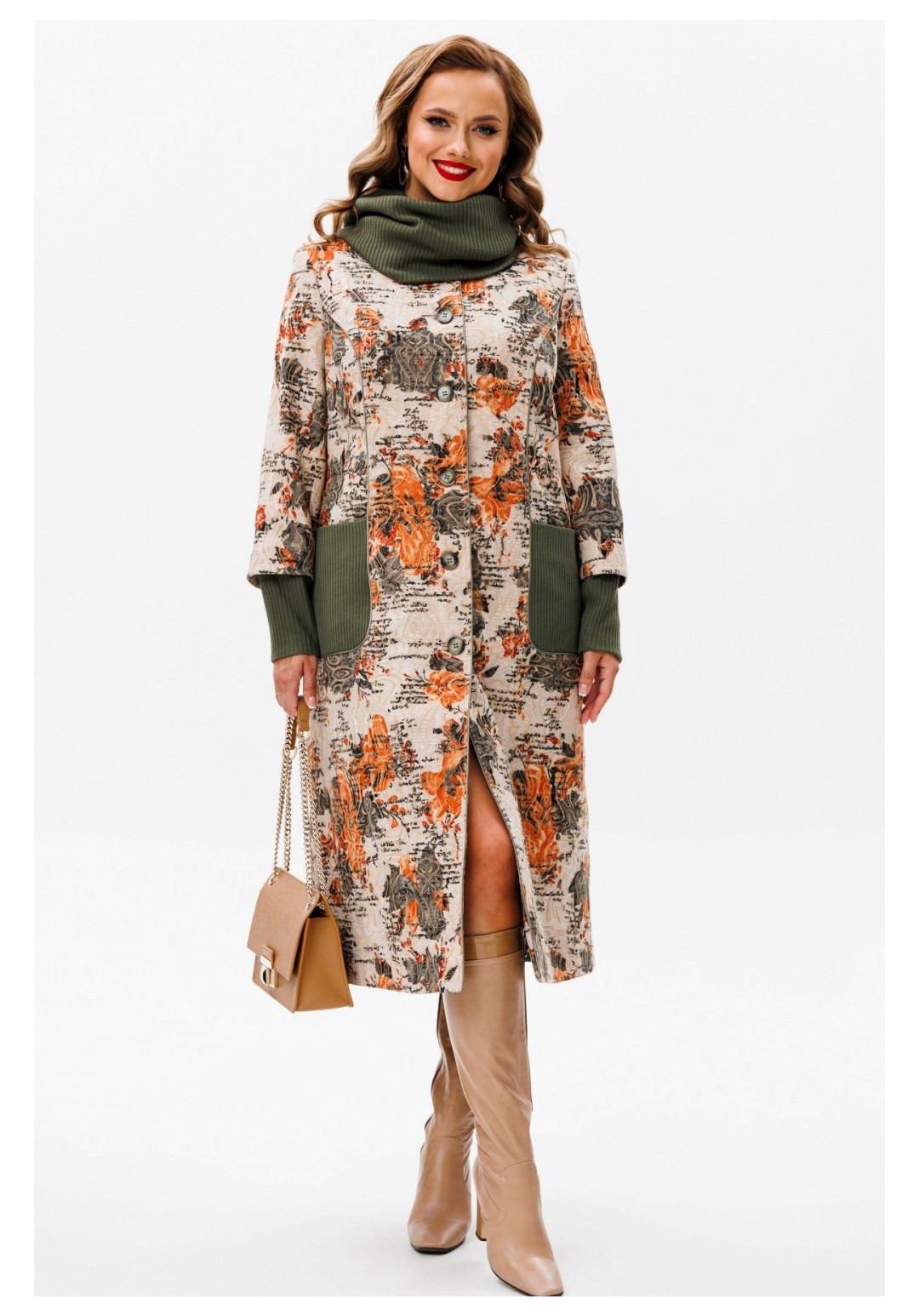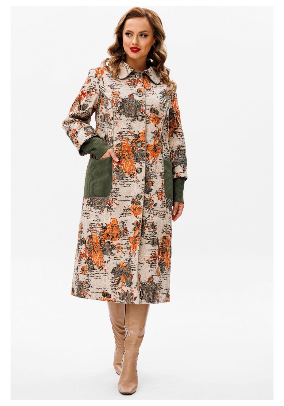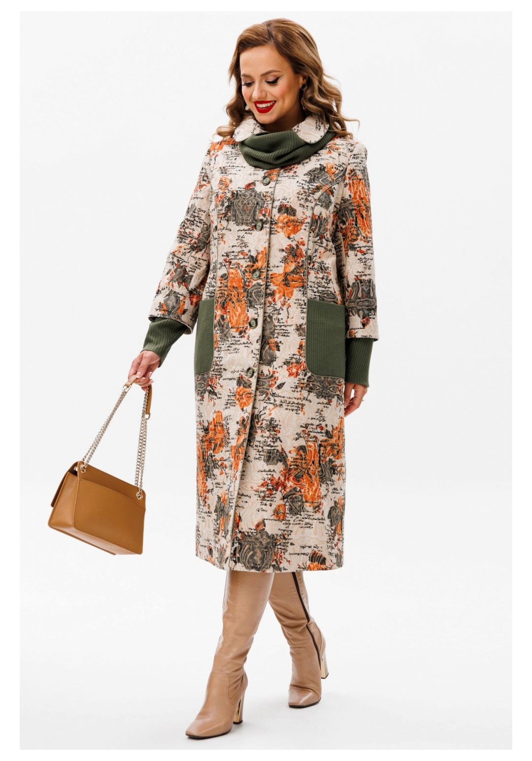 Утеплённое пальто со съёмным шарфом — идеальное сочетание комфорта и стиля для осенних дней. Это пальто изготовлено из качественной ткани, обеспечивающей тепло и защиту от непогоды. Благодаря съёмному шарфу, вы сможете адаптировать свой образ к любой ситуации, будь то деловая встреча или прогулка по городу. Вы во всеоружии встретите похолодание в модном пальто, подчеркивающим ваш индивидуальный образ. Пальто женское, полуприлегающего силуэта, для повседневной носки с центральной бортовой застежкой на 6 петель и 6 пуговиц, со стояче-отложным воротником. Пальто выполнено из костюмной ткани в сочетании с трикотажным полотном. Перед и спинка на подкладке с утеплителем из синтепона, рукава на подкладке без утеплителя. Перед с рельефными швами, проходящими через центр груди и идущими от пройм вниз до уровня линии бедер и уходящими в боковые швы. Боковые части переда оформлены накладными карманами из трикотажного полотна. Спинка со средним швом. Горловина оформлена стояче-отложным воротником с закругленными концами. Рукава втачные, двух-шовные, длинные с притачными манжетами. Манжеты выполнены из трикотажного полотна. . По отлетному припуску обтачного низа рукава из костюмной ткани прострочена отделочная строчка шириной 4,0 см. Рельефные швы переда, борта, воротник обработаны атласным кантом, в цвет трикотажного полотна. По рельефам переда, бортам, воротнику прострочена отделочная строчка шириной 0,5 см. Пальто с плечевыми накладками, со съемным шарфиком-хомутиком из трикотажного полотна. Средняя длина пальто по среднему шву спинки, от шва втачивания воротника до низа 112,5 см (±3,0 см); Средняя длина рукава с манжетой 63,0 см.(±1,5 см). 46:Длина по среднему шву спинки - 112,5 см (±3,0 см), Длина рукава до притачной манжеты - 51,5 см (±2,0 см), Длина рукава с притачной манжетой - 61,5 см (±2,0 см), Ширина на уровне глубины проймы - 57,0 см (±1,0 см), Ширина на уровне линии талии - 54,0 см (±1,0 см), Ширина на уровне линии бедер - 61,0 см (±1,0 см), Ширина рукава вверху - 19,5 см (±1,0 см), Ширина рукава внизу ( на уровне притачивания манжеты) - 16,0 см (±0,5 см), Длина плеча - 12,3 см (±0,5 см). 48:Длина по среднему шву спинки - 112,5 см (±3,0 см), Длина рукава до притачной манжеты - 51,5 см (±2,0 см), Длина рукава с притачной манжетой - 61,5 см (±2,0 см), Ширина на уровне глубины проймы - 58,0 см (±1,0 см), Ширина на уровне линии талии - 57,0 см (±1,0 см), Ширина на уровне линии бедер - 62,5 см (±1,0 см), Ширина рукава вверху - 20,0 см (±1,0 см), Ширина рукава внизу ( на уровне притачивания манжеты) - 16,0 см (±0,5 см), Длина плеча - 12,3 см (±0,5 см). 50:Длина по среднему шву спинки - 112,5 см (±3,0 см), Длина рукава до притачной манжеты - 51,5 см (±2,0 см), Длина рукава с притачной манжетой - 61,5 см (±2,0 см), Ширина на уровне глубины проймы - 60,0 см (±1,0 см), Ширина на уровне линии талии - 58,0 см (±1,0 см), Ширина на уровне линии бедер - 64,5 см (±1,0 см), Ширина рукава вверху - 20,5 см (±1,0 см), Ширина рукава внизу ( на уровне притачивания манжеты) - 16,0 см (±0,5 см), Длина плеча - 12,3 см (±0,5 см). 52:Длина по среднему шву спинки - 113,5 см (±3,0 см), Длина рукава до притачной манжеты - 51,0 см (±2,0 см), Длина рукава с притачной манжетой - 61,5 см (±2,0 см), Ширина на уровне глубины проймы - 62,0 см (±1,0 см), Ширина на уровне линии талии - 60,0 см (±1,0 см), Ширина на уровне линии бедер - 67,0 см (±1,0 см), Ширина рукава вверху - 22,0 см (±1,0 см), Ширина рукава внизу ( на уровне притачивания манжеты) - 17,5 см (±0,5 см), Длина плеча - 12,7 см (±0,5 см). 54:Длина п