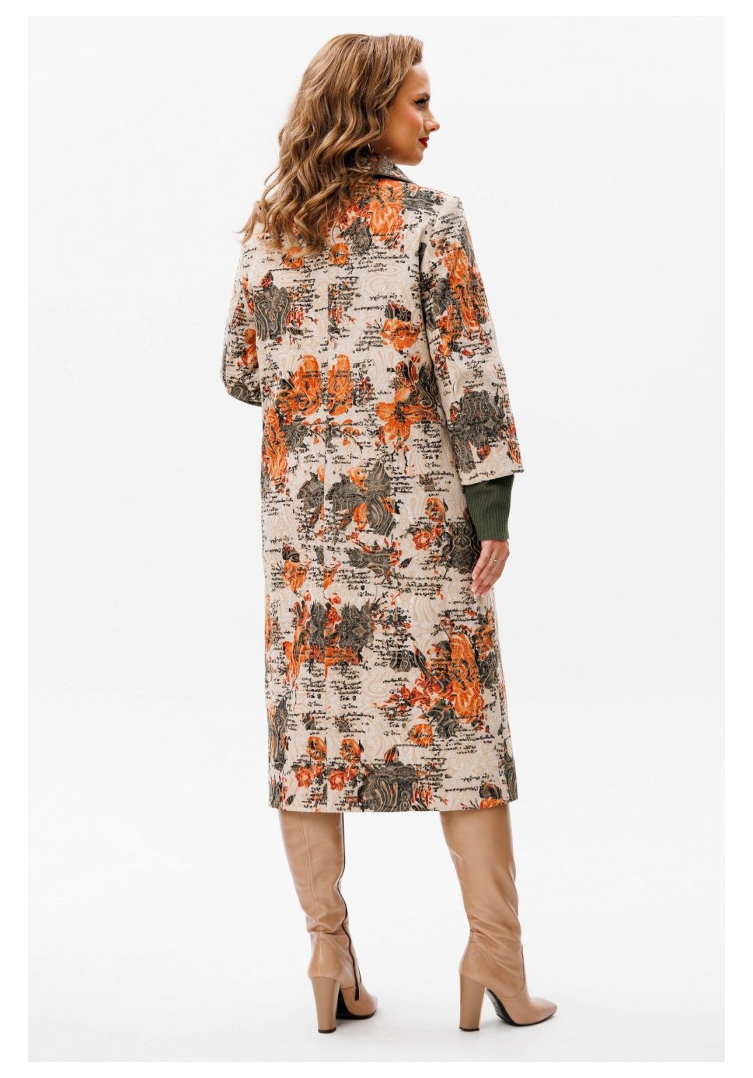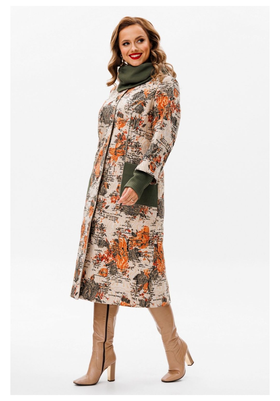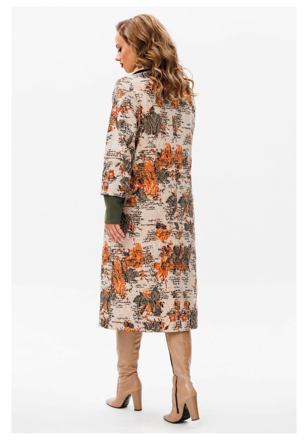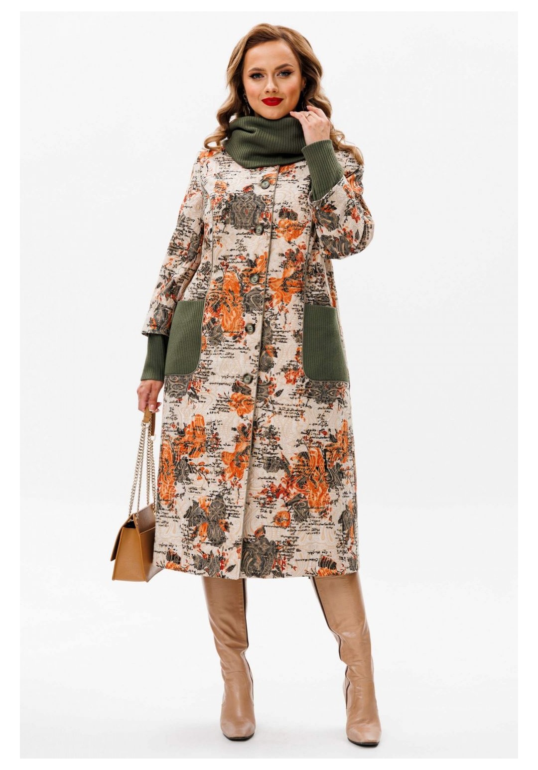 Утеплённое пальто со съёмным шарфом — идеальное сочетание комфорта и стиля для осенних дней. Это пальто изготовлено из качественной ткани, обеспечивающей тепло и защиту от непогоды. Благодаря съёмному шарфу, вы сможете адаптировать свой образ к любой ситуации, будь то деловая встреча или прогулка по городу. Вы во всеоружии встретите похолодание в модном пальто, подчеркивающим ваш индивидуальный образ. Пальто женское, полуприлегающего силуэта, для повседневной носки с центральной бортовой застежкой на 6 петель и 6 пуговиц, со стояче-отложным воротником. Пальто выполнено из костюмной ткани в сочетании с трикотажным полотном. Перед и спинка на подкладке с утеплителем из синтепона, рукава на подкладке без утеплителя. Перед с рельефными швами, проходящими через центр груди и идущими от пройм вниз до уровня линии бедер и уходящими в боковые швы. Боковые части переда оформлены накладными карманами из трикотажного полотна. Спинка со средним швом. Горловина оформлена стояче-отложным воротником с закругленными концами. Рукава втачные, двух-шовные, длинные с притачными манжетами. Манжеты выполнены из трикотажного полотна. . По отлетному припуску обтачного низа рукава из костюмной ткани прострочена отделочная строчка шириной 4,0 см. Рельефные швы переда, борта, воротник обработаны атласным кантом, в цвет трикотажного полотна. По рельефам переда, бортам, воротнику прострочена отделочная строчка шириной 0,5 см. Пальто с плечевыми накладками, со съемным шарфиком-хомутиком из трикотажного полотна. Средняя длина пальто по среднему шву спинки, от шва втачивания воротника до низа 112,5 см (±3,0 см); Средняя длина рукава с манжетой 63,0 см.(±1,5 см). 46:Длина по среднему шву спинки - 112,5 см (±3,0 см), Длина рукава до притачной манжеты - 51,5 см (±2,0 см), Длина рукава с притачной манжетой - 61,5 см (±2,0 см), Ширина на уровне глубины проймы - 57,0 см (±1,0 см), Ширина на уровне линии талии - 54,0 см (±1,0 см), Ширина на уровне линии бедер - 61,0 см (±1,0 см), Ширина рукава вверху - 19,5 см (±1,0 см), Ширина рукава внизу ( на уровне притачивания манжеты) - 16,0 см (±0,5 см), Длина плеча - 12,3 см (±0,5 см). 48:Длина по среднему шву спинки - 112,5 см (±3,0 см), Длина рукава до притачной манжеты - 51,5 см (±2,0 см), Длина рукава с притачной манжетой - 61,5 см (±2,0 см), Ширина на уровне глубины проймы - 58,0 см (±1,0 см), Ширина на уровне линии талии - 57,0 см (±1,0 см), Ширина на уровне линии бедер - 62,5 см (±1,0 см), Ширина рукава вверху - 20,0 см (±1,0 см), Ширина рукава внизу ( на уровне притачивания манжеты) - 16,0 см (±0,5 см), Длина плеча - 12,3 см (±0,5 см). 50:Длина по среднему шву спинки - 112,5 см (±3,0 см), Длина рукава до притачной манжеты - 51,5 см (±2,0 см), Длина рукава с притачной манжетой - 61,5 см (±2,0 см), Ширина на уровне глубины проймы - 60,0 см (±1,0 см), Ширина на уровне линии талии - 58,0 см (±1,0 см), Ширина на уровне линии бедер - 64,5 см (±1,0 см), Ширина рукава вверху - 20,5 см (±1,0 см), Ширина рукава внизу ( на уровне притачивания манжеты) - 16,0 см (±0,5 см), Длина плеча - 12,3 см (±0,5 см). 52:Длина по среднему шву спинки - 113,5 см (±3,0 см), Длина рукава до притачной манжеты - 51,0 см (±2,0 см), Длина рукава с притачной манжетой - 61,5 см (±2,0 см), Ширина на уровне глубины проймы - 62,0 см (±1,0 см), Ширина на уровне линии талии - 60,0 см (±1,0 см), Ширина на уровне линии бедер - 67,0 см (±1,0 см), Ширина рукава вверху - 22,0 см (±1,0 см), Ширина рукава внизу ( на уровне притачивания манжеты) - 17,5 см (±0,5 см), Длина плеча - 12,7 см (±0,5 см). 54:Длина п