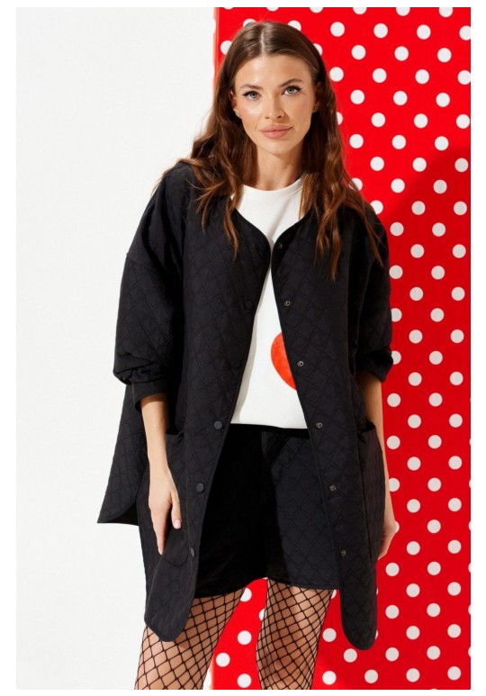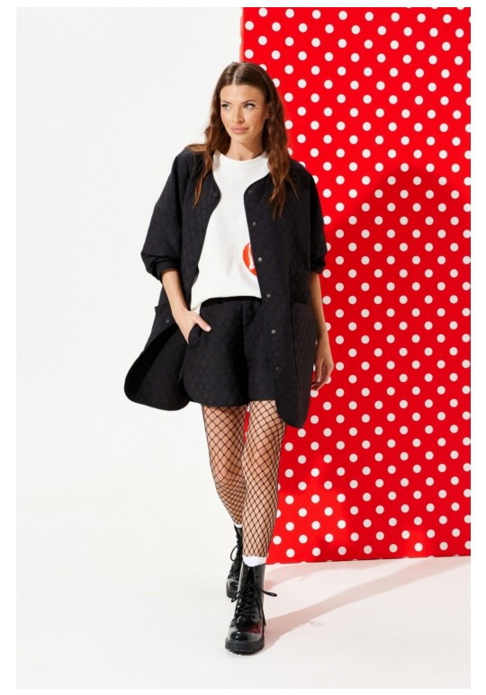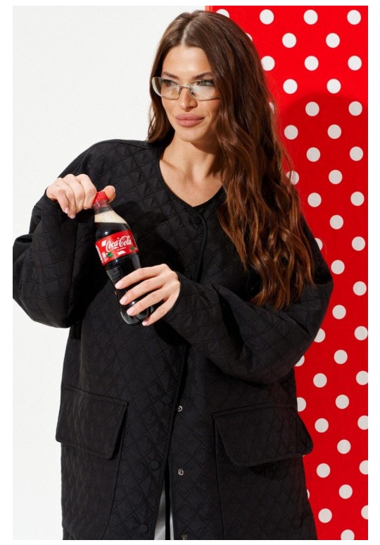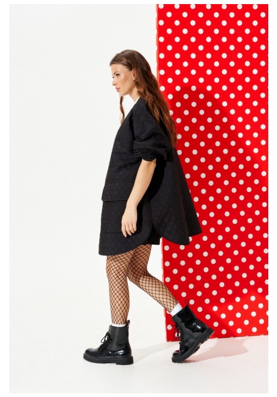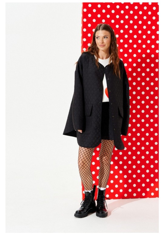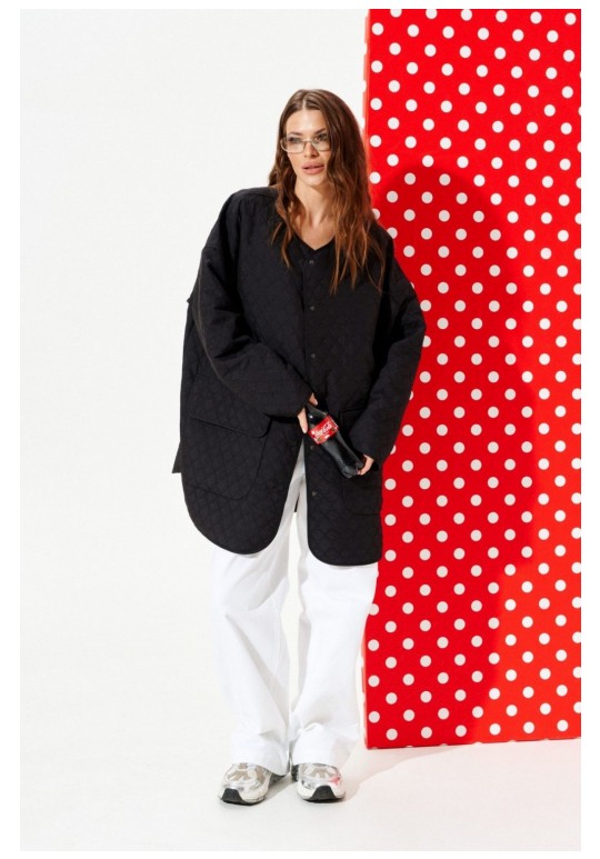 Куртка из стеганой куртачной ткани свободного объема, расширенная к низу, с центральной застежкой на кнопки. Детали переда с накладными карманами с клапанами. Спинка цельная с настрочными нашивками Цветок и Сердце. Линия низа фигурная. Рукав втачной, длинный. Горловина, борт, нижний срез куртки и рукава обработаны окантовочной бейкой.