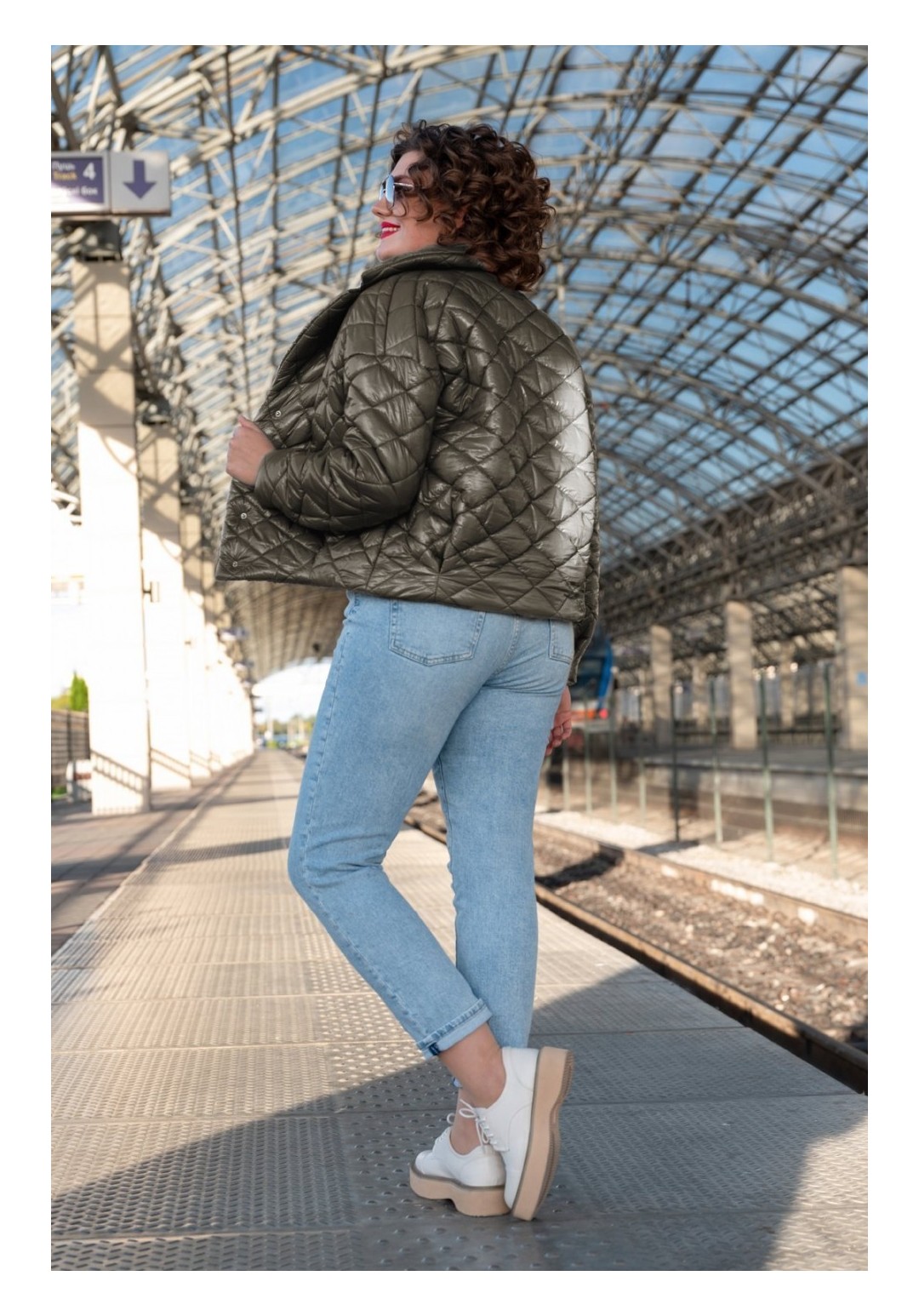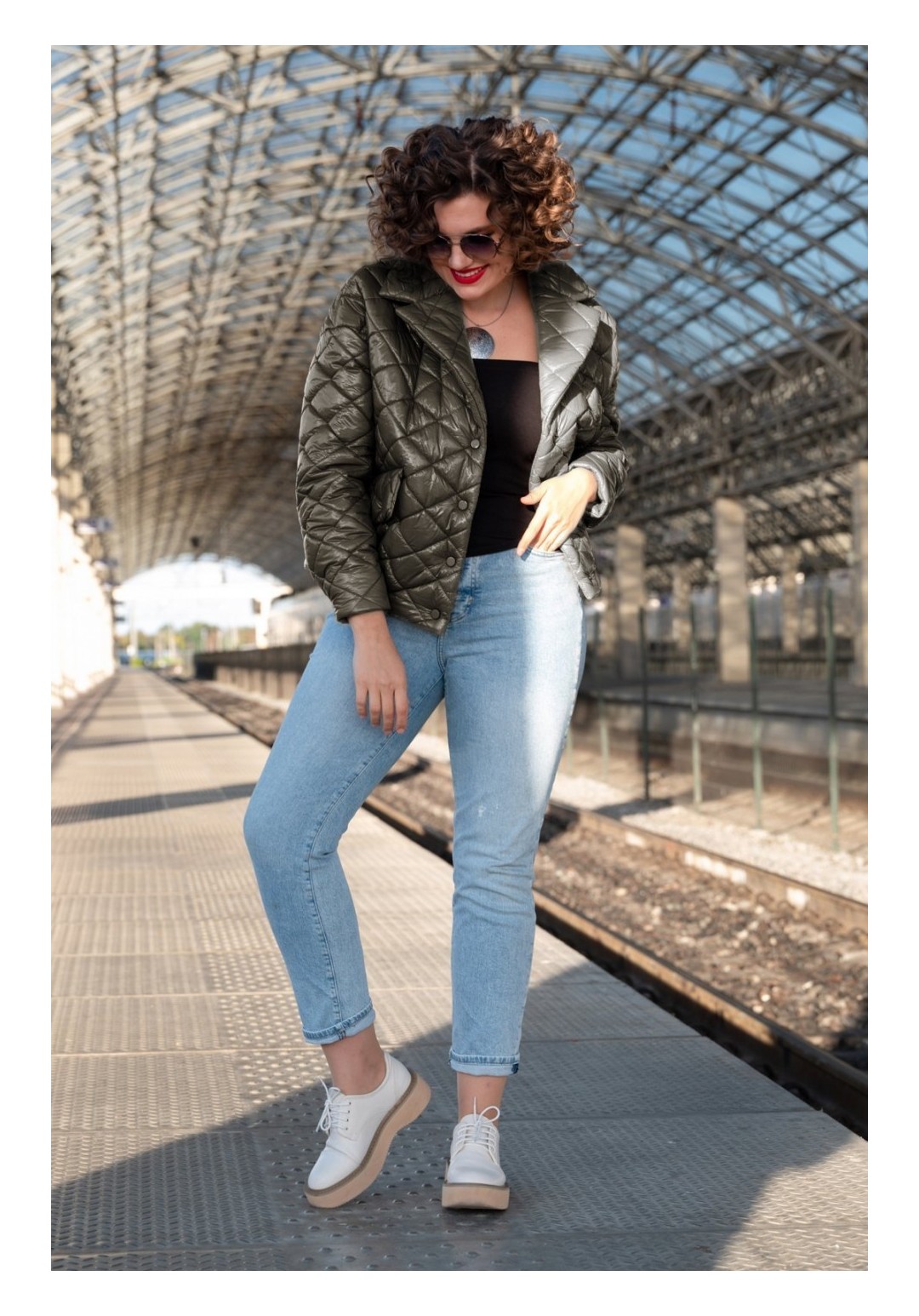 Стёганная куртка на утеплителе, сезонность - демисезон, покрытие материала верха ЛАКЭ. Рукав втачной на спущенной пройме. Застежка на кнопки спереди, на переде объемные накладные карманы. Длина 60 см, рукав 63 см.