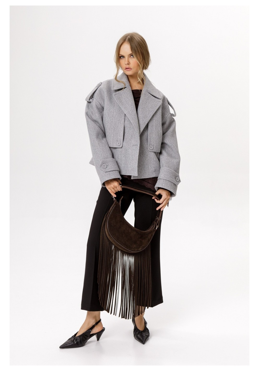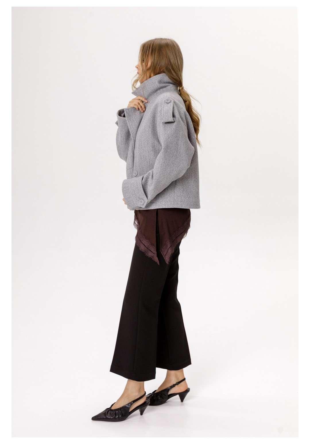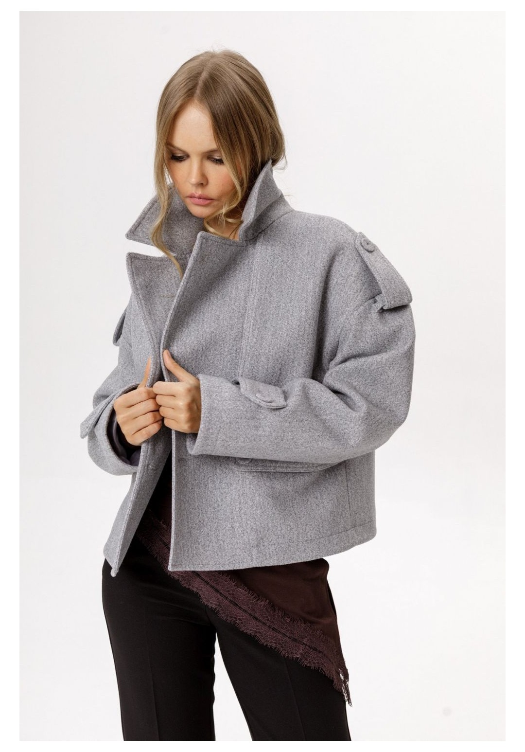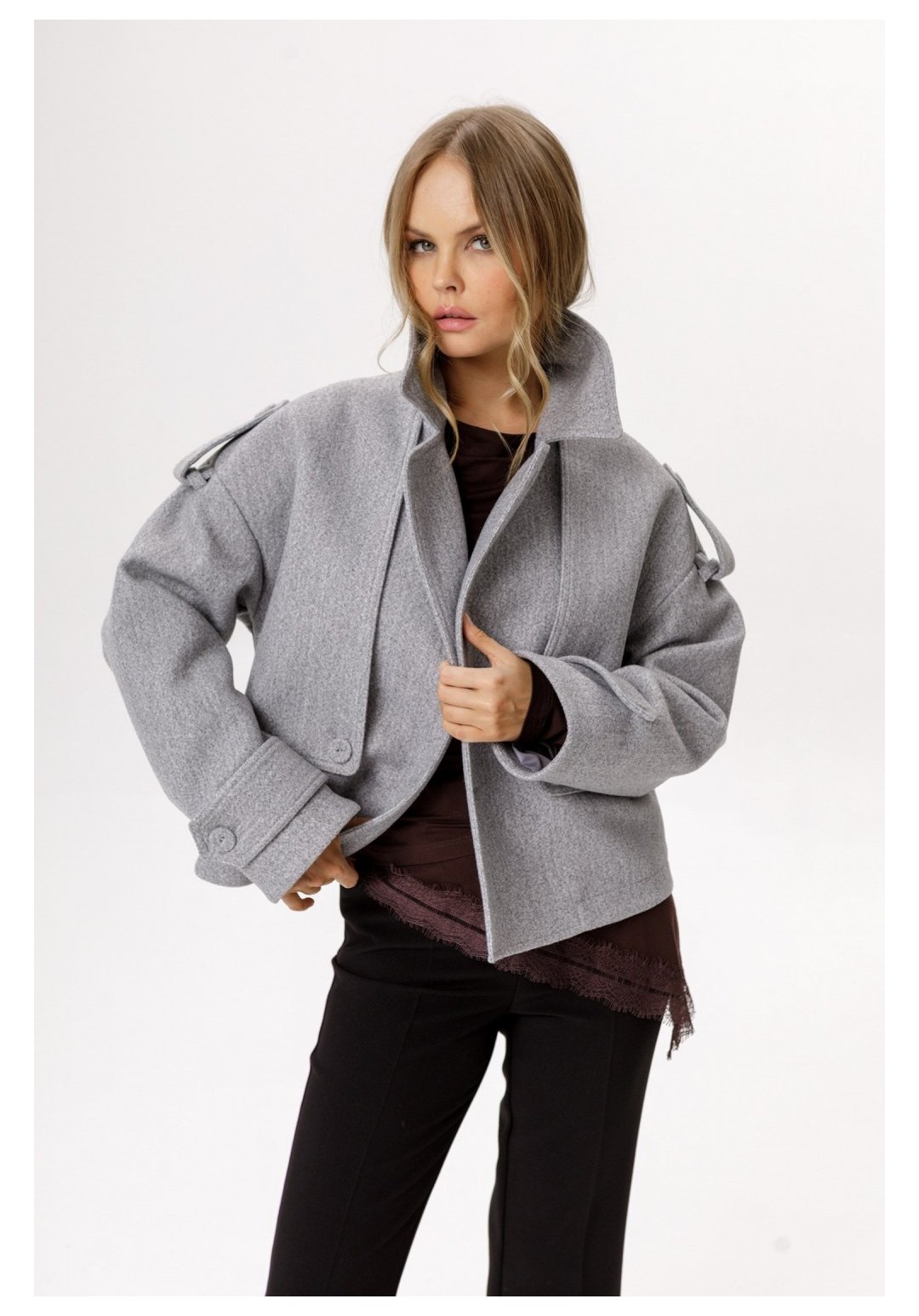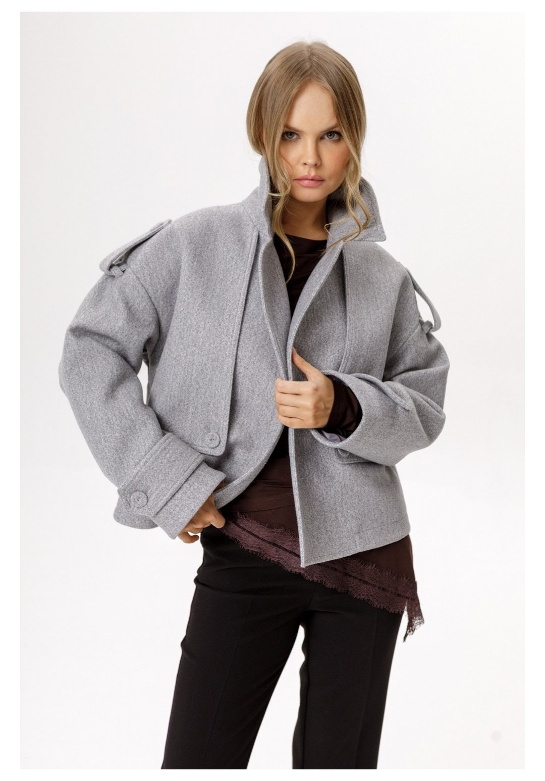Свободный укороченный тренчкот из пальтовой ткани. Детали: спущенная линия плеча, отлетные кокетки переда, застежка на петли и пуговицы, спинка со средним швом, длинные рукава с широкими патами, на подкладке. Длина по спинке около 54,5 см в размерах 40-46 и около 57 см в размерах 48-52, длина рукава+ плечо около 52+10 см.