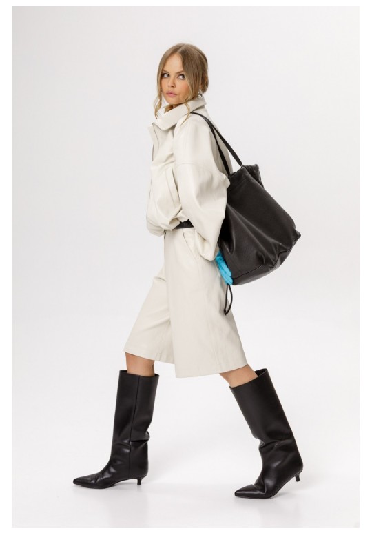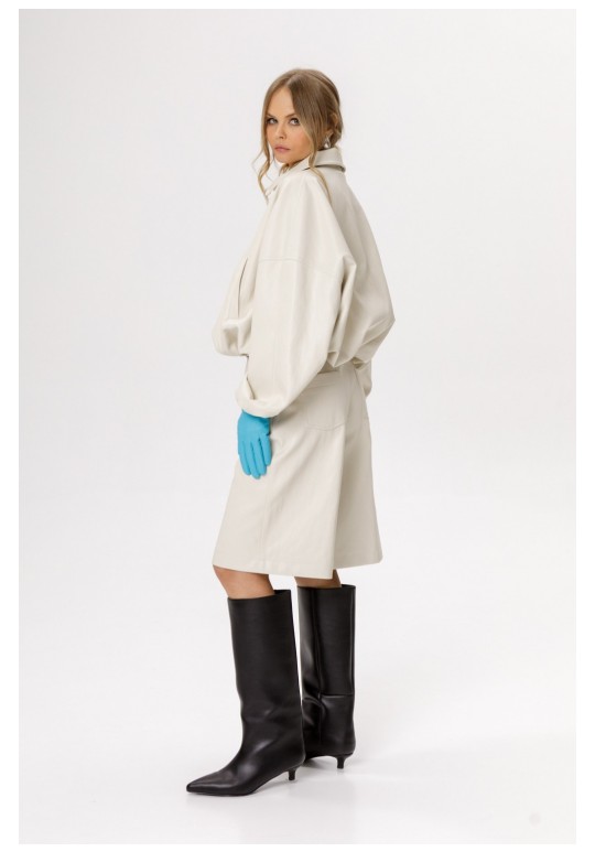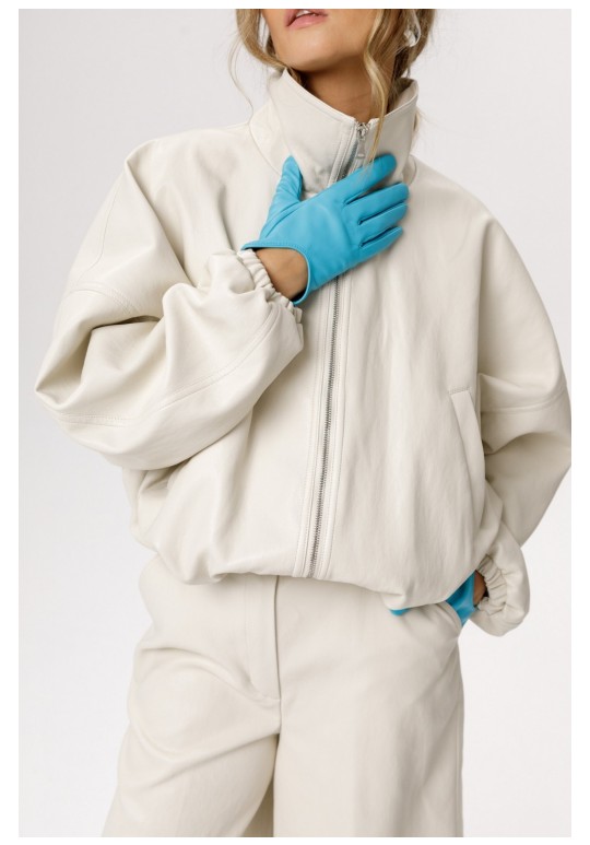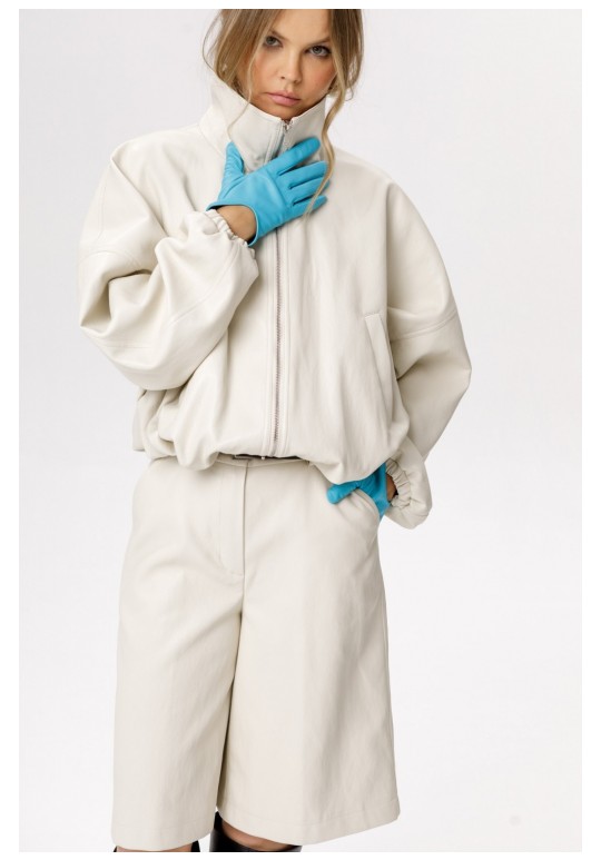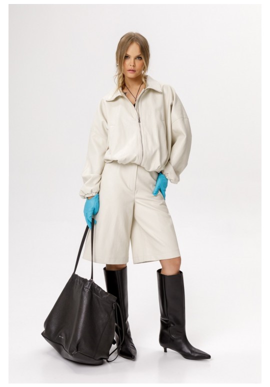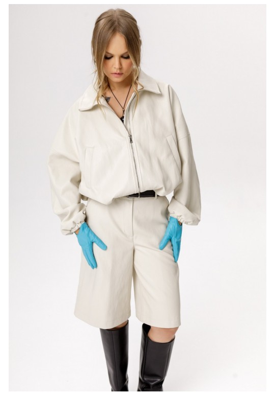 Укороченная куртка-бомбер из экокожи (приобрести шорты-бермуды с фото можно по арт. 6634). Детали: О-силуэт, расширенные плечи, высокий воротник стойка, пояс и манжеты на резинке, застёжка на молнию, функциональные карманы, куртка на подкладке. Длина по спинке около 54 см, длина рукава около 46 см.
