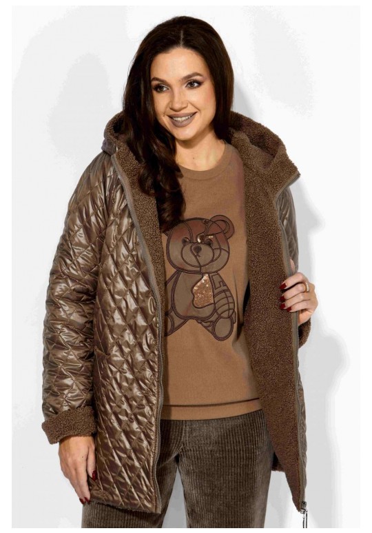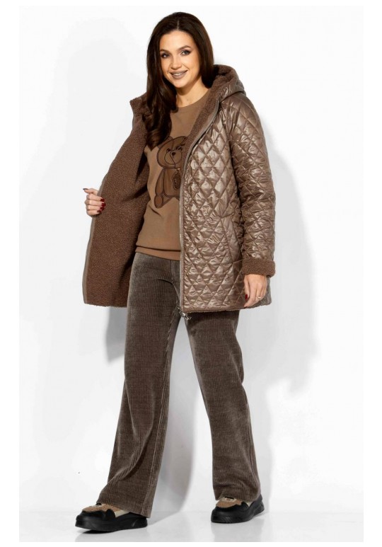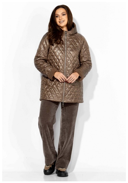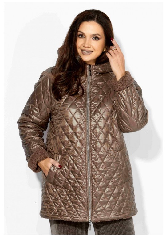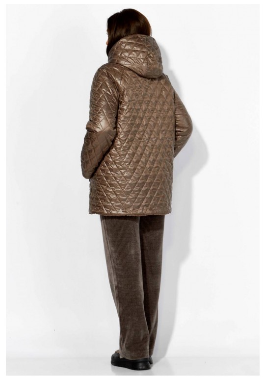 Куртка женская, демисезонная. Верх куртки - плащевка, стеганная на синтепоне. Подкладка - экомех барашек. Куртка прямого силуэта с длинным рукавом реглан. Длина рукава может регулироваться отворотом. По переду центральная застежка на молнию и прорезные, функциональные карманы. Горловина оформлена капюшоном-стойкой по переду.