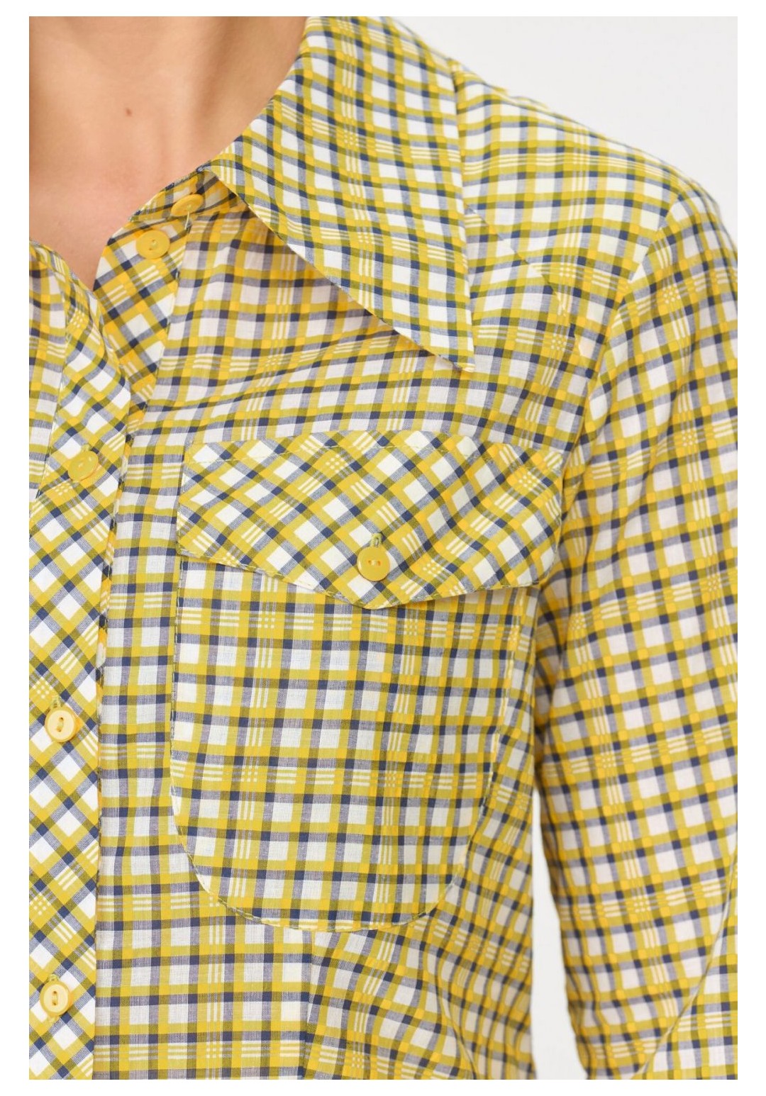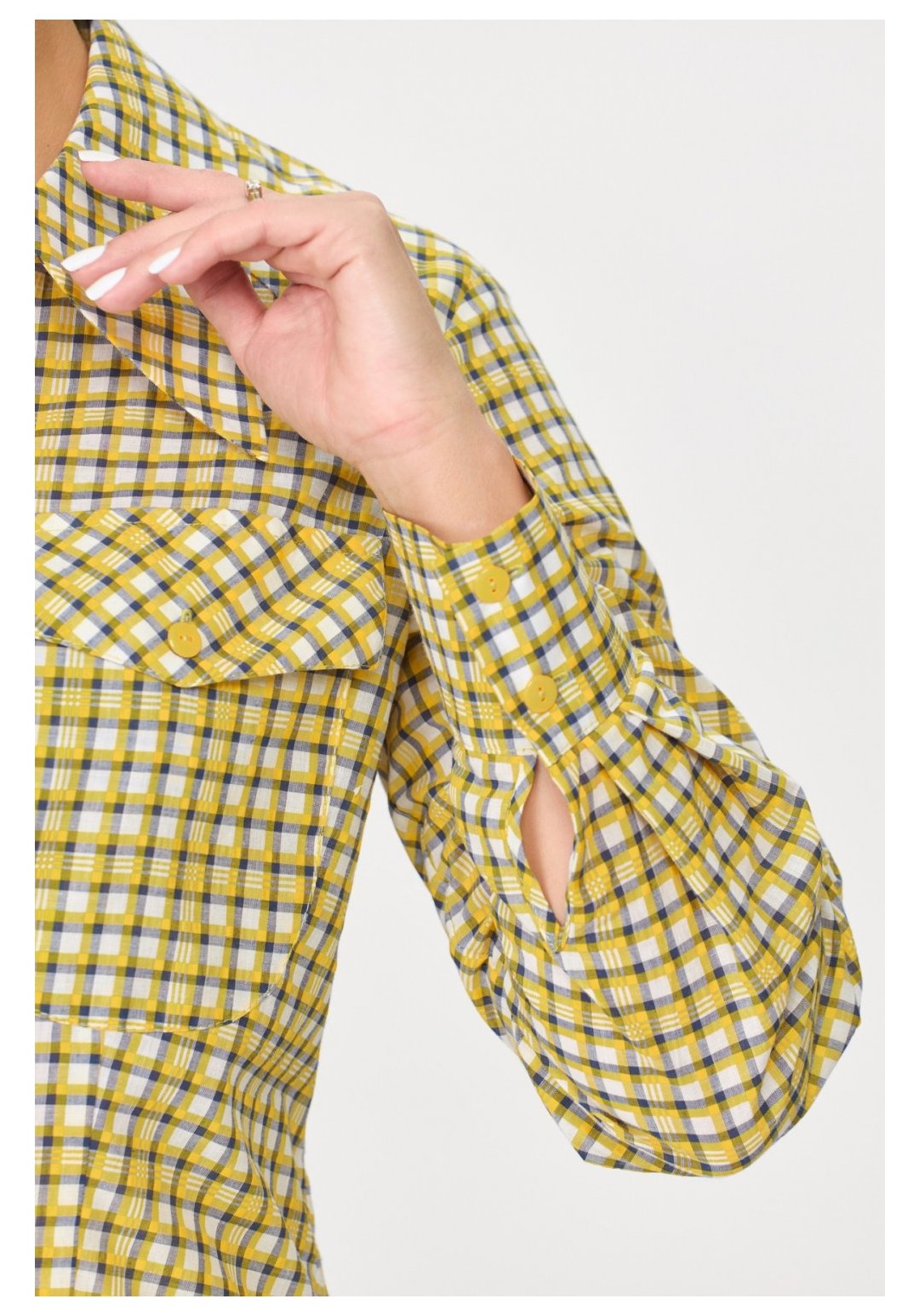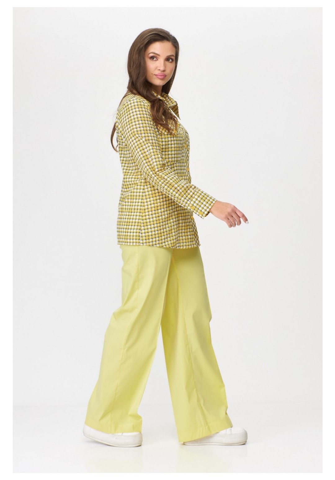 Представляем новинку от белорусского бренда Abbi – женскую рубашку. Рубашка из легкой хлопковой ткани с веселыми летними тонами может украсить ваш гардероб не только летом, но и в любую другую пору года. Рубашка женская из хлопка с принтом клетка, полуприлегающего силуэта, длина ниже линии бедер. По переду и спинке двойная кокетка, воротник втачной большой, стойка отрезная, рукав втачной рубашечный, по низу рукава широкий манжет с застежкой на две петли и две пуговицы. По переду талиевые вытачки, два больших накладных кармана округлой формы, два клапана с застежкой на петлю и пуговицу. Застежка центральная на отрезной планке, нить основы планки под углом 45 градусов,на 7 петель и 7 пуговиц. В образе во время съемки мы использовали брюки нашего бренда под артикулом 2009. Рубашка может быть, как повседневной, так и украсить вас и ваш офис на работе. Замеры: Рост фотомодели – 170 см. Размер фотомодели – 48. ОГ-объем груди; ОТ-объем талии; ОБ-объем бедер; ДИ-длина изделия; ДР-длина рукава. Размер 44 ОГ-92; ОТ-88; ОБ-100; ДИ-67; ДР-59 Размер 46 ОГ-96; ОТ-92; ОБ-104; ДИ-67; ДР-59 Размер 48 ОГ-100; ОТ-96; ОБ-108; ДИ-68; ДР-60 Размер 50 ОГ-104; ОТ-100; ОБ-112; ДИ-68; ДР-60 Размер 52 ОГ-108; ОТ-104; ОБ-116; ДИ-69; ДР-61 Размер 54 ОГ-112; ОТ-108; ОБ-120; ДИ-69; ДР-61