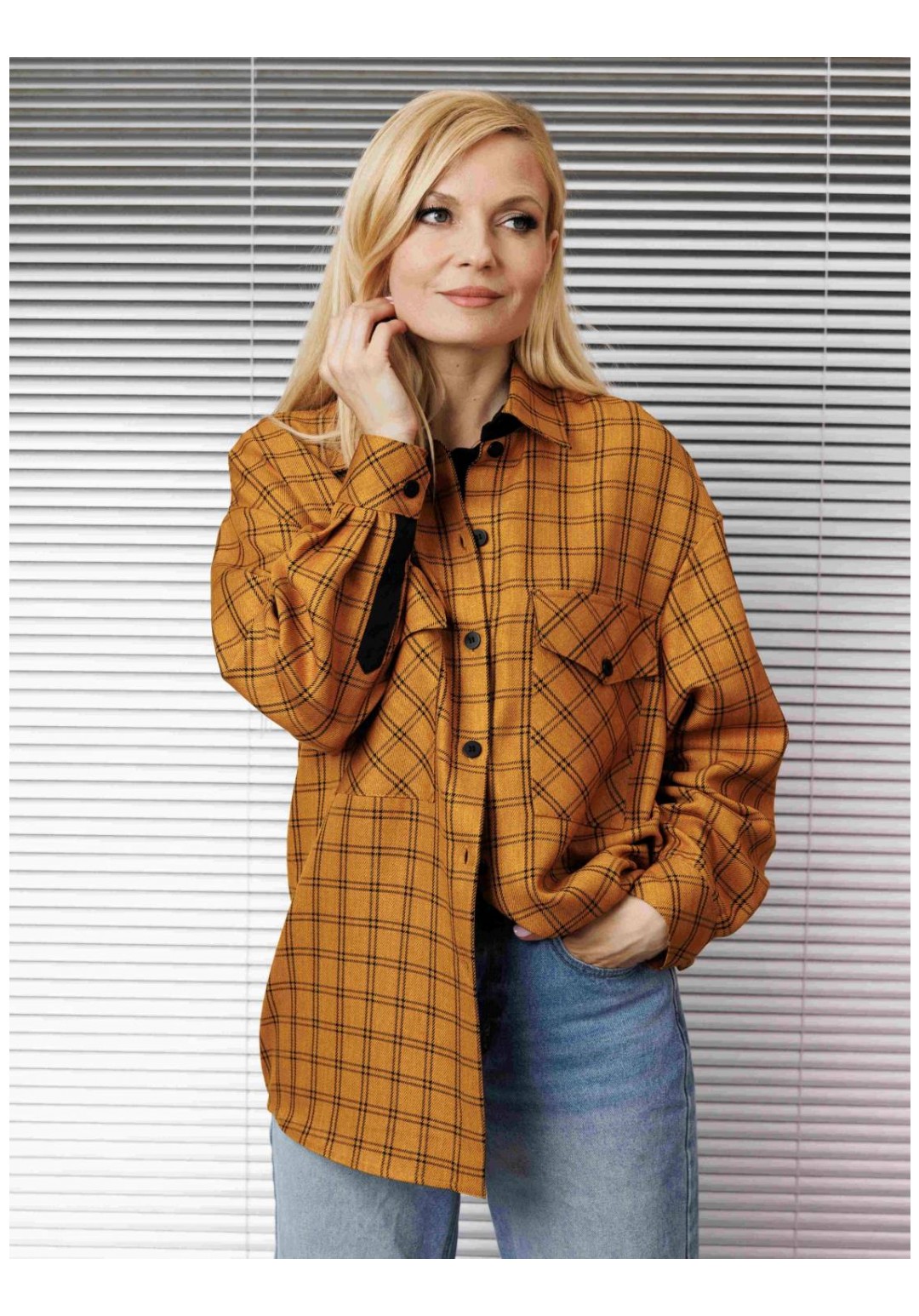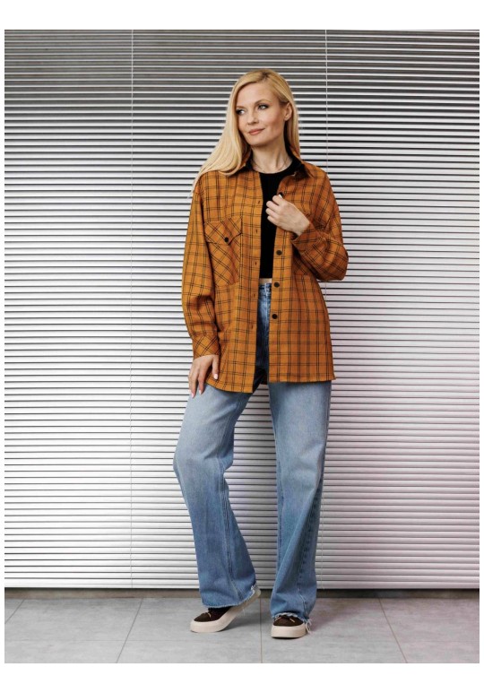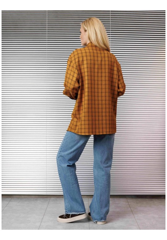 Блузка женская свободного покроя со спущенной и углублённой проймой и втачным рукавом с манжетой по низу рукава. По переду накладные карманы по линии груди, воротник рубашечный на стойке, застёжка спереди на петли и пуговицы.Низ изделия фигурный.