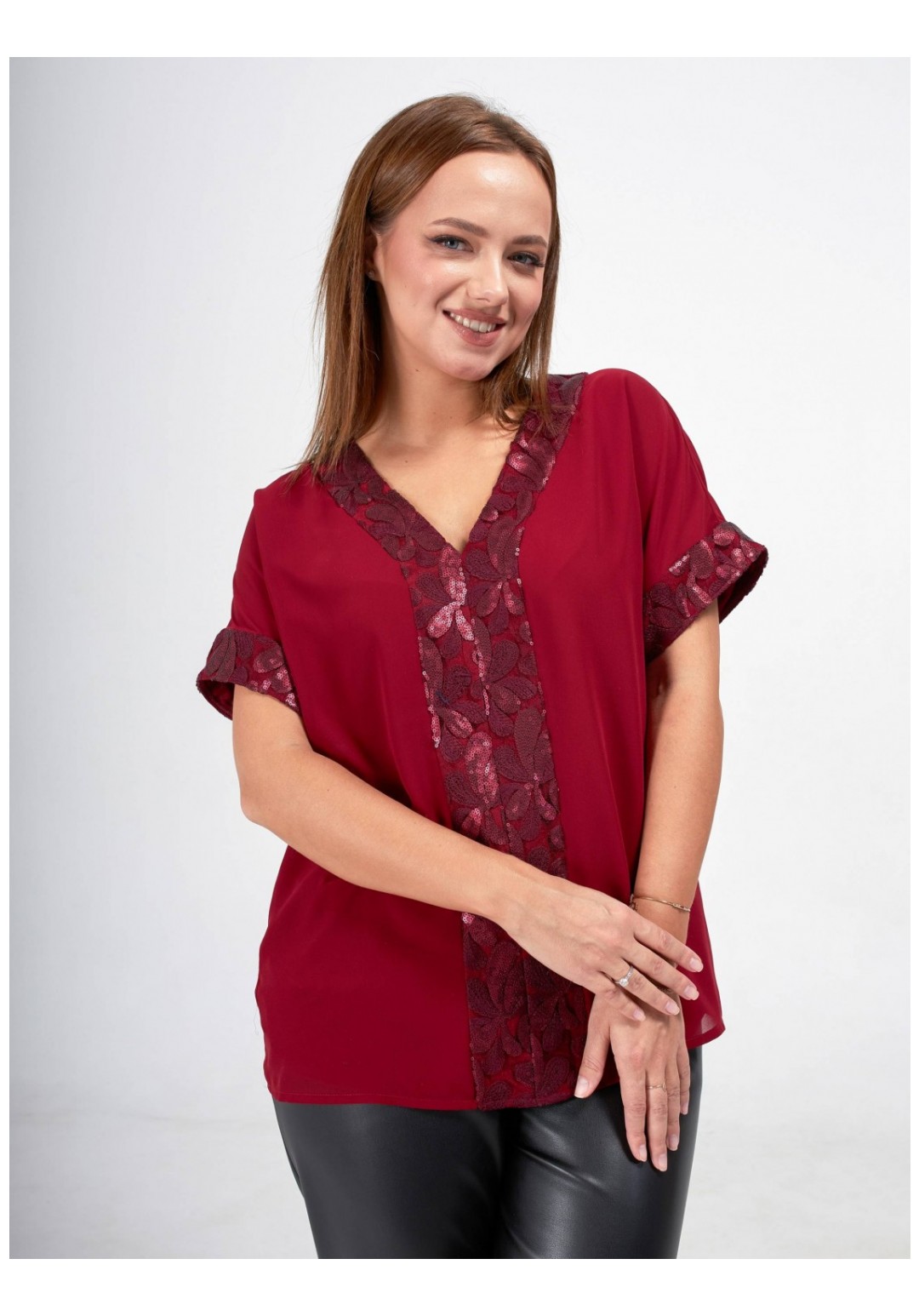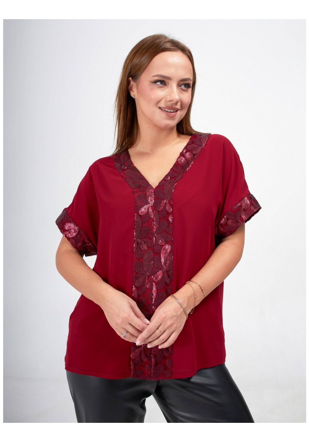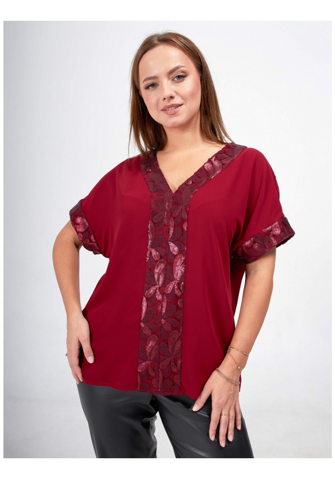 Стильная блузка больших размеров станет прекрасным дополнением вашего гардероба! Эта элегантная блузка выполнена из двухслойного шифона, что придаёт ей легкость и воздушность. Свободный крой обеспечивает комфорт и свободу движений. Короткий рукав придает блузке легкость и удобство. Особое внимание привлекает отделка из изысканного кружева с пайетками, которая добавляет блеска и утонченности. Эта блузка легко комбинируется с различными стилями одежды, будь то повседневный или более нарядный образ. Создайте свой уникальный стиль с этой великолепной блузкой, которая подчеркнёт вашу индивидуальность и сделает вас центром внимания!